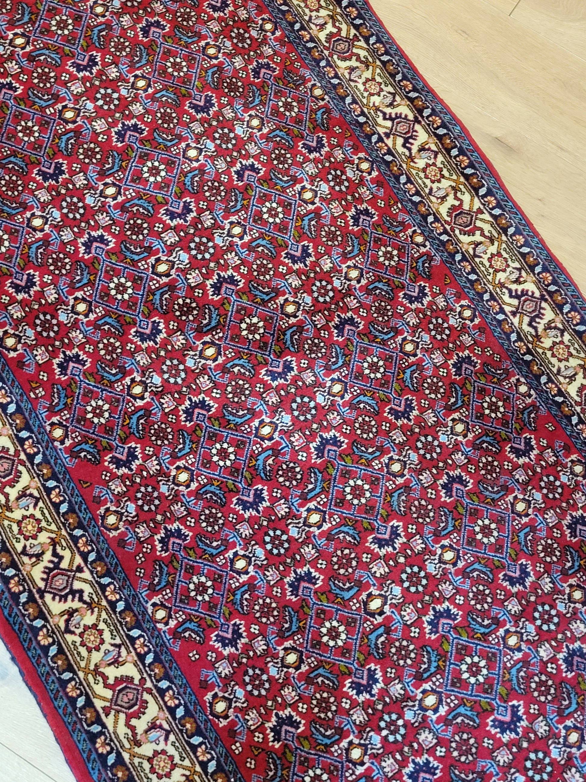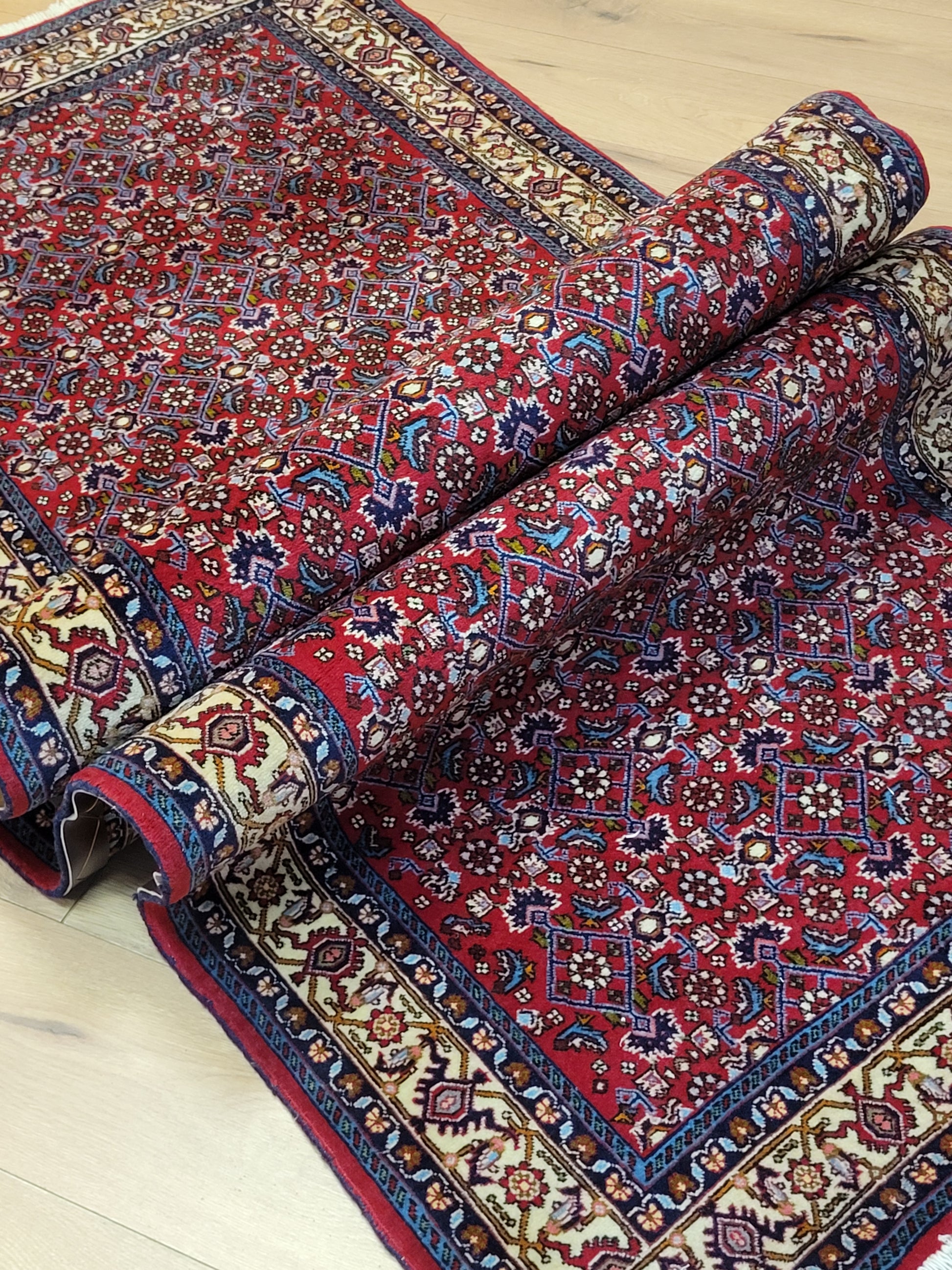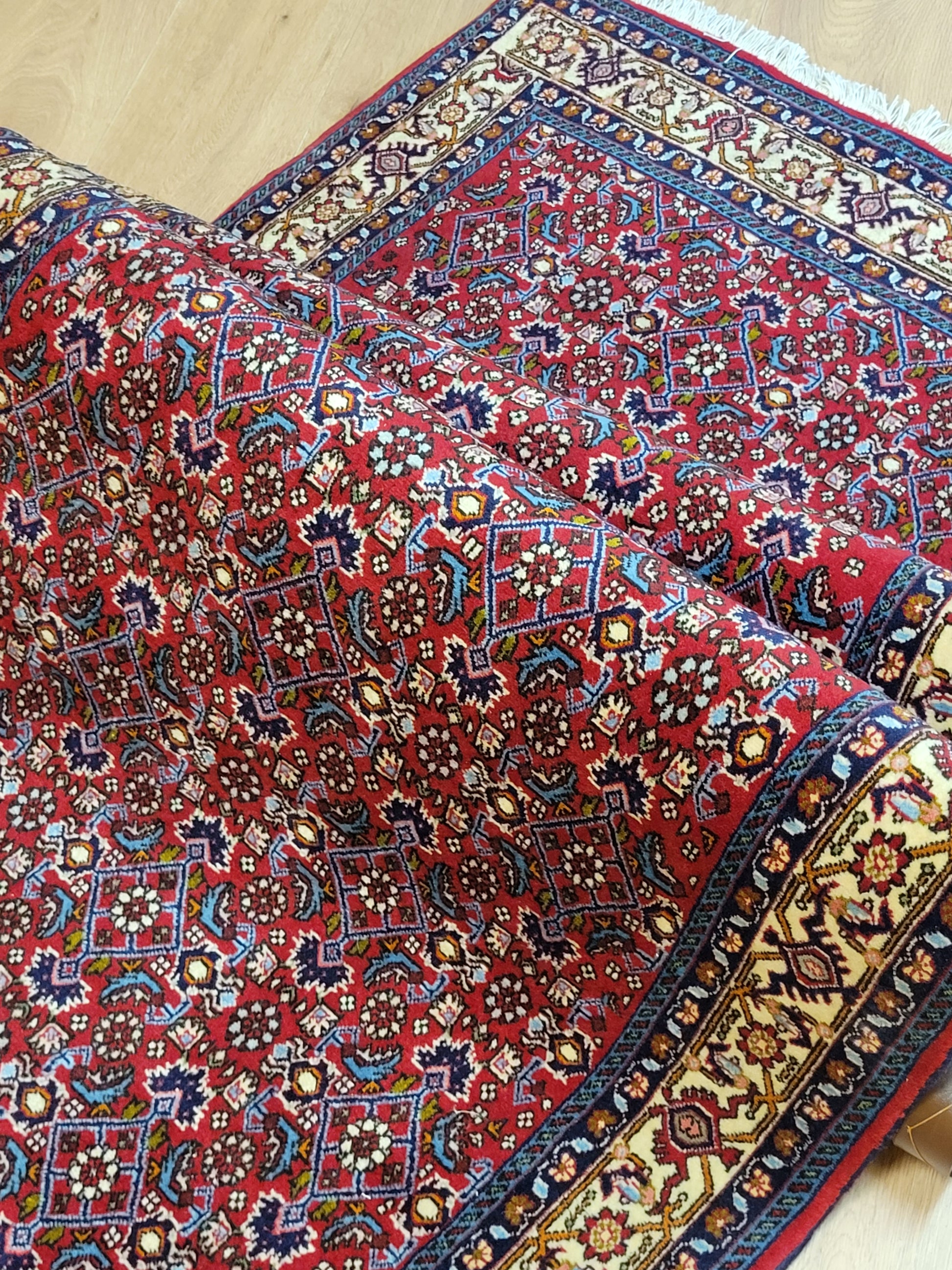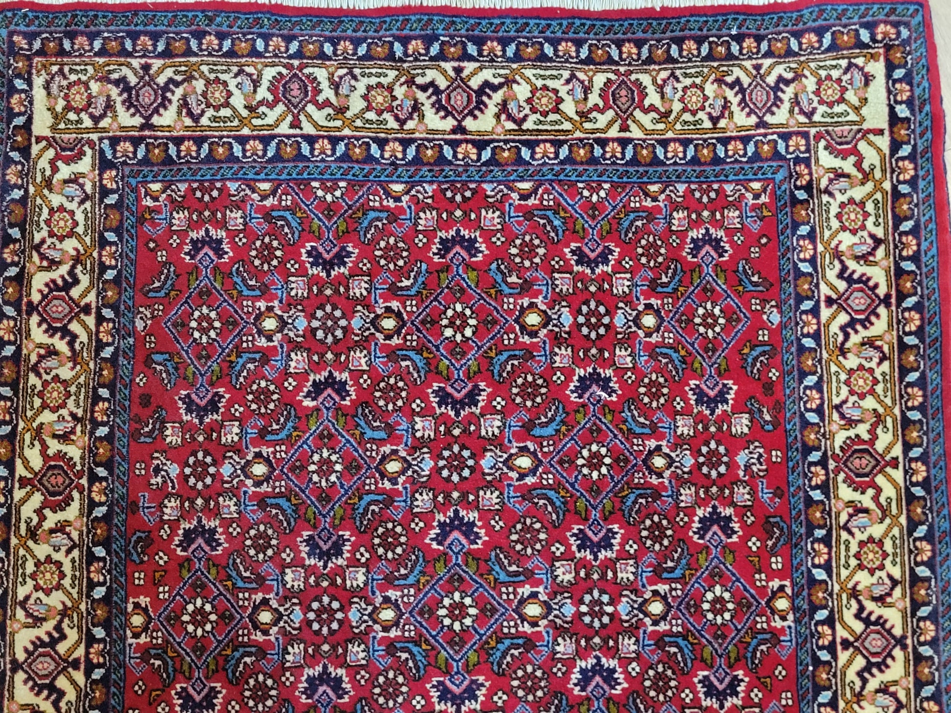 angeboten wird ein klassischer Bidjar Perserteppich, handgeknüpft aus hochwertiger Korkwolle. Das dichte, fein gearbeitete Allover-Muster mit kleinen floralen Motiven und geometrischen Elementen ist typisch für die traditionsreiche Knüpfkunst aus Bidjar und zeichnet sich durch eine besonders langlebige Verarbeitung aus.