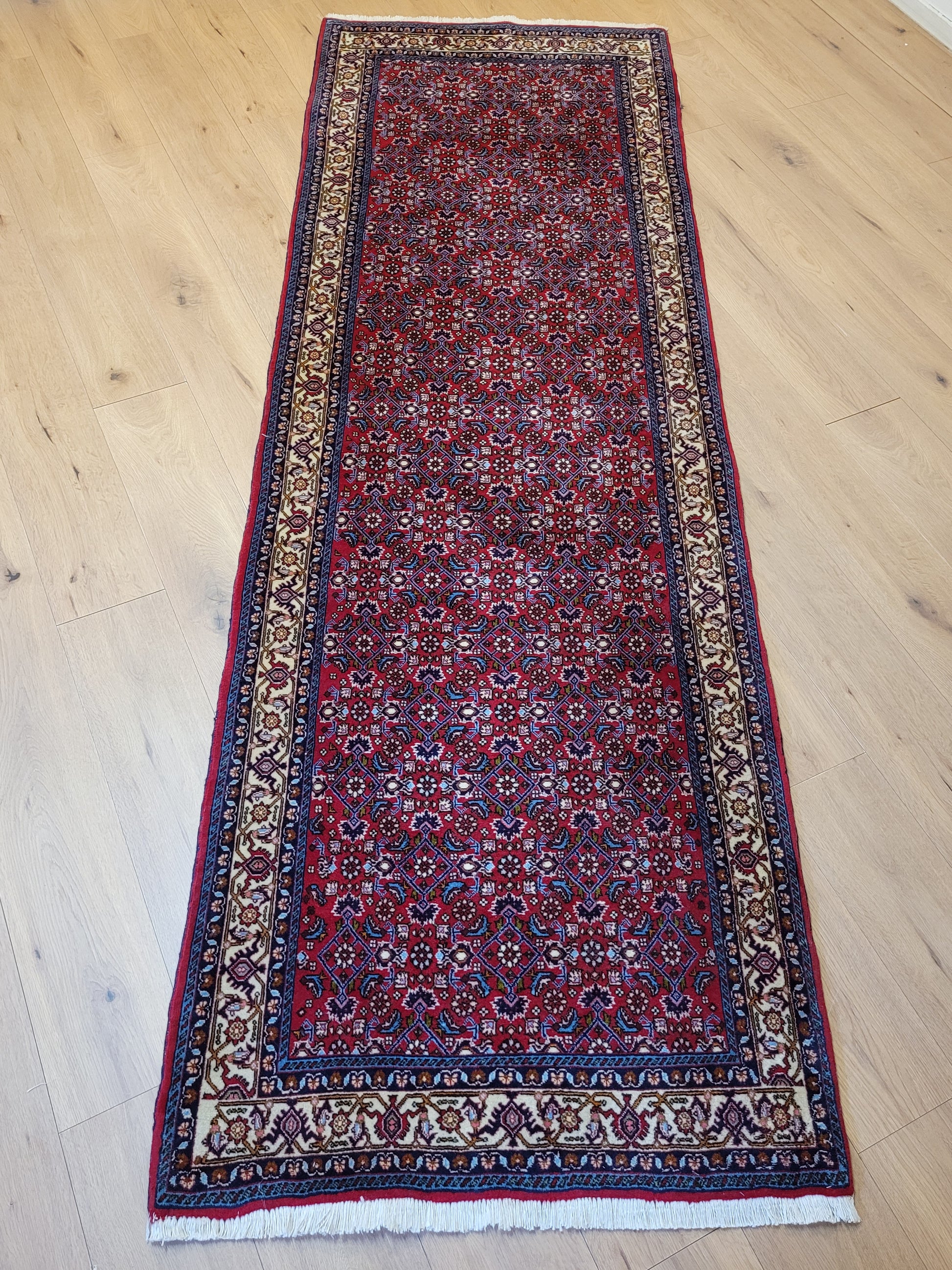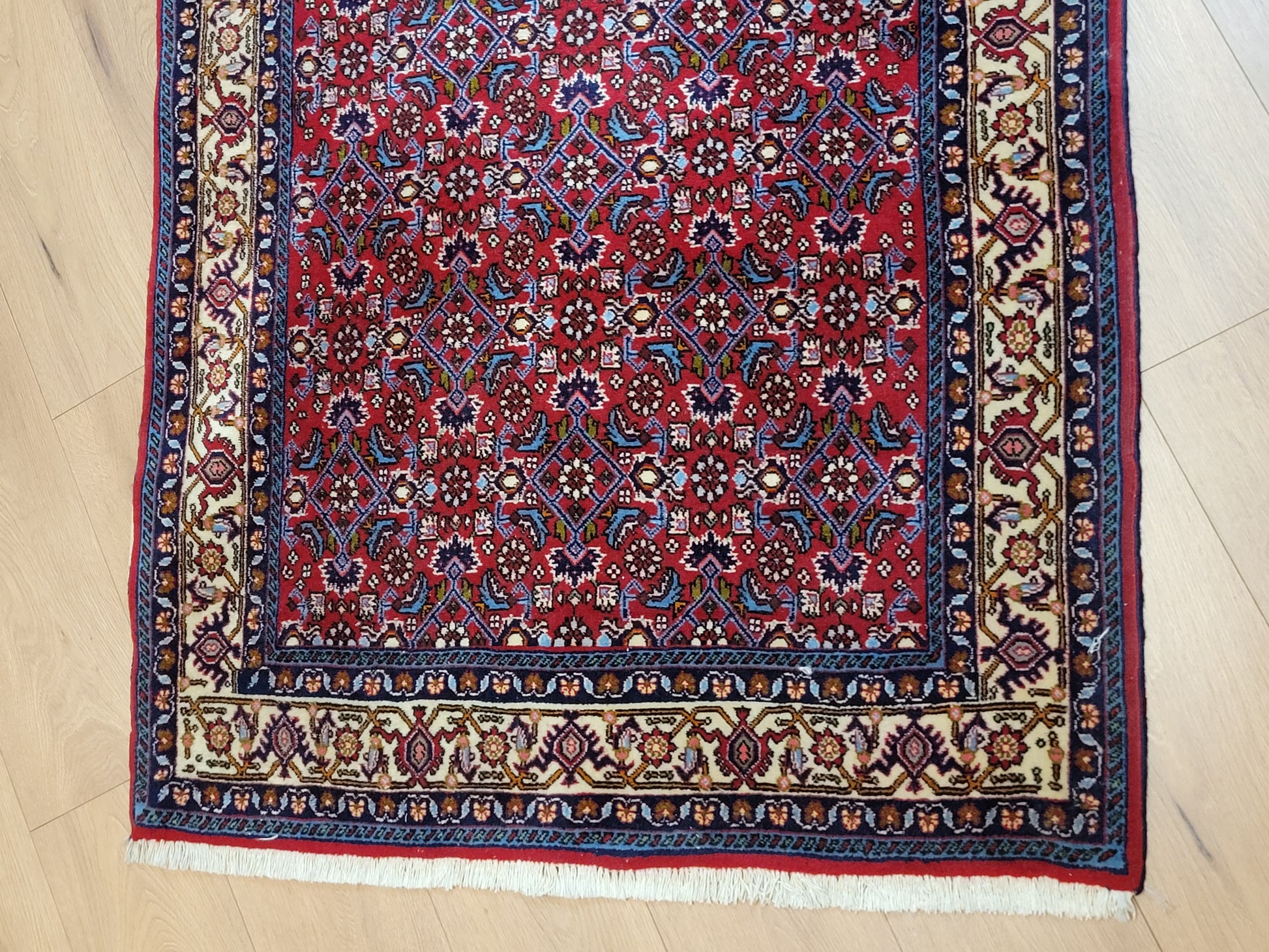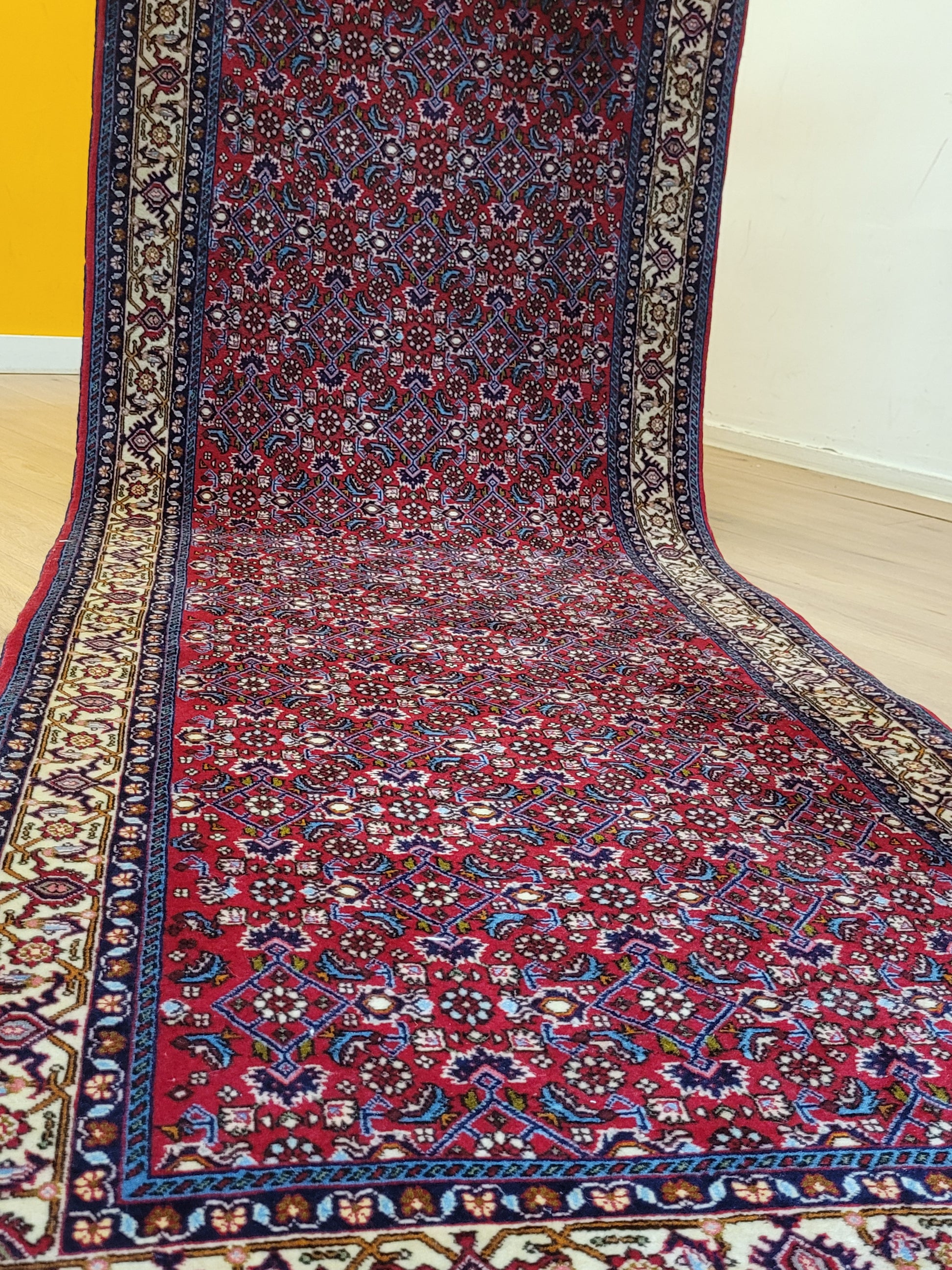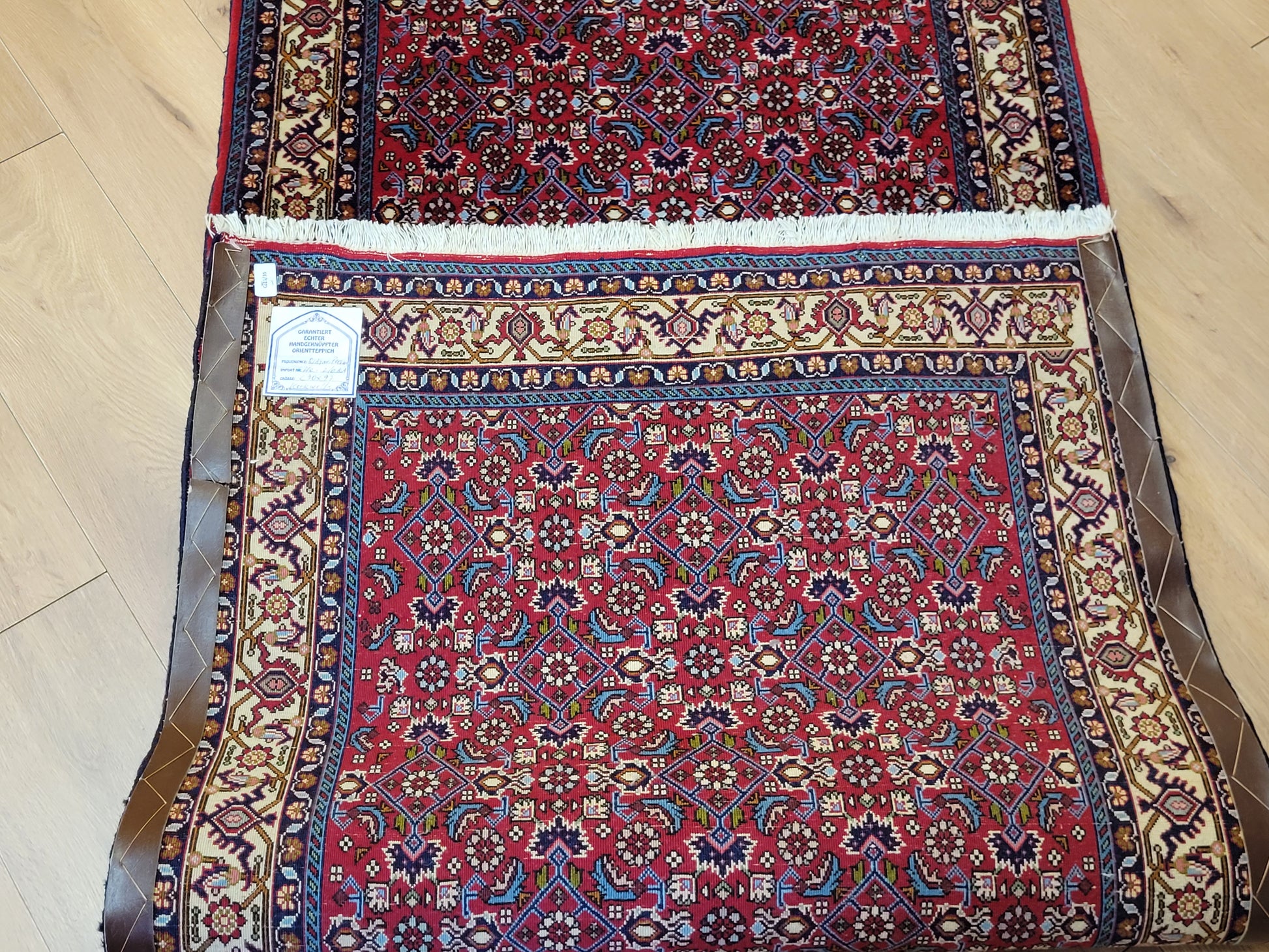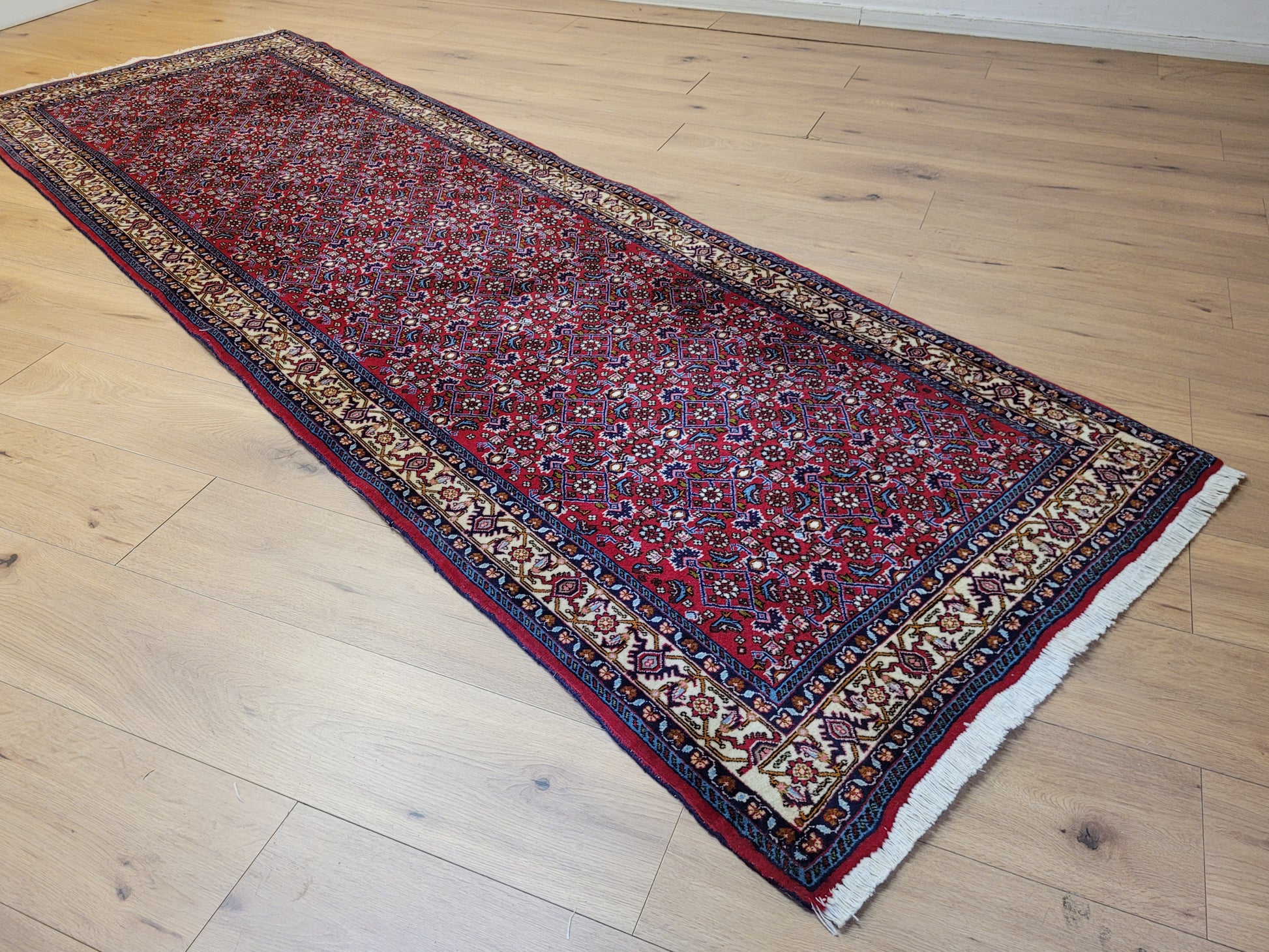 angeboten wird ein klassischer Bidjar Perserteppich, handgeknüpft aus hochwertiger Korkwolle. Das dichte, fein gearbeitete Allover-Muster mit kleinen floralen Motiven und geometrischen Elementen ist typisch für die traditionsreiche Knüpfkunst aus Bidjar und zeichnet sich durch eine besonders langlebige Verarbeitung aus.