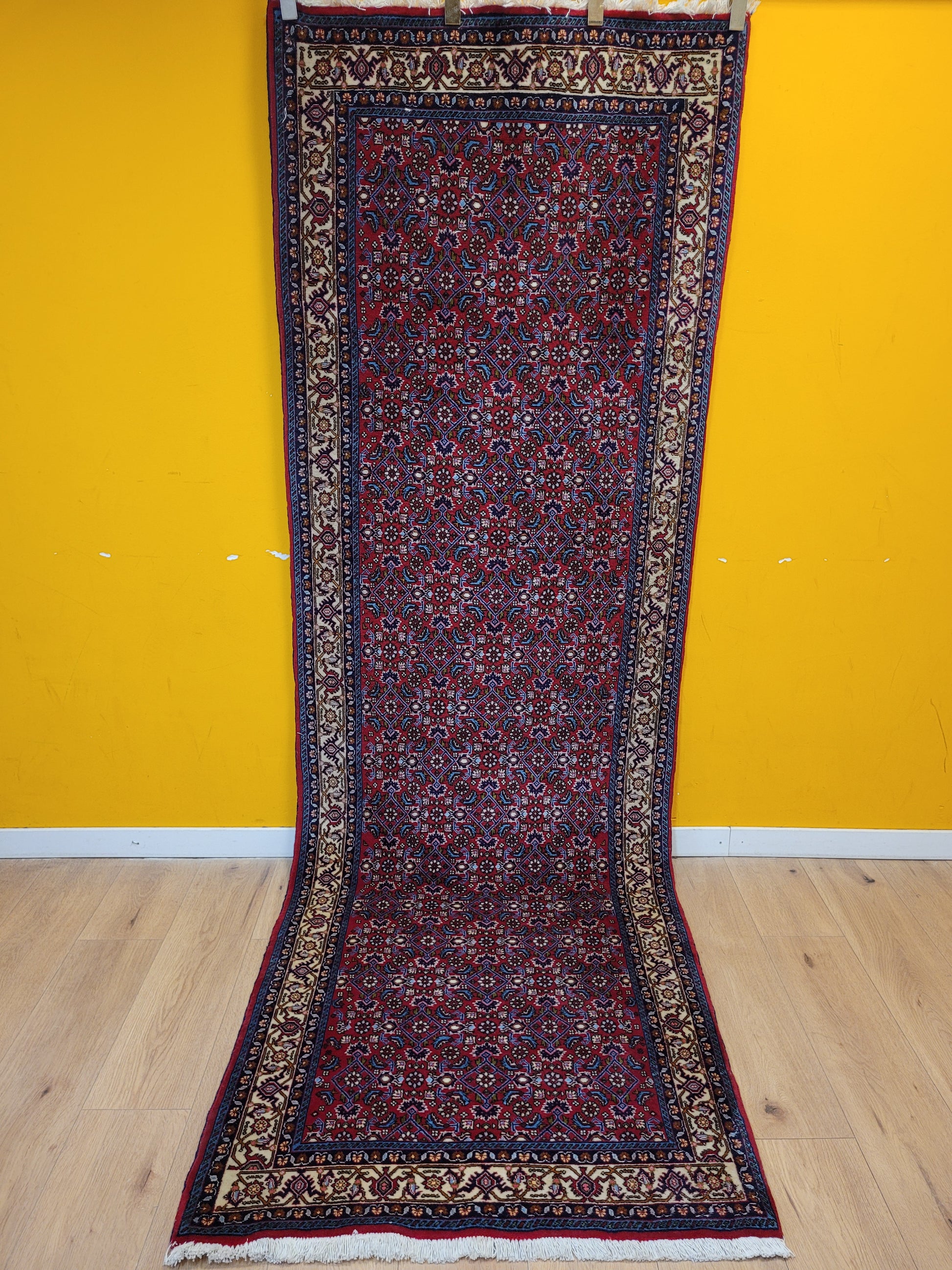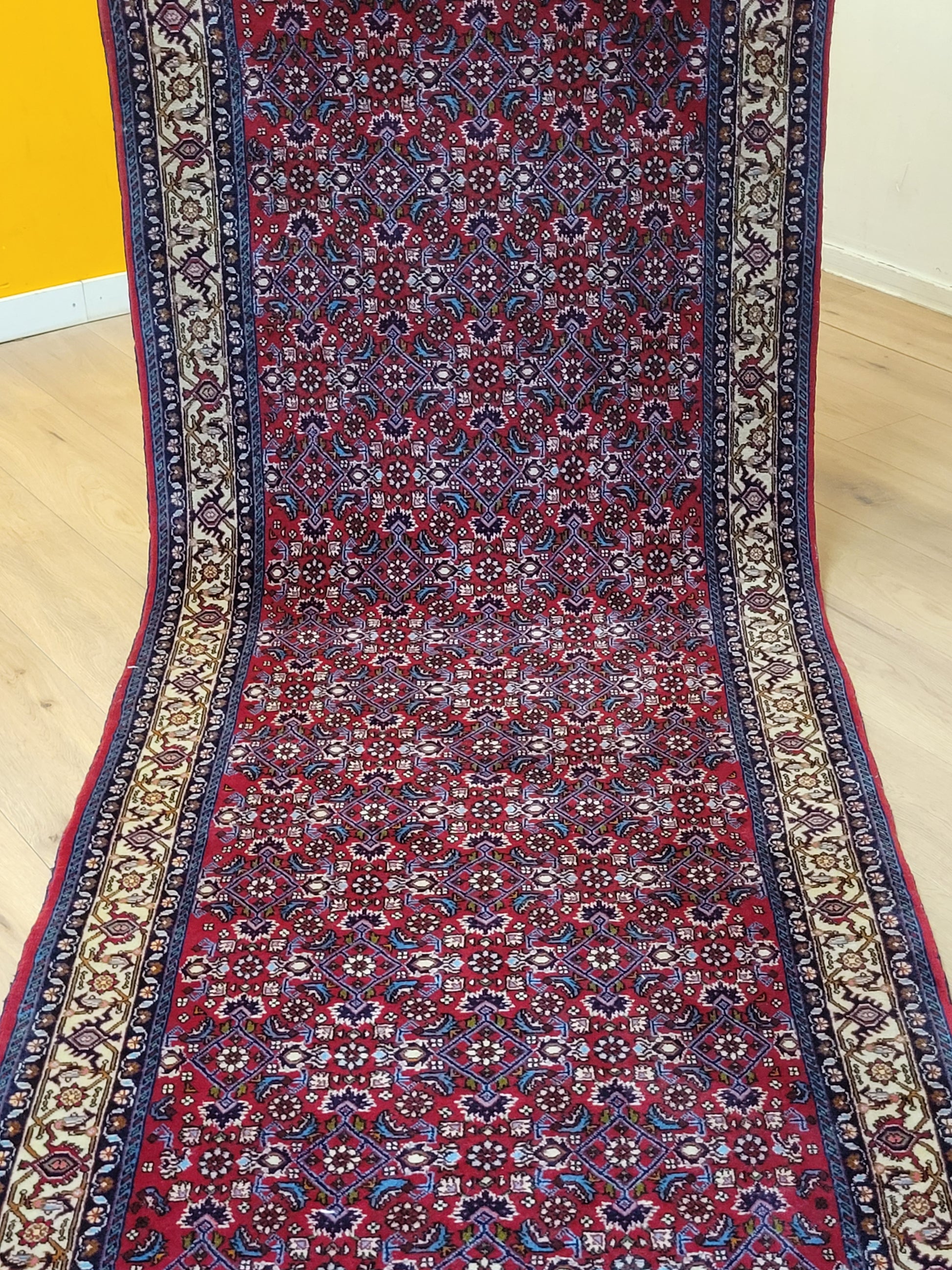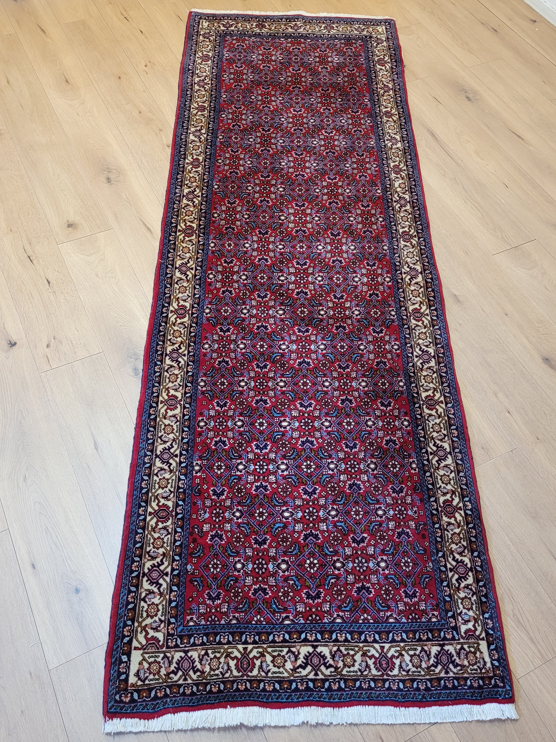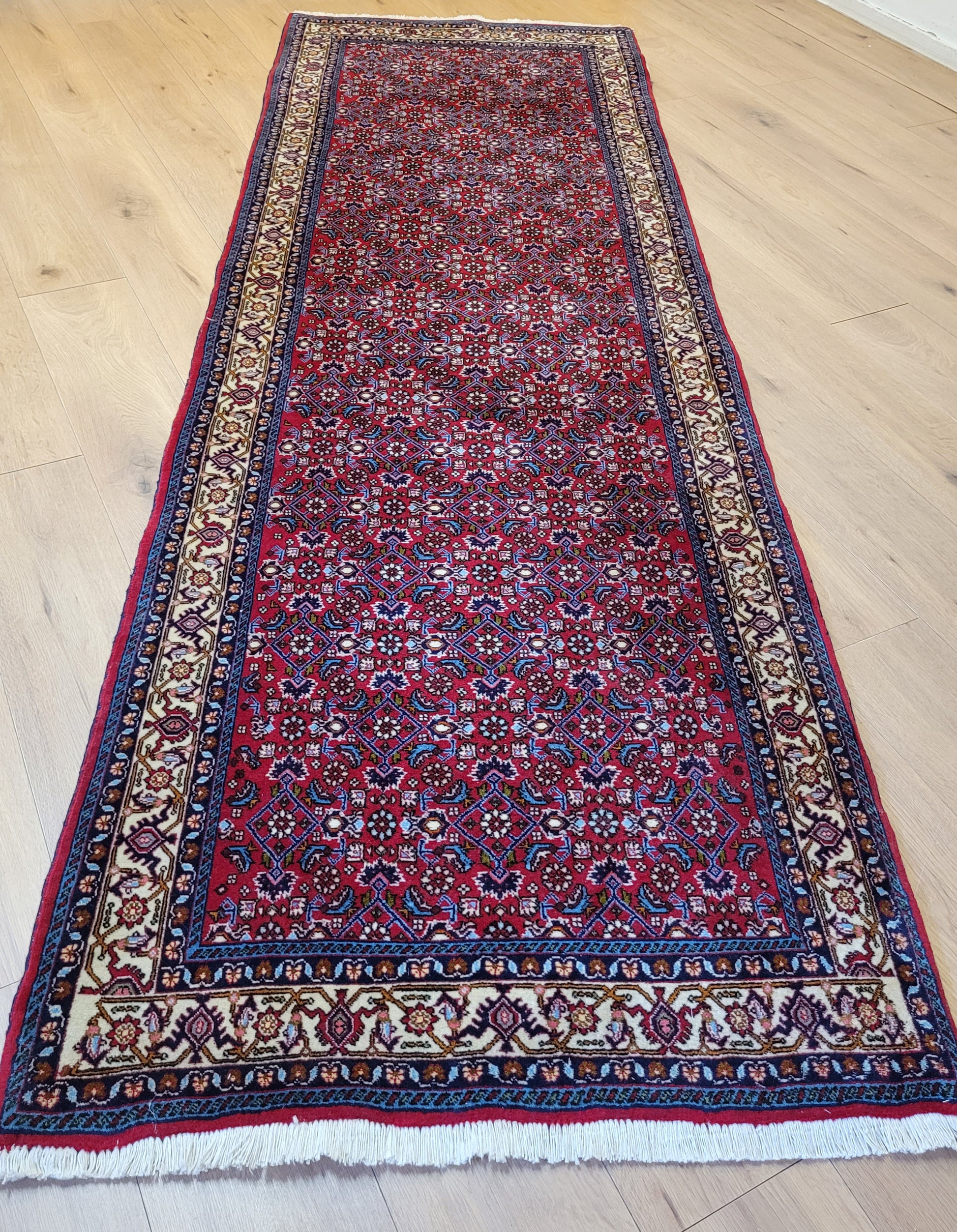 angeboten wird ein klassischer Bidjar Perserteppich, handgeknüpft aus hochwertiger Korkwolle. Das dichte, fein gearbeitete Allover-Muster mit kleinen floralen Motiven und geometrischen Elementen ist typisch für die traditionsreiche Knüpfkunst aus Bidjar und zeichnet sich durch eine besonders langlebige Verarbeitung aus.