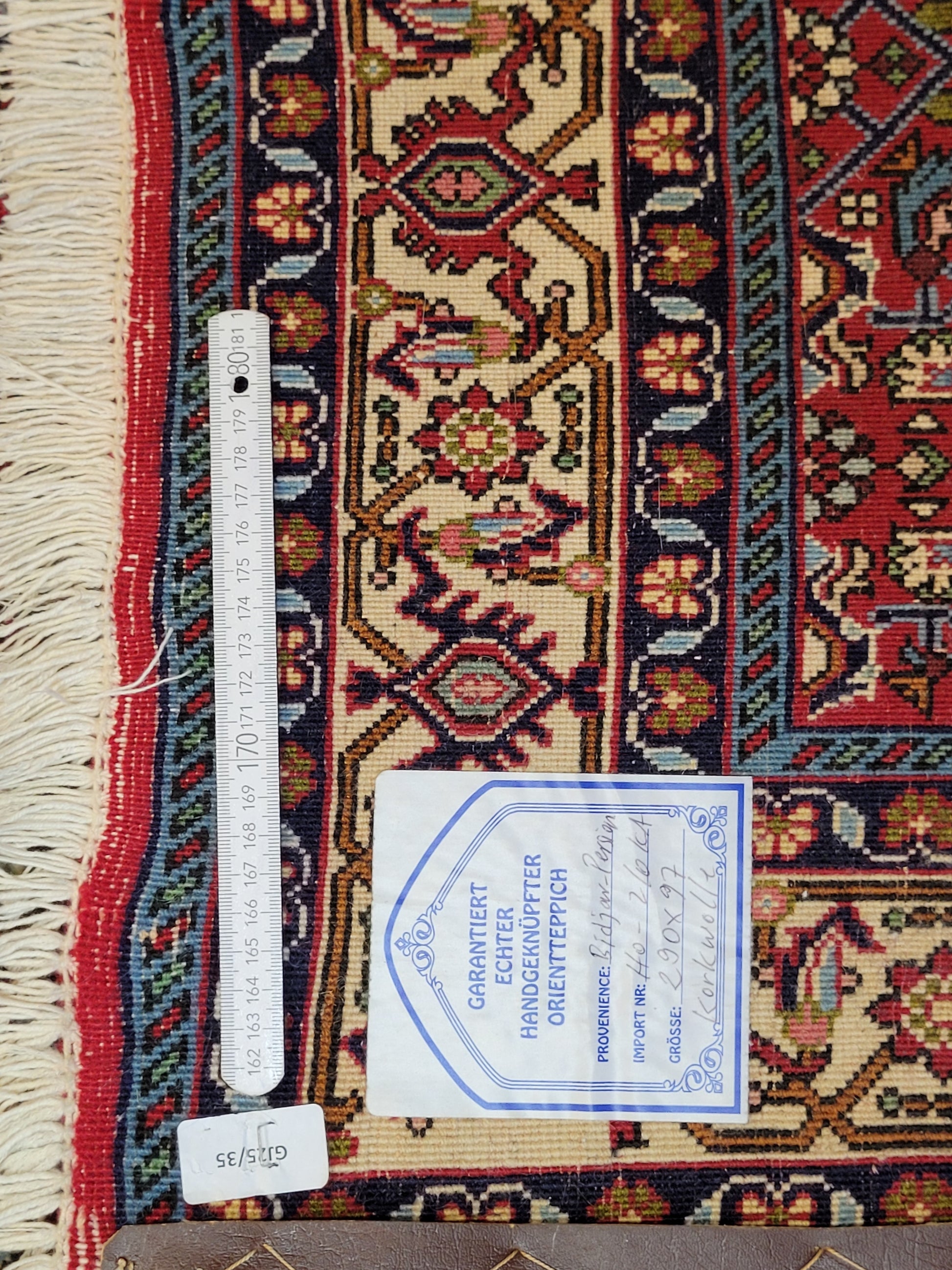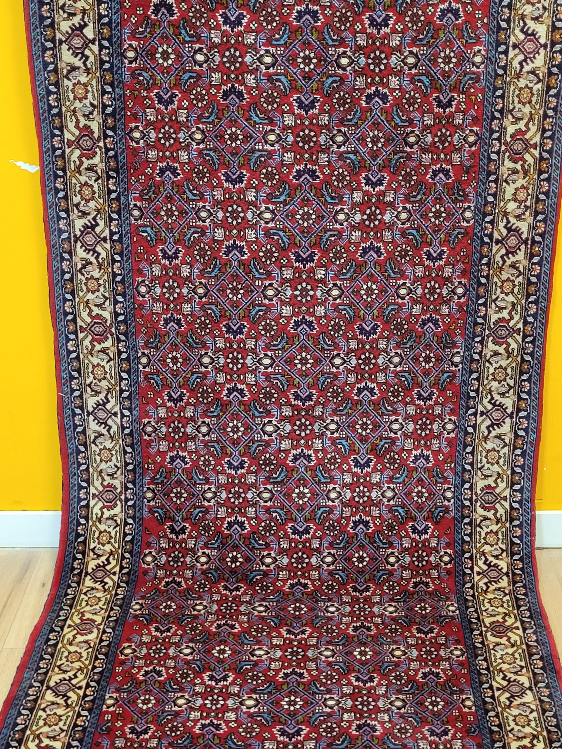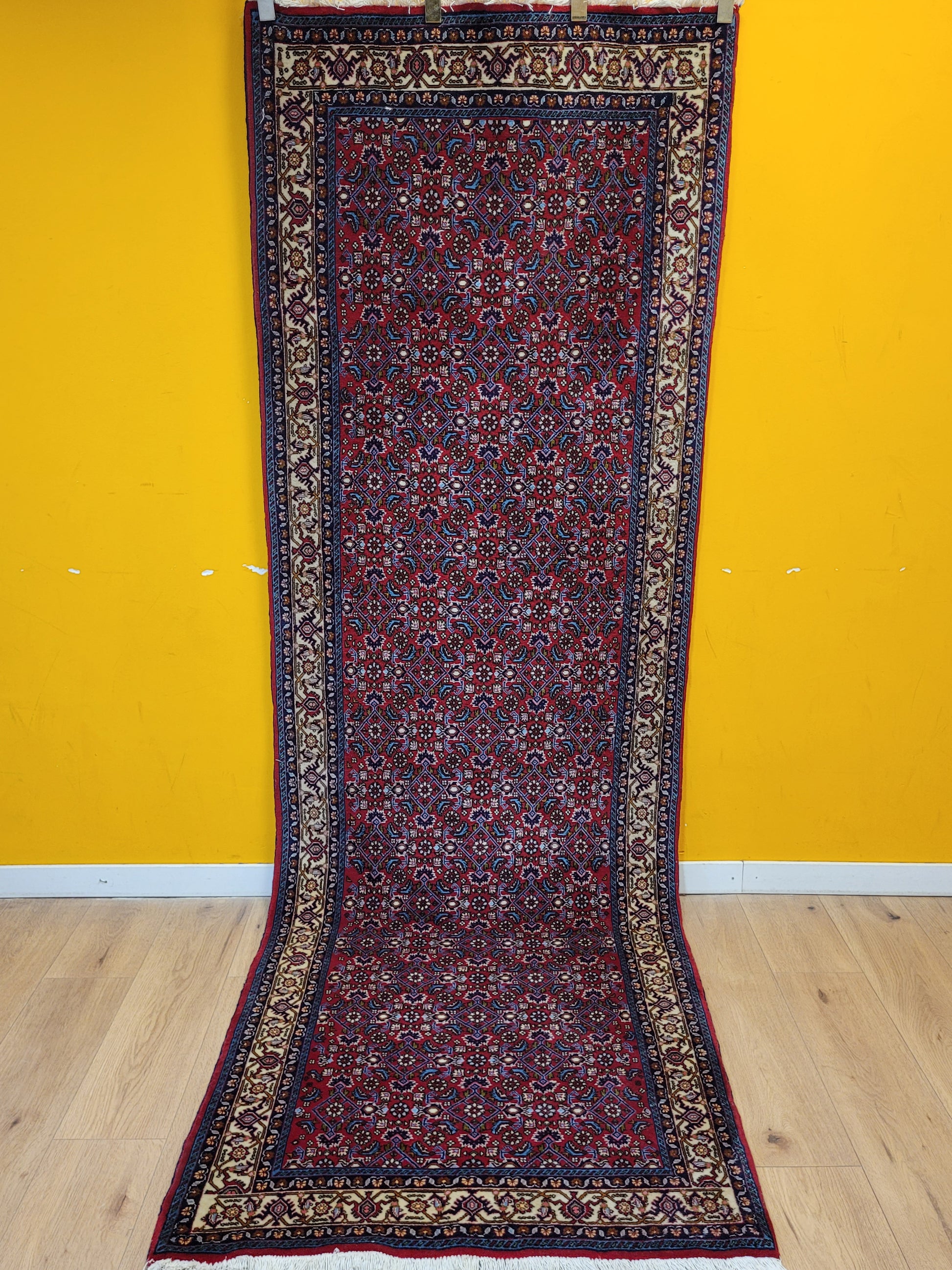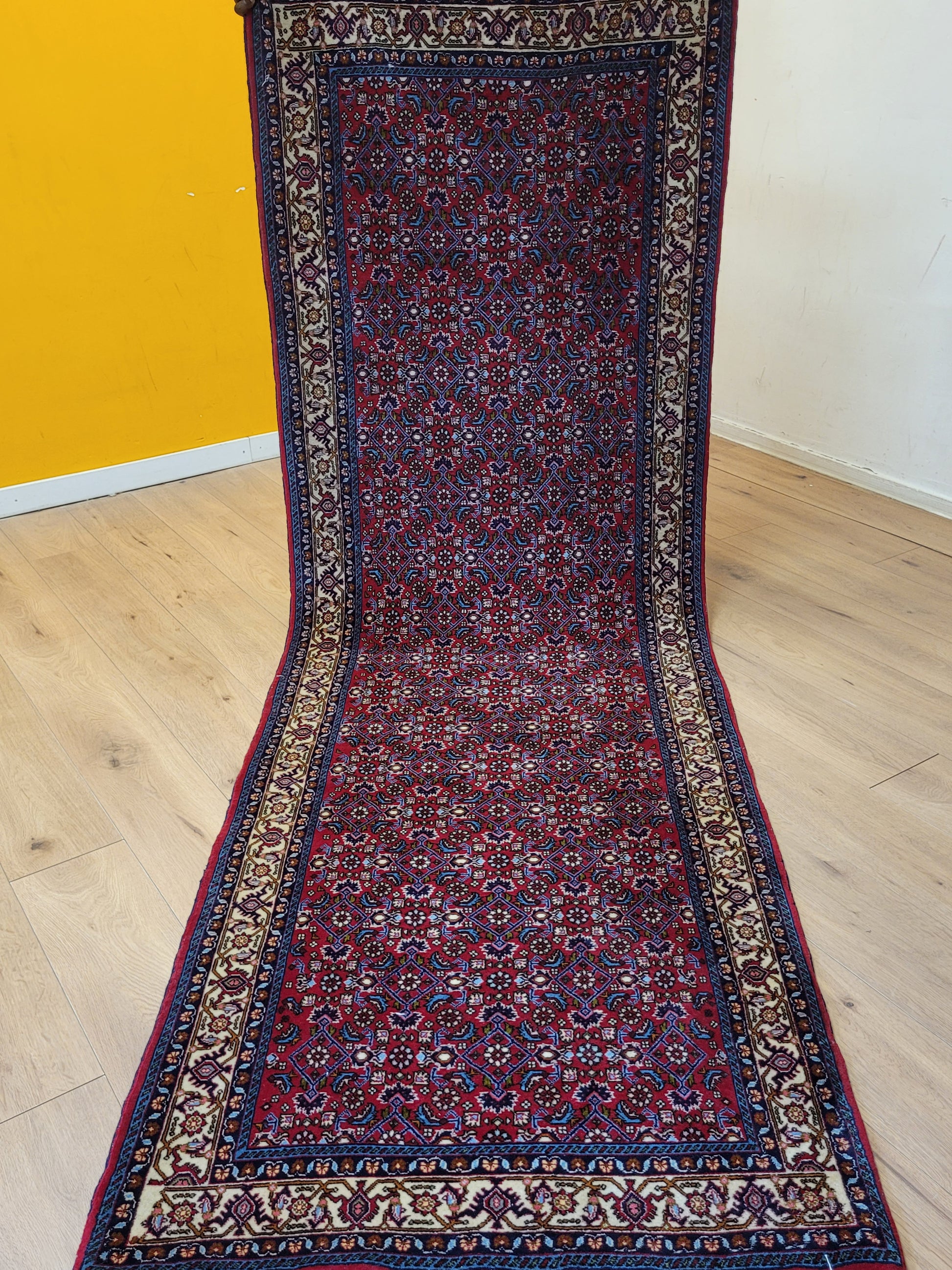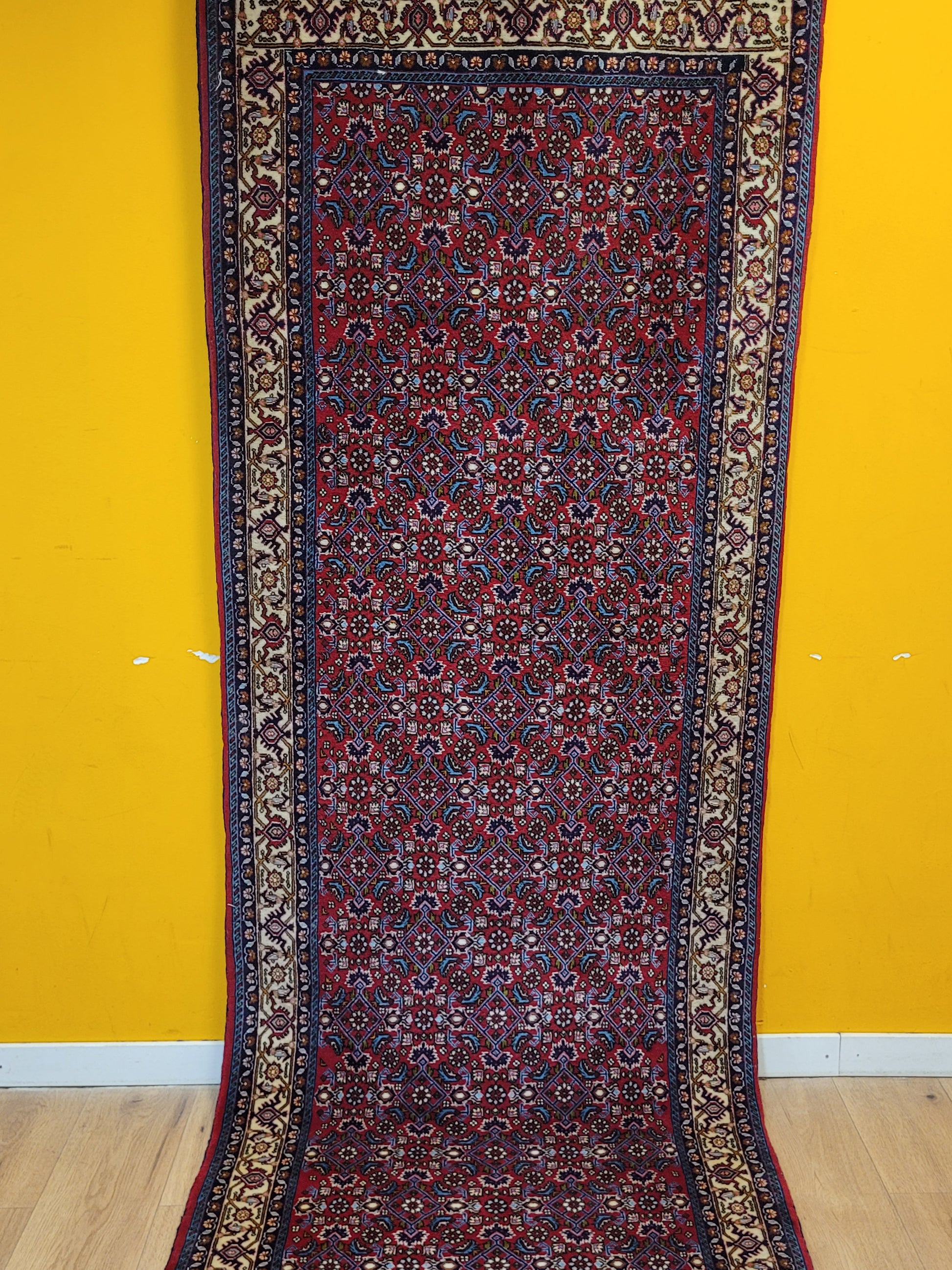angeboten wird ein klassischer Bidjar Perserteppich, handgeknüpft aus hochwertiger Korkwolle. Das dichte, fein gearbeitete Allover-Muster mit kleinen floralen Motiven und geometrischen Elementen ist typisch für die traditionsreiche Knüpfkunst aus Bidjar und zeichnet sich durch eine besonders langlebige Verarbeitung aus.