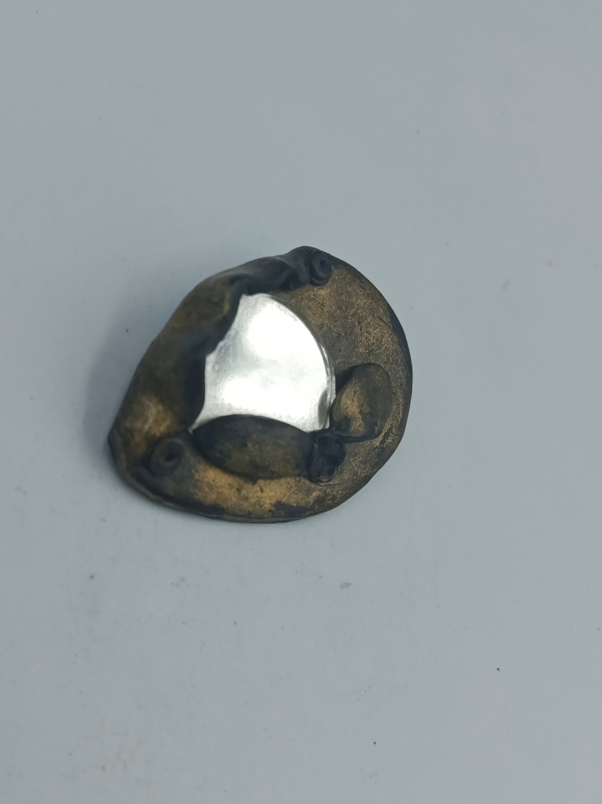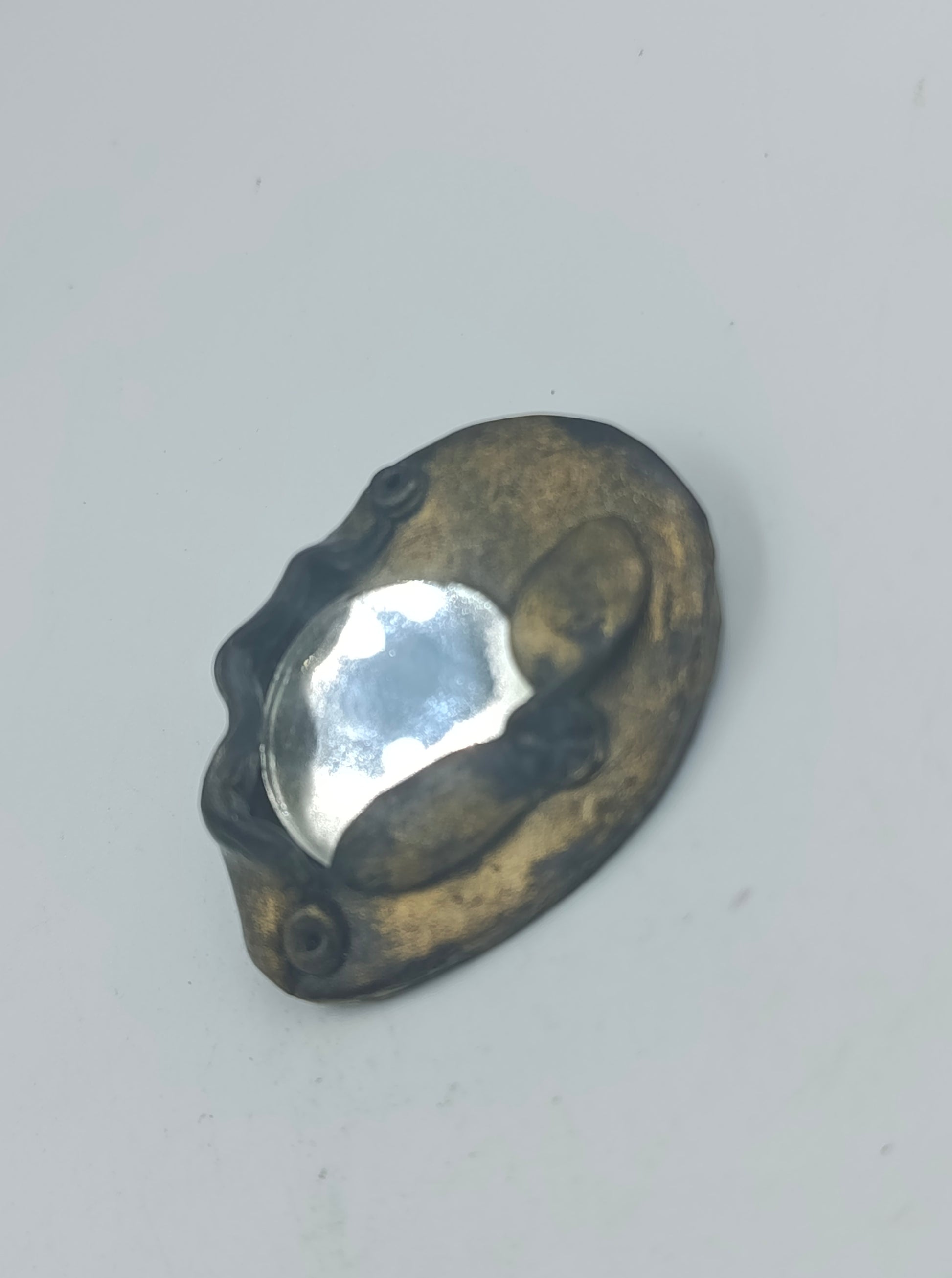 Ausdrucksstarke Brosche in Tropfenform mit antik bronzefarbener Oberfläche und einem klaren Glasstein in der Mitte. Das handgefertigte Design mit seiner leicht unregelmäßigen Form verleiht der Brosche einen authentischen Vintage-Charme. Ideal für Jacken, Schals oder Blusen als elegantes Detail.