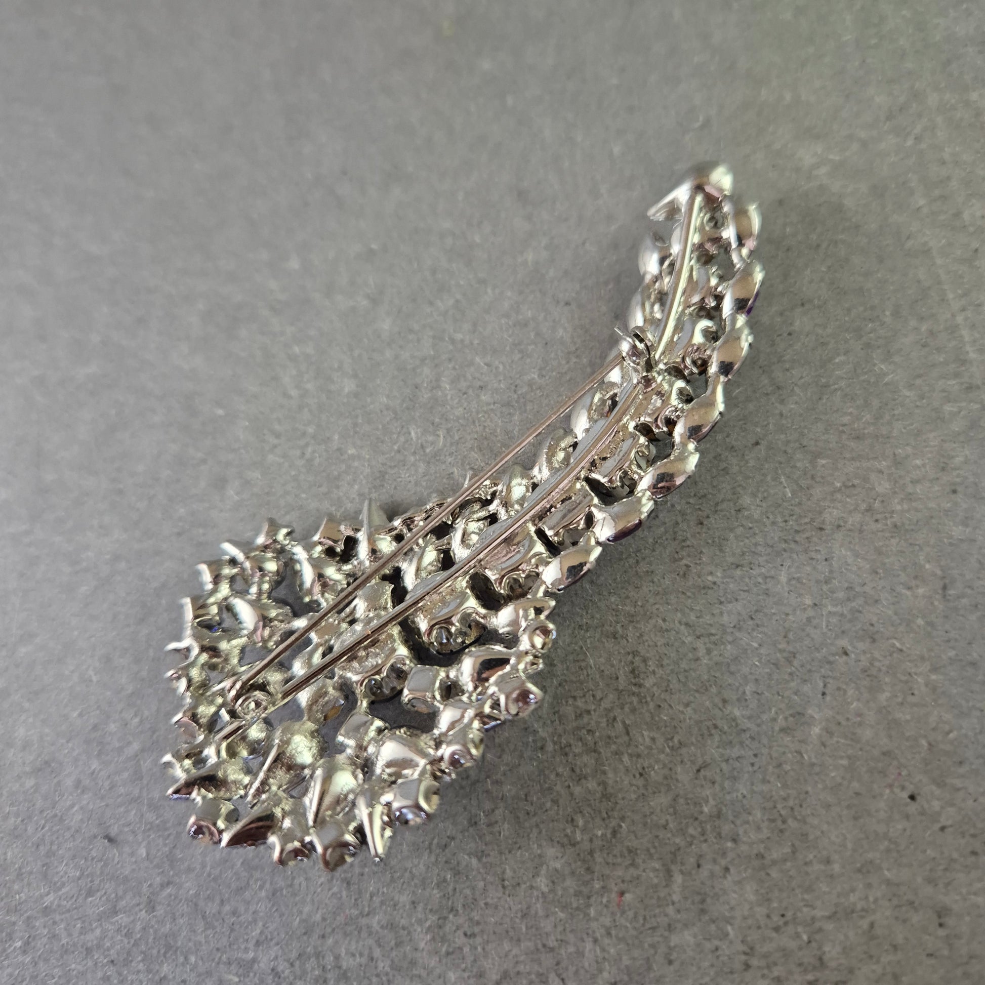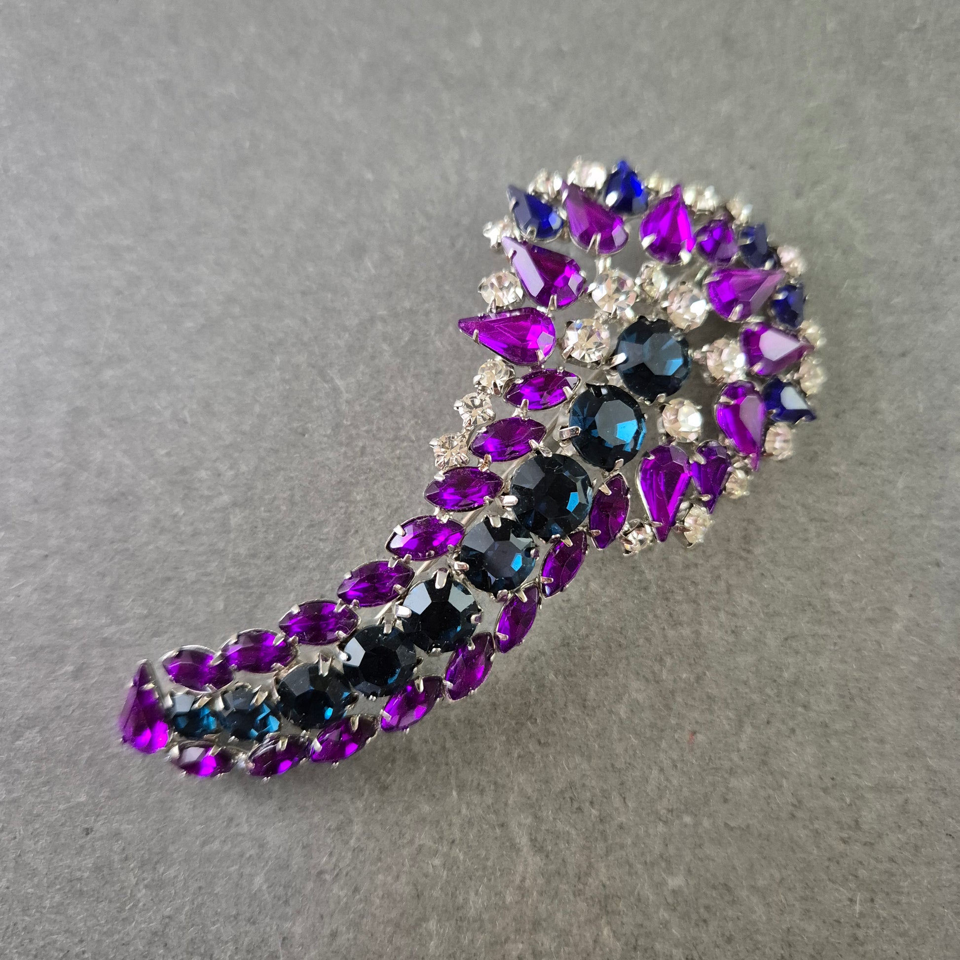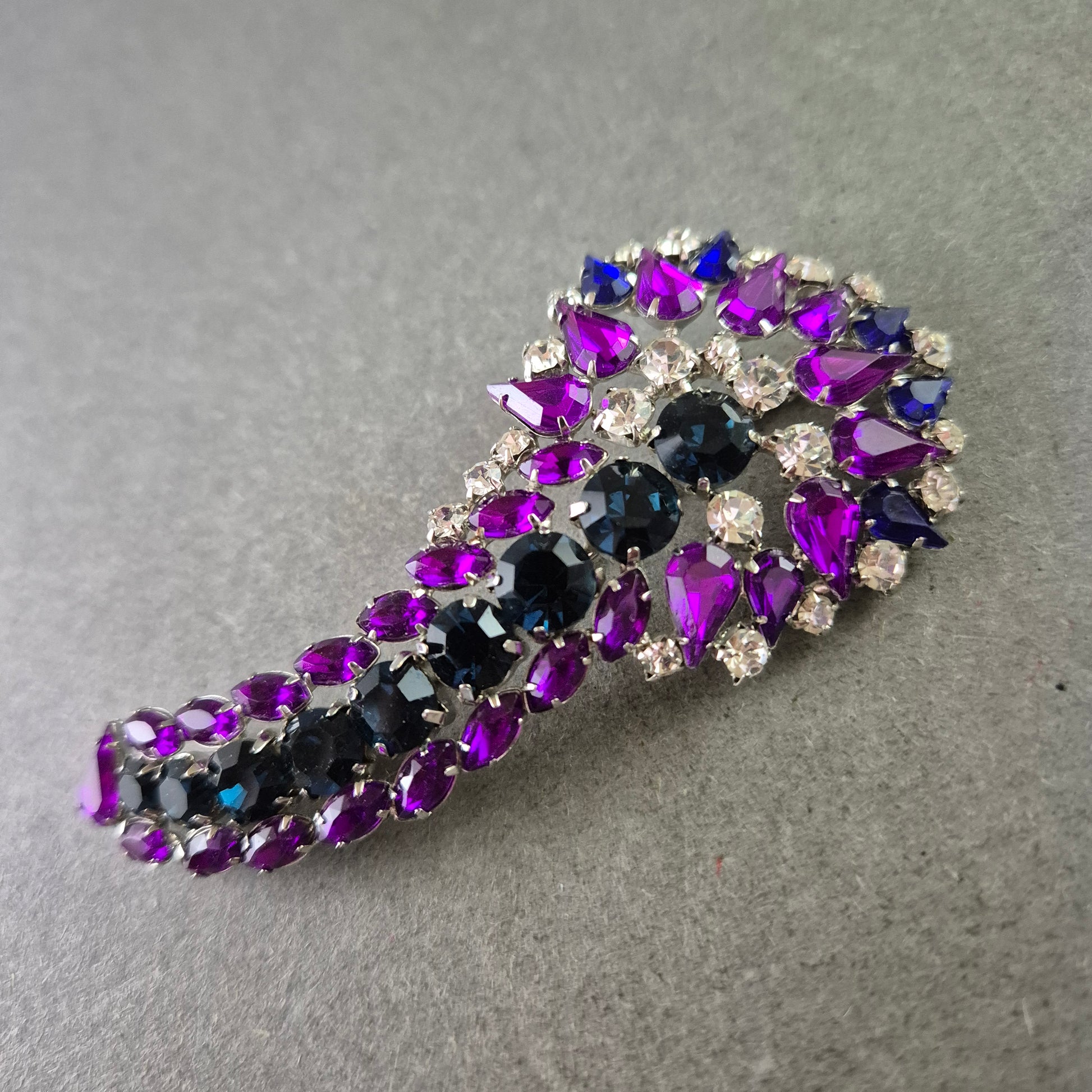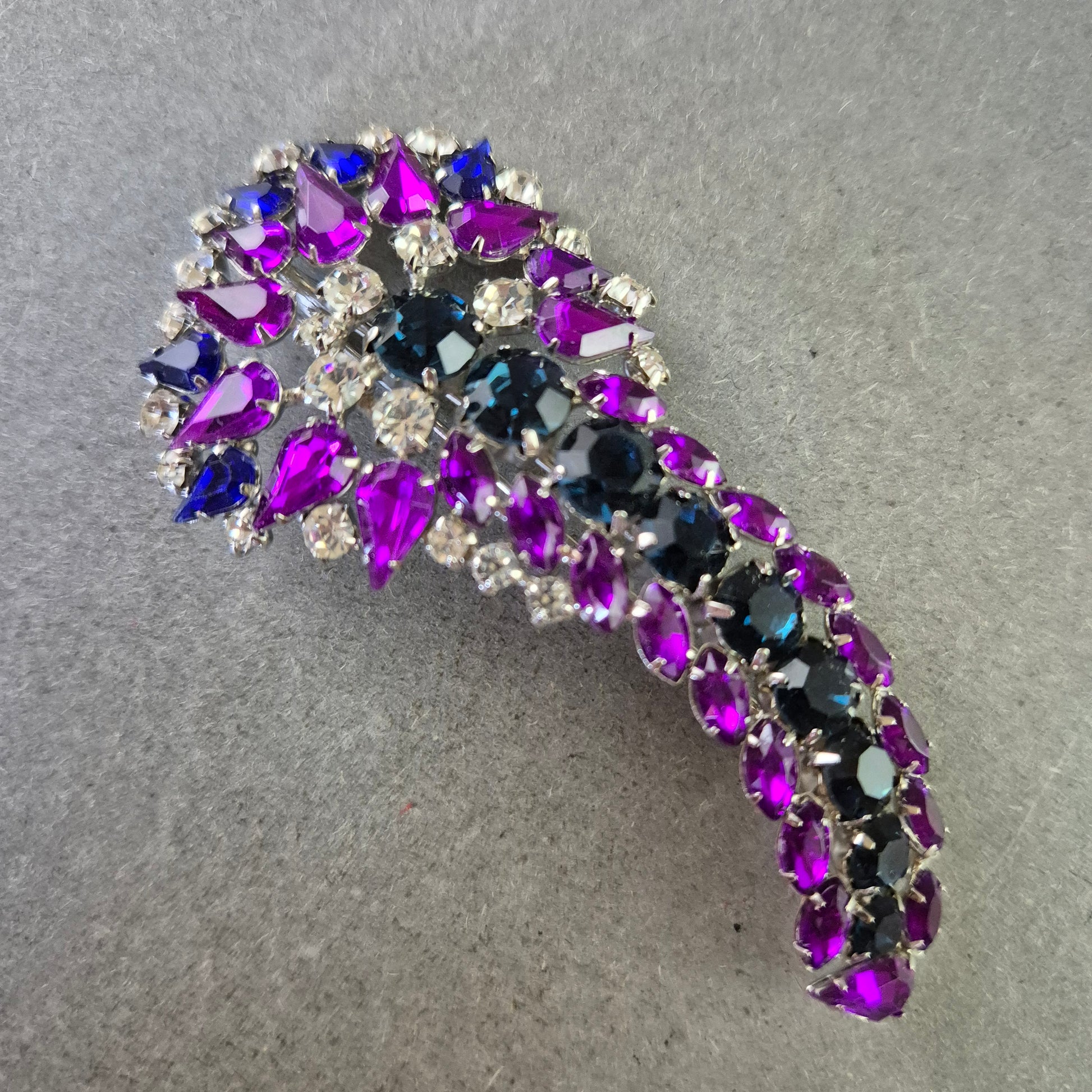 Diese auffällige Vintage-Brosche ist ein wahres Highlight für Liebhaber funkelnder Accessoires. Mit ihrer schwungvollen Form und den prachtvollen Strasssteinen in Lila-, Blau- und Kristalltönen zieht sie sofort alle Blicke auf sich.