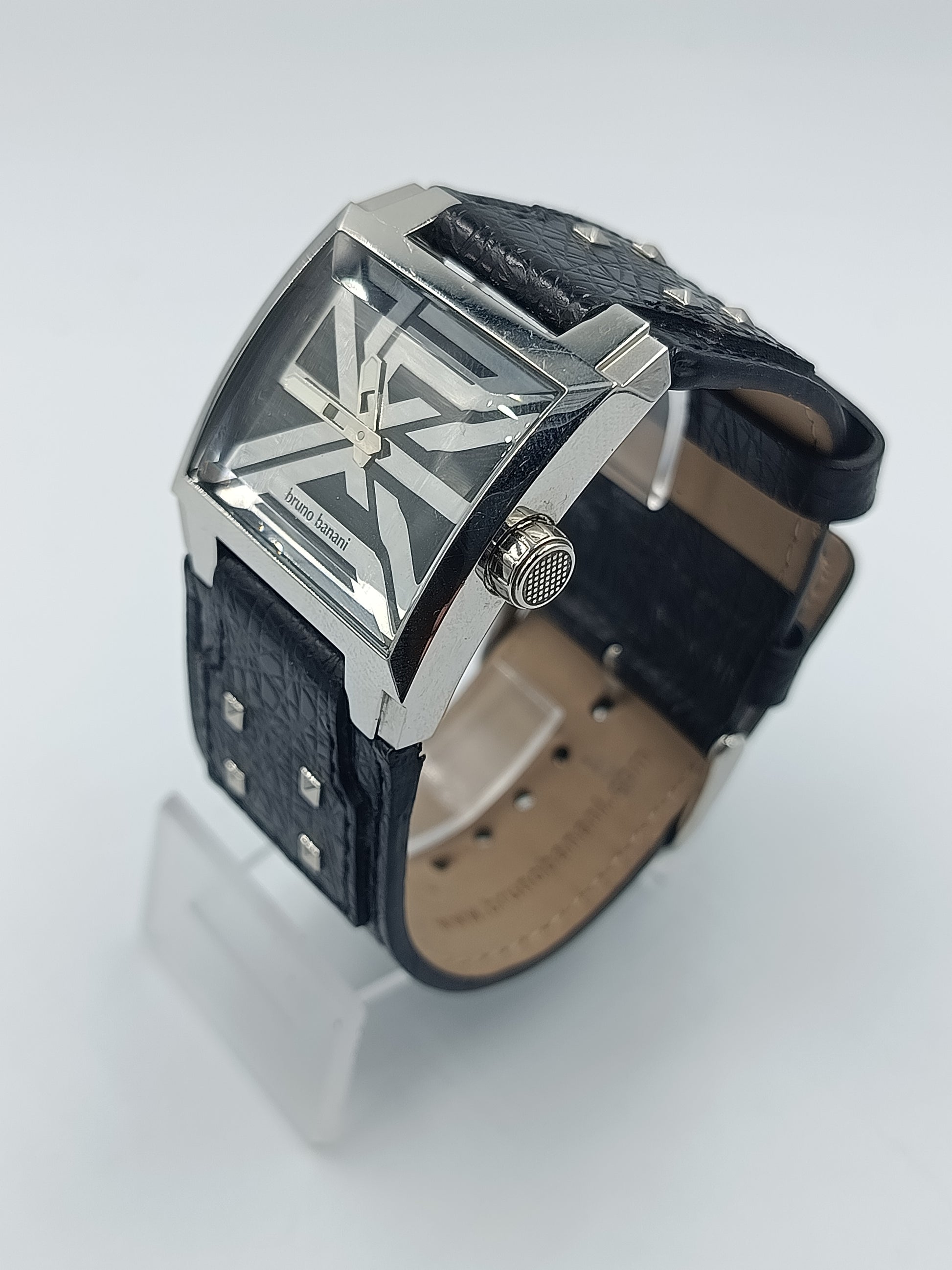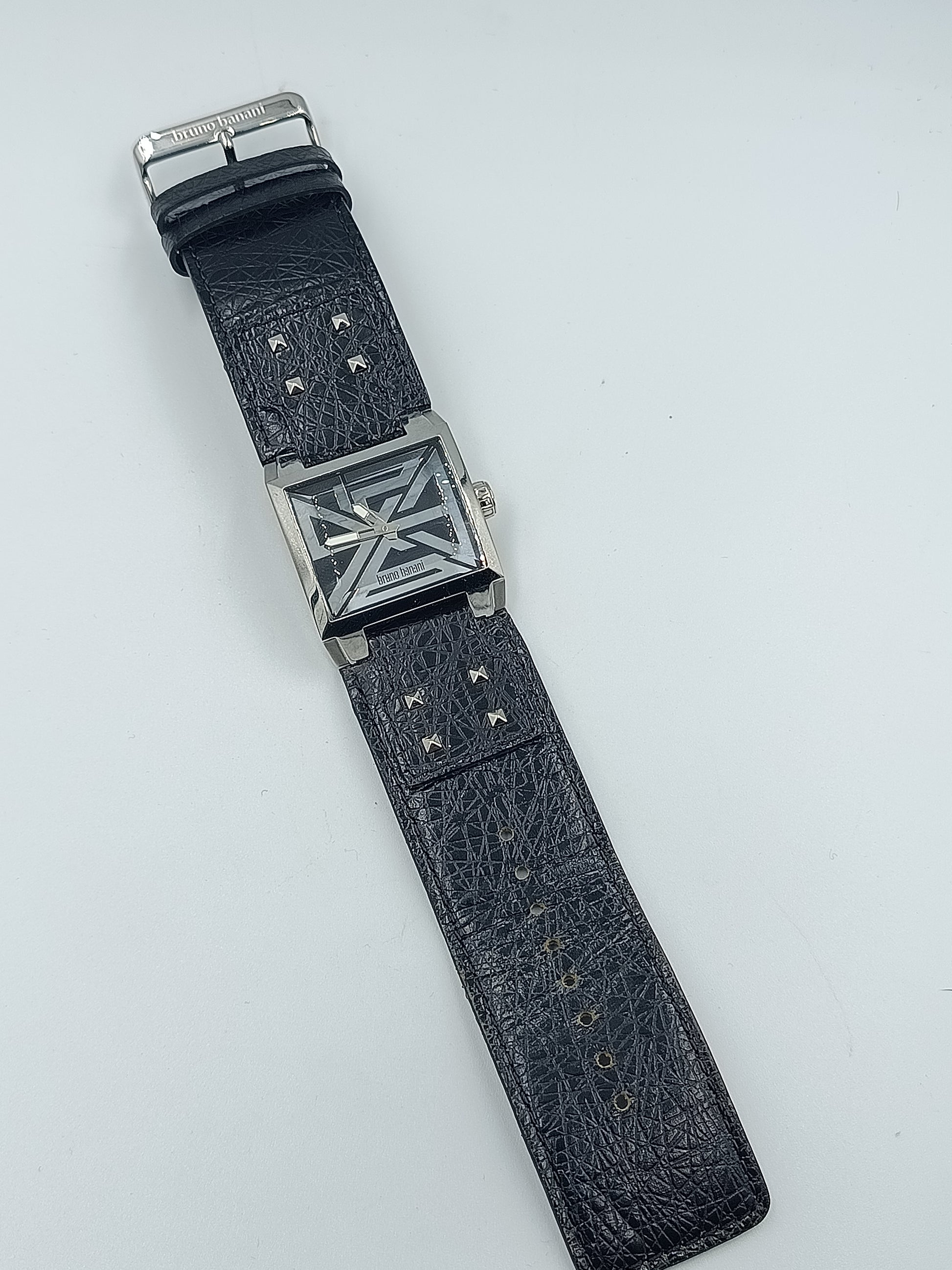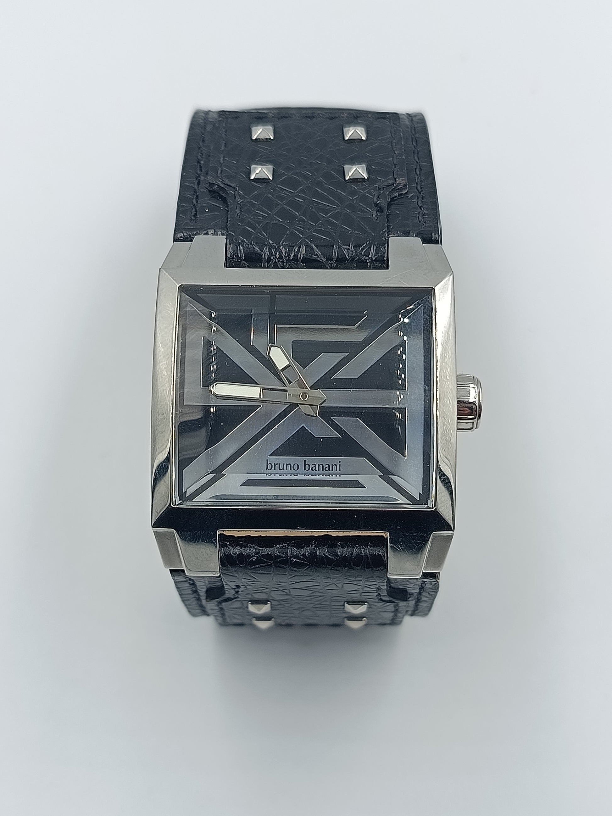 Stylische Bruno Banani Armbanduhr mit markantem, rechteckigem Gehäuse und schwarzem Lederarmband mit Nieten-Details. Das geometrische Design des Zifferblatts macht die Uhr zu einem echten Statement-Piece – perfekt für alle, die einen auffälligen, maskulinen Look lieben.