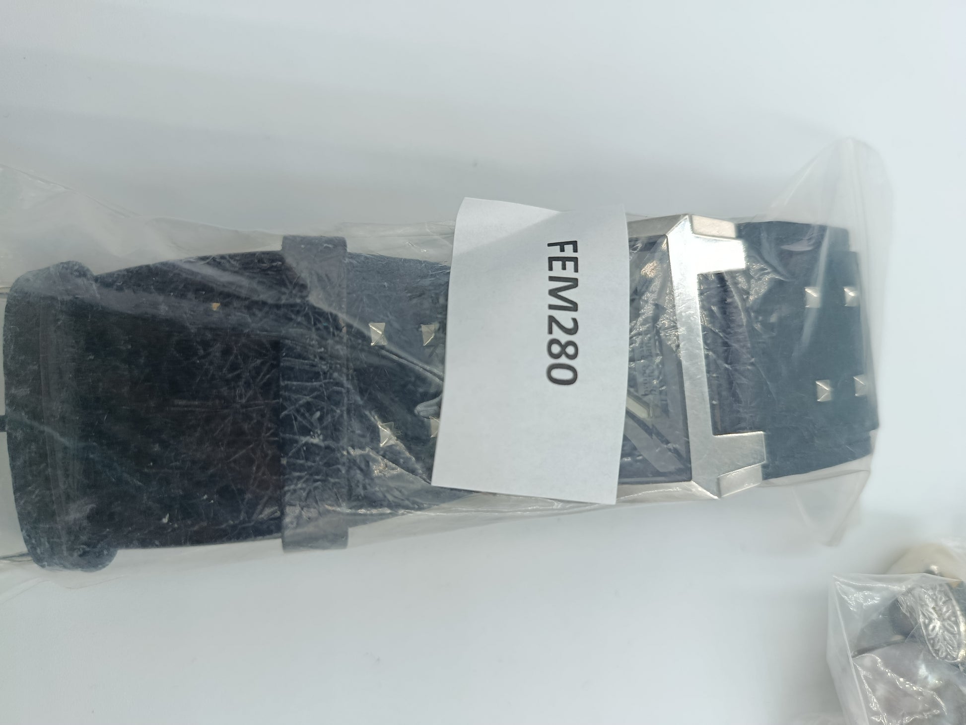 • Armband: Schwarzes Leder mit Nieten-Details, Dornschließe