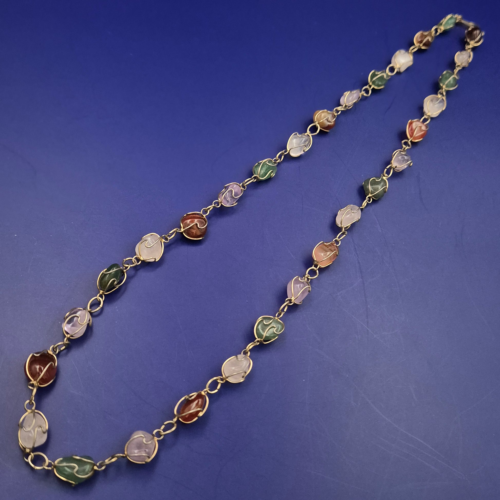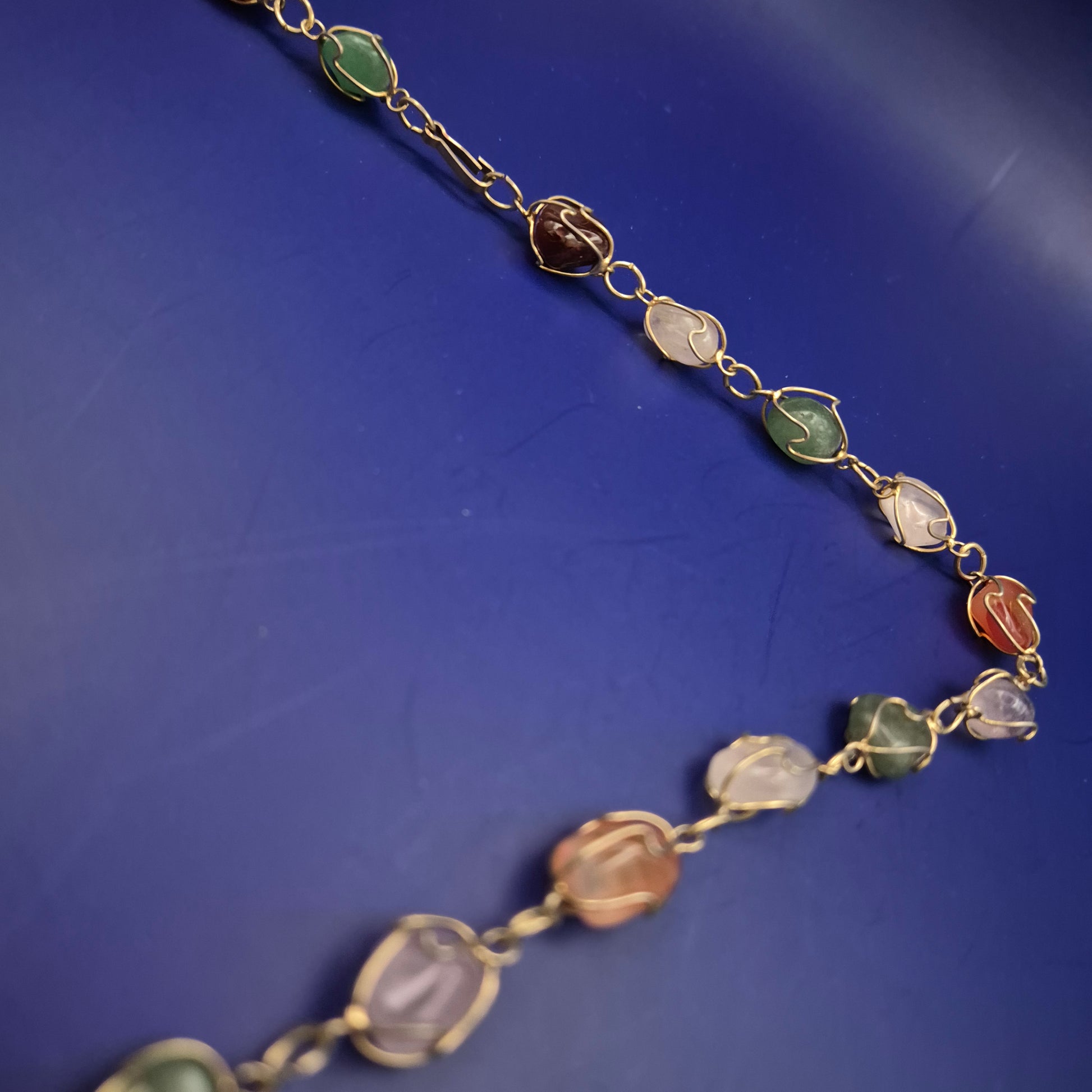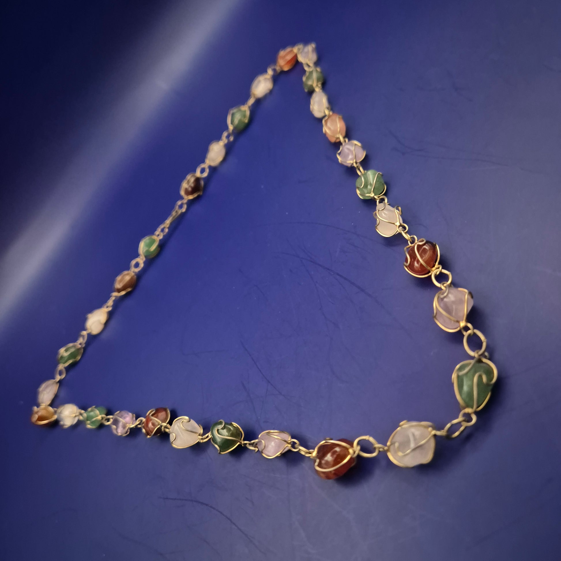 Diese zarte Halskette verzaubert mit einer Reihe kleiner, bunter Edelsteine, die in goldfarbenen Draht kunstvoll eingefasst sind. Die Steine zeigen sich in verschiedenen Farben wie Grün, Violett, Weiß, Braun und Rosa – wahrscheinlich handelt es sich um eine Mischung aus Aventurin, Rosenquarz, Amethyst, Jade und anderen Natursteinen. Die filigrane Verarbeitung verleiht der Kette eine elegante Leichtigkeit und macht sie zu einem stilvollen Begleiter für jeden Tag.