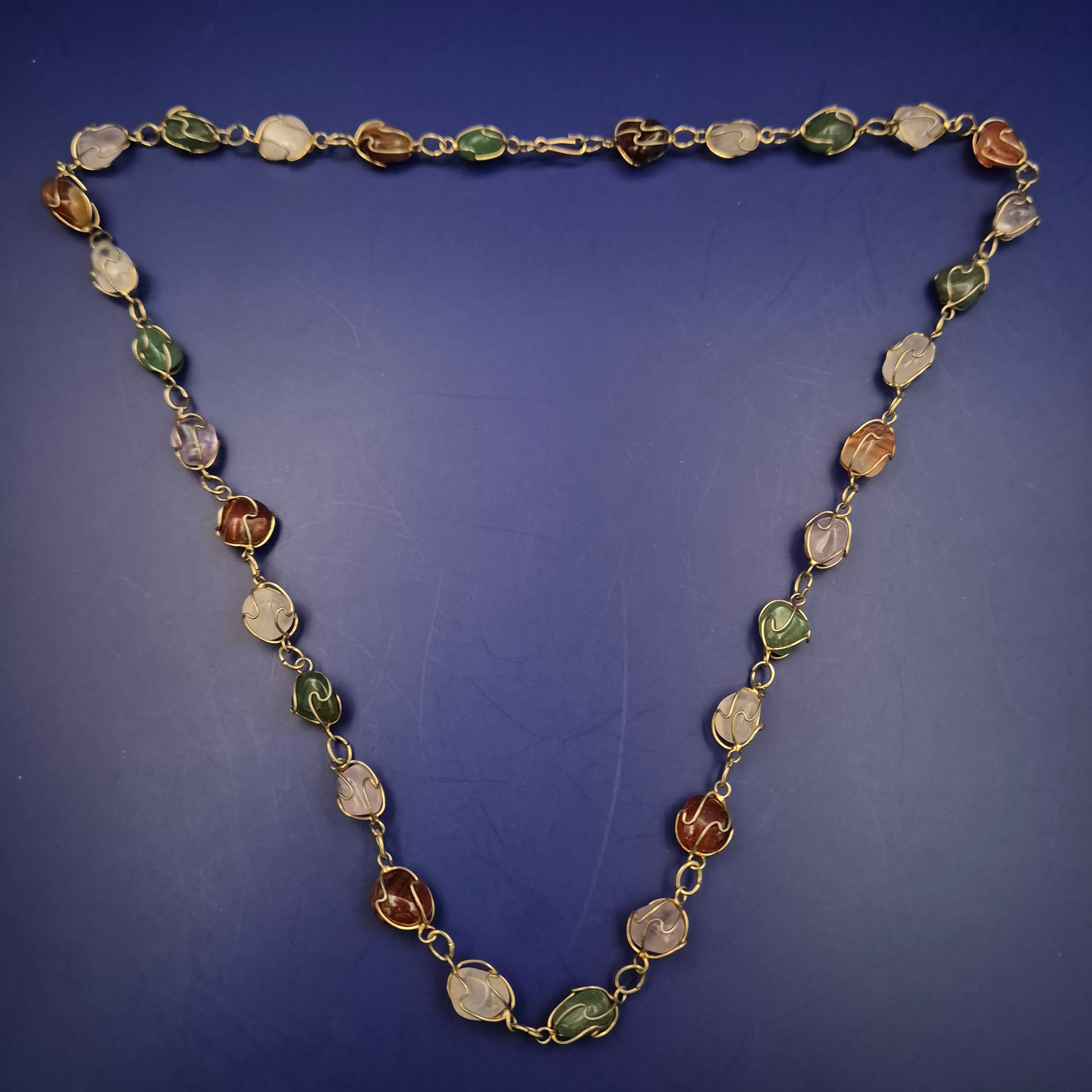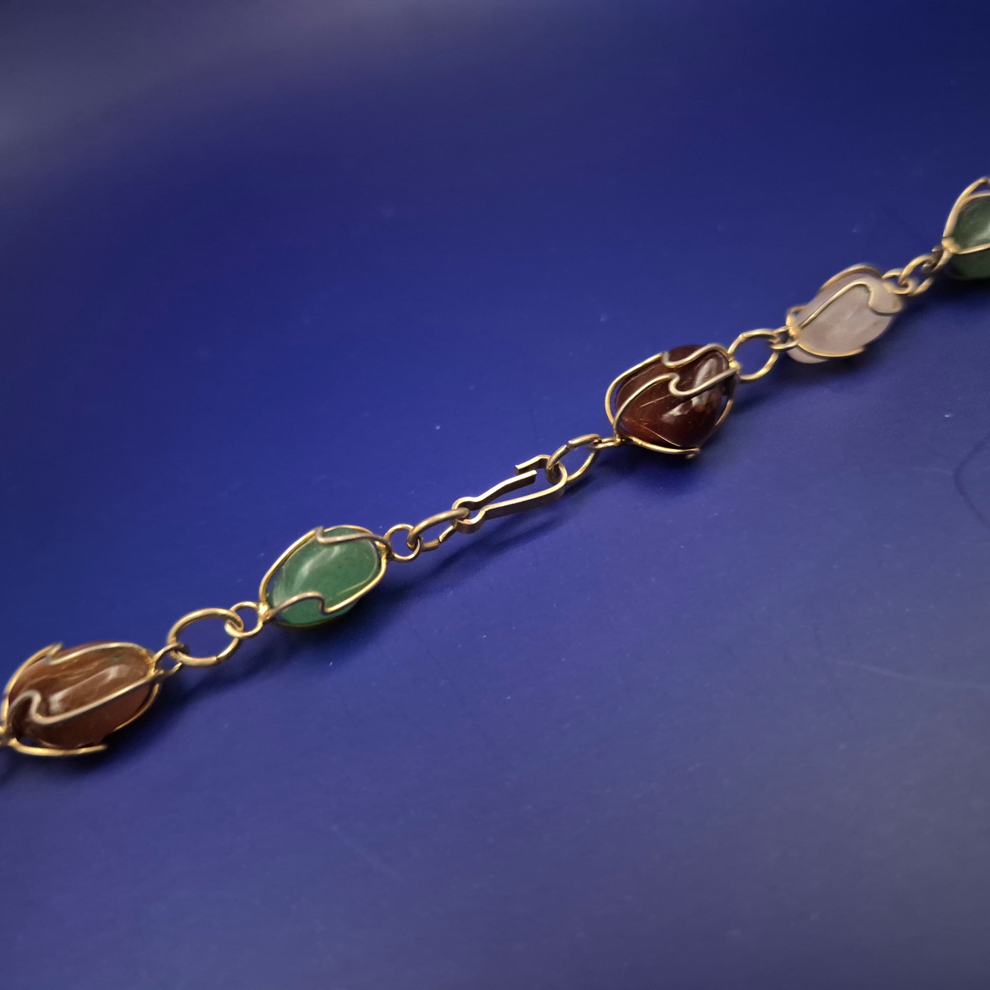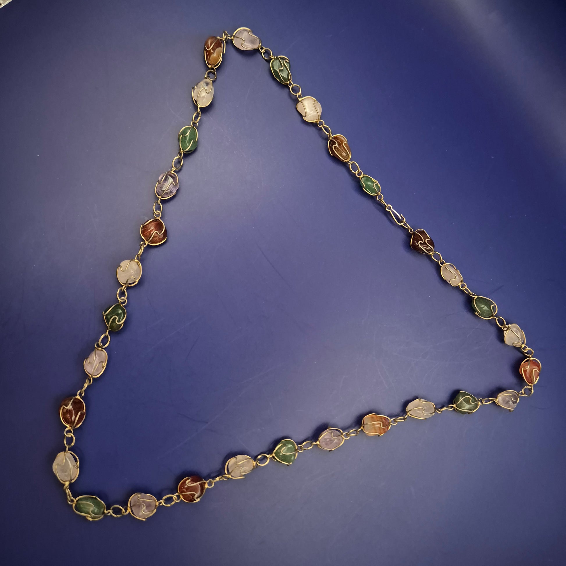 Diese zarte Halskette verzaubert mit einer Reihe kleiner, bunter Edelsteine, die in goldfarbenen Draht kunstvoll eingefasst sind. Die Steine zeigen sich in verschiedenen Farben wie Grün, Violett, Weiß, Braun und Rosa – wahrscheinlich handelt es sich um eine Mischung aus Aventurin, Rosenquarz, Amethyst, Jade und anderen Natursteinen. Die filigrane Verarbeitung verleiht der Kette eine elegante Leichtigkeit und macht sie zu einem stilvollen Begleiter für jeden Tag.