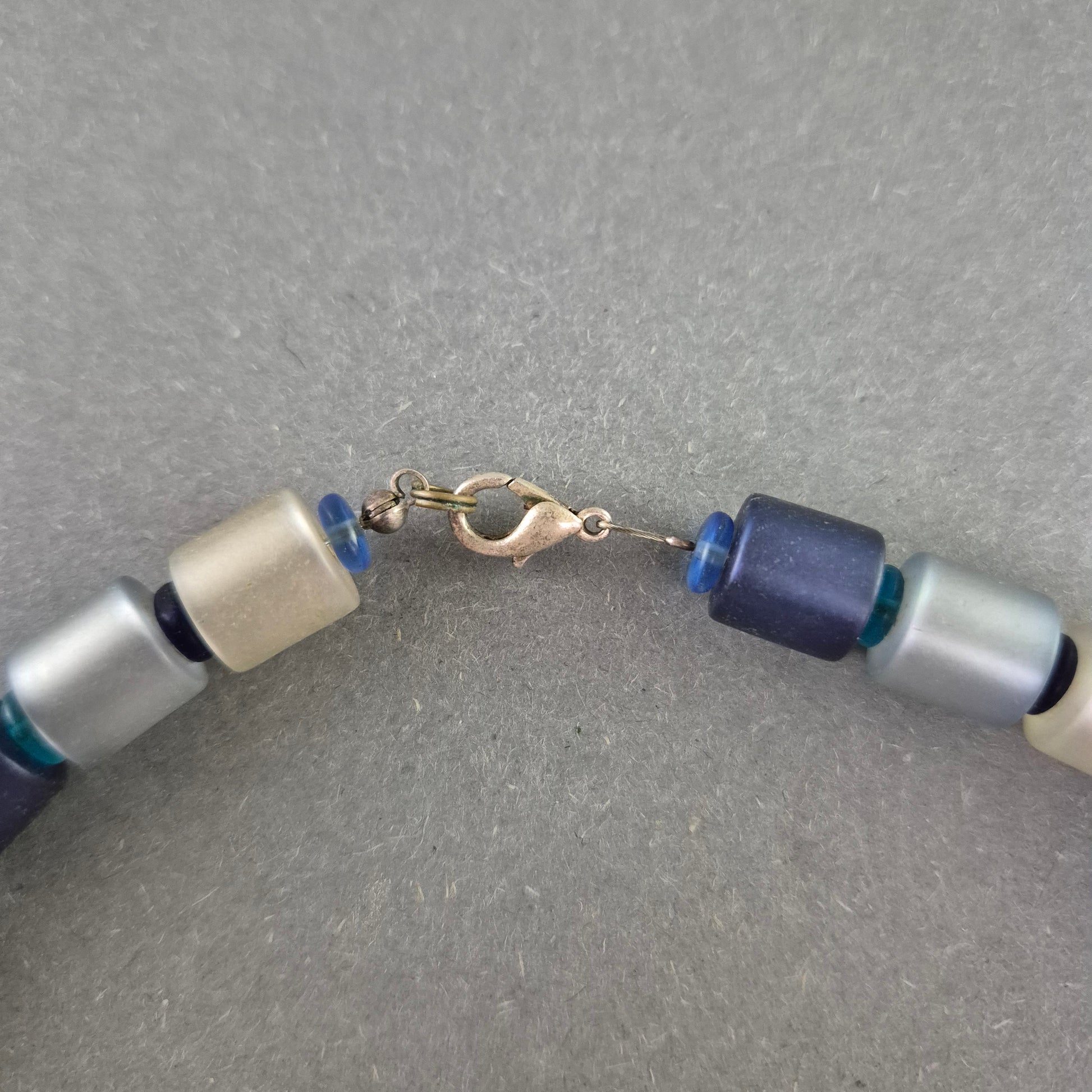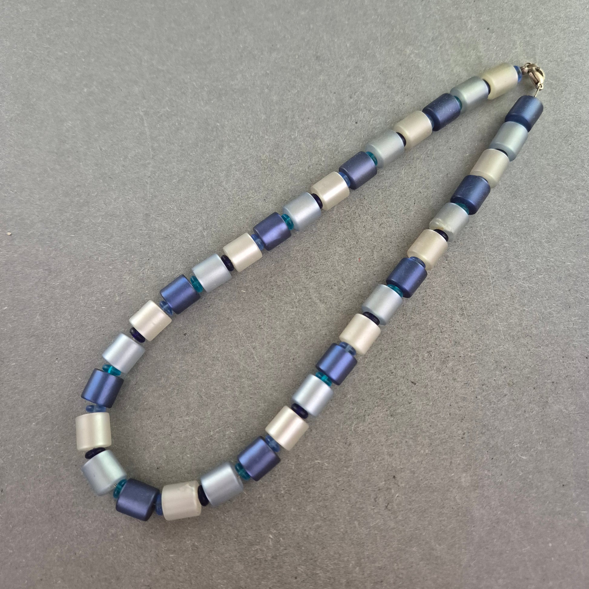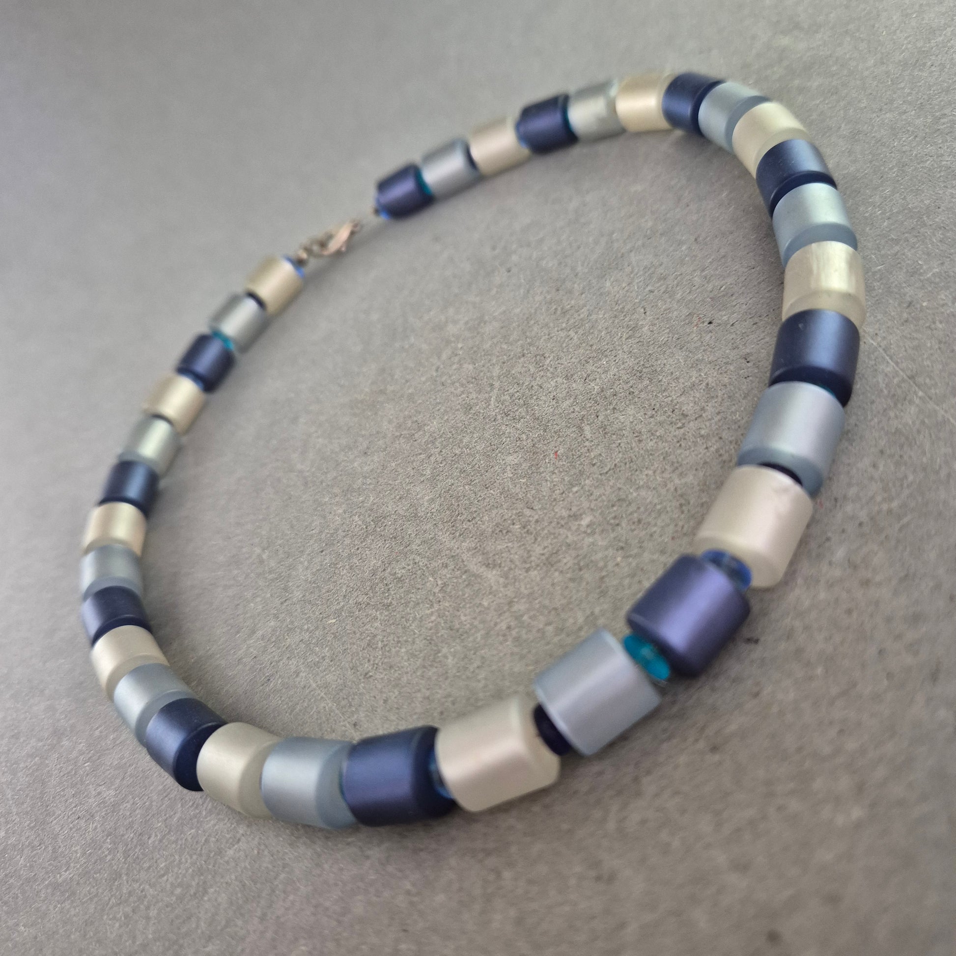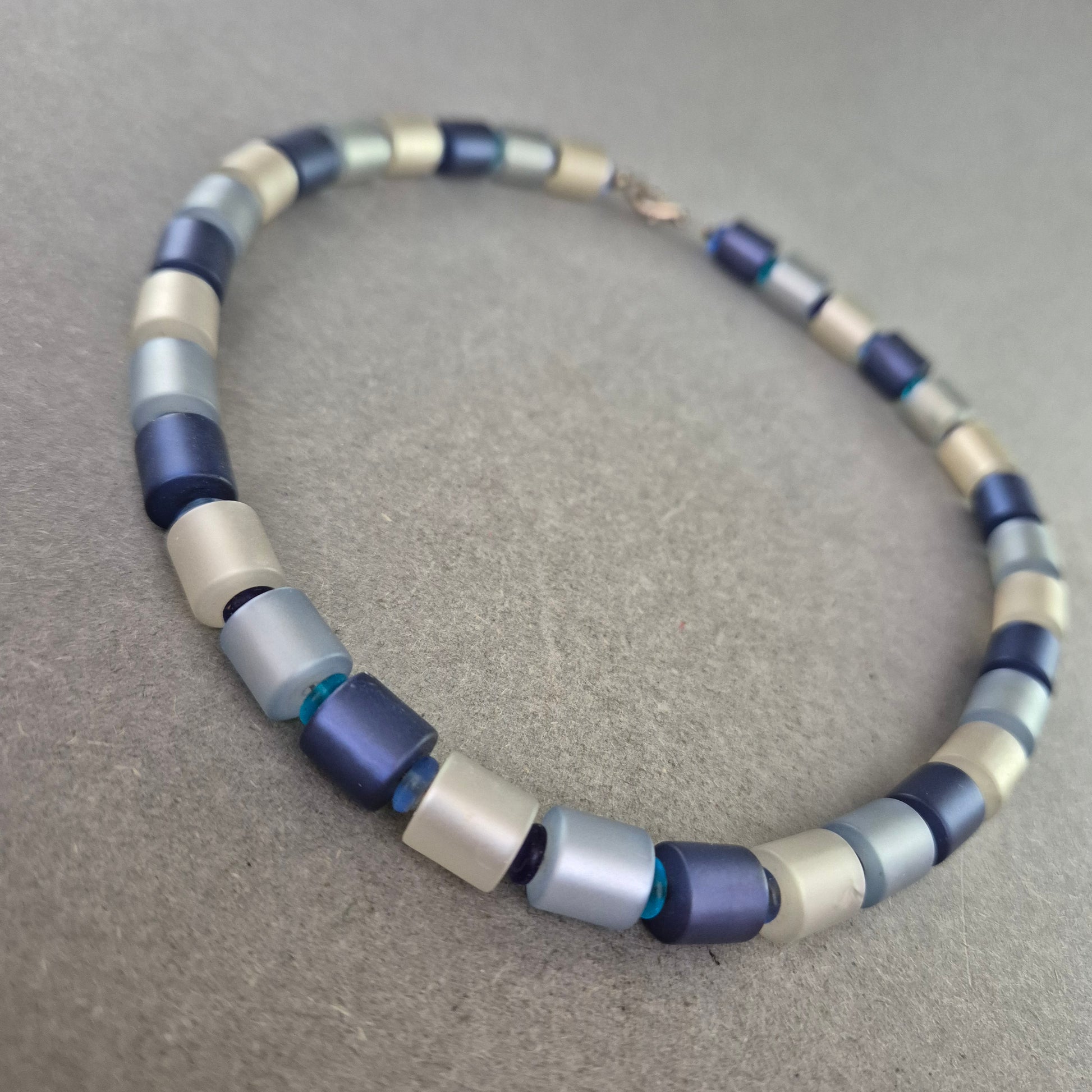Bunte Halskette mit matten Kunststoffperlen in Blau und Beige