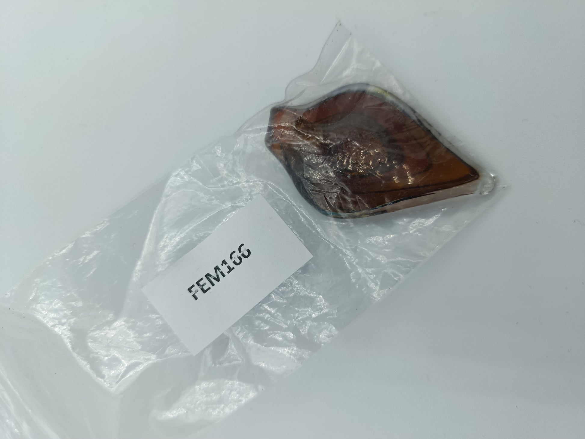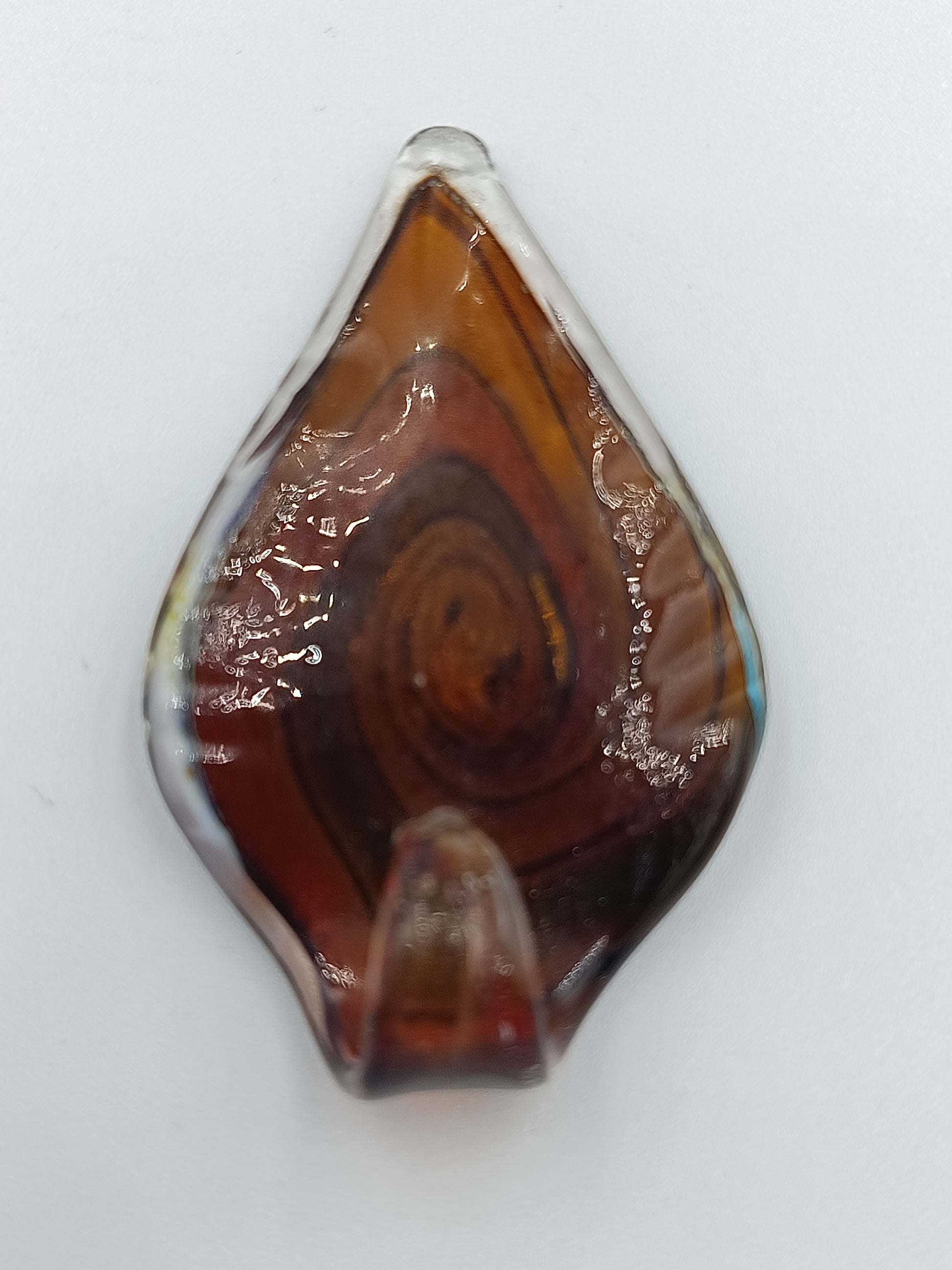 Ein auffälliger, handgefertigt wirkender Glasanhänger in Tropfenform. Die geschwungene Form und die spiralförmige Musterung in Kupfer-, Blau- und Rot-Tönen machen ihn zu einem echten Blickfang. Das Glas hat eine klare, glänzende Oberfläche und erinnert an Murano-Glaskunst.