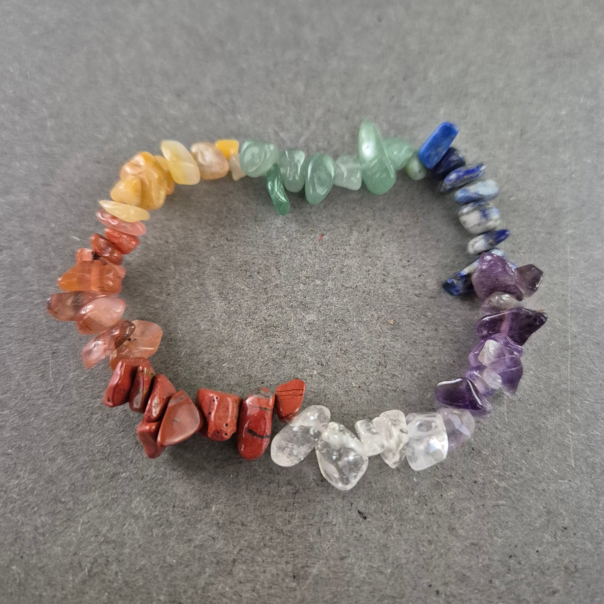 Dieses Chakra-Armband besteht aus echten, polierten Edelstein-Chips in allen Farben des Regenbogens. Es ist auf einem elastischen Band aufgereiht und symbolisiert die sieben Chakren des Körpers. Ob als spiritueller Begleiter oder farbenfrohes Modeaccessoire – dieses Armband ist vielseitig tragbar und ideal für den Alltag.