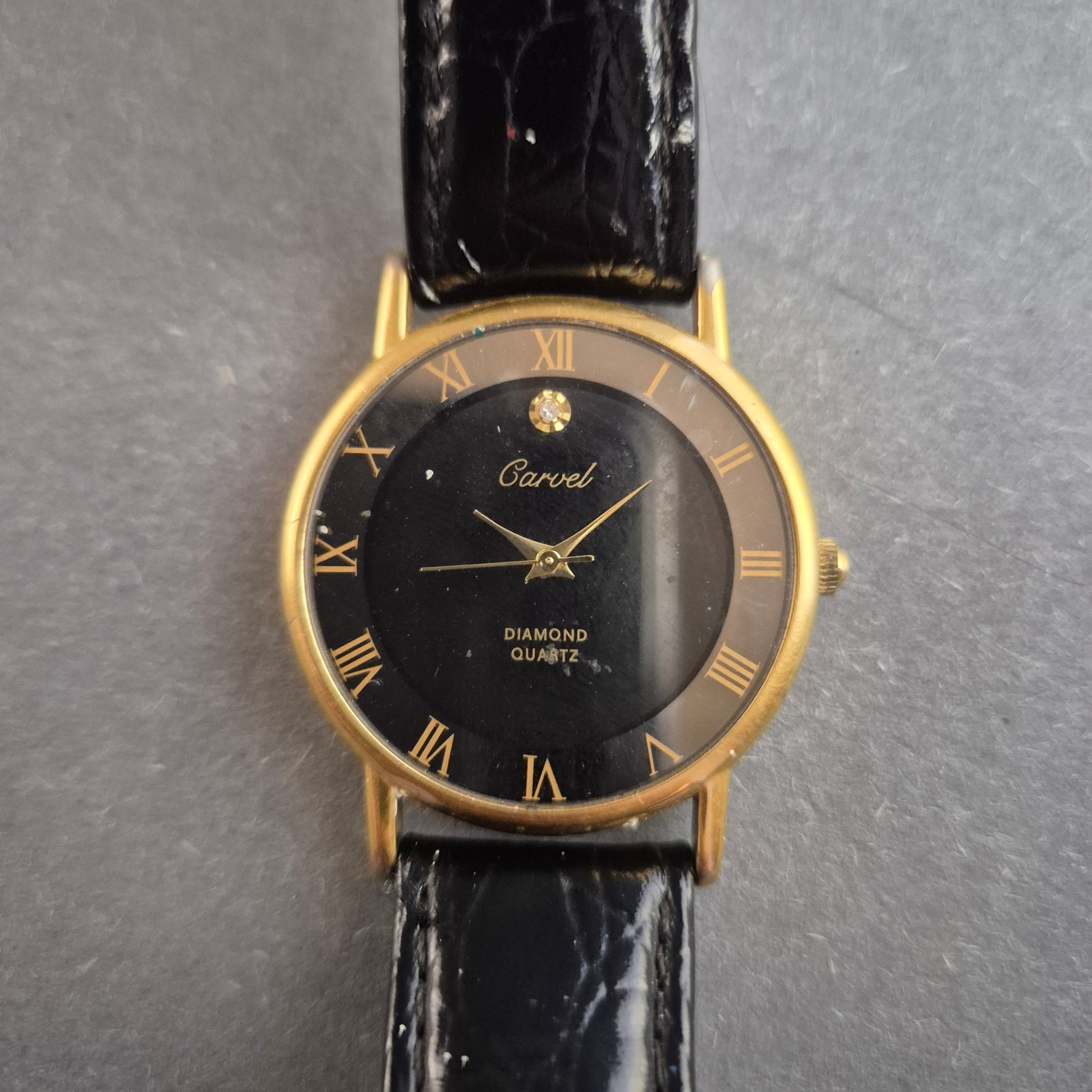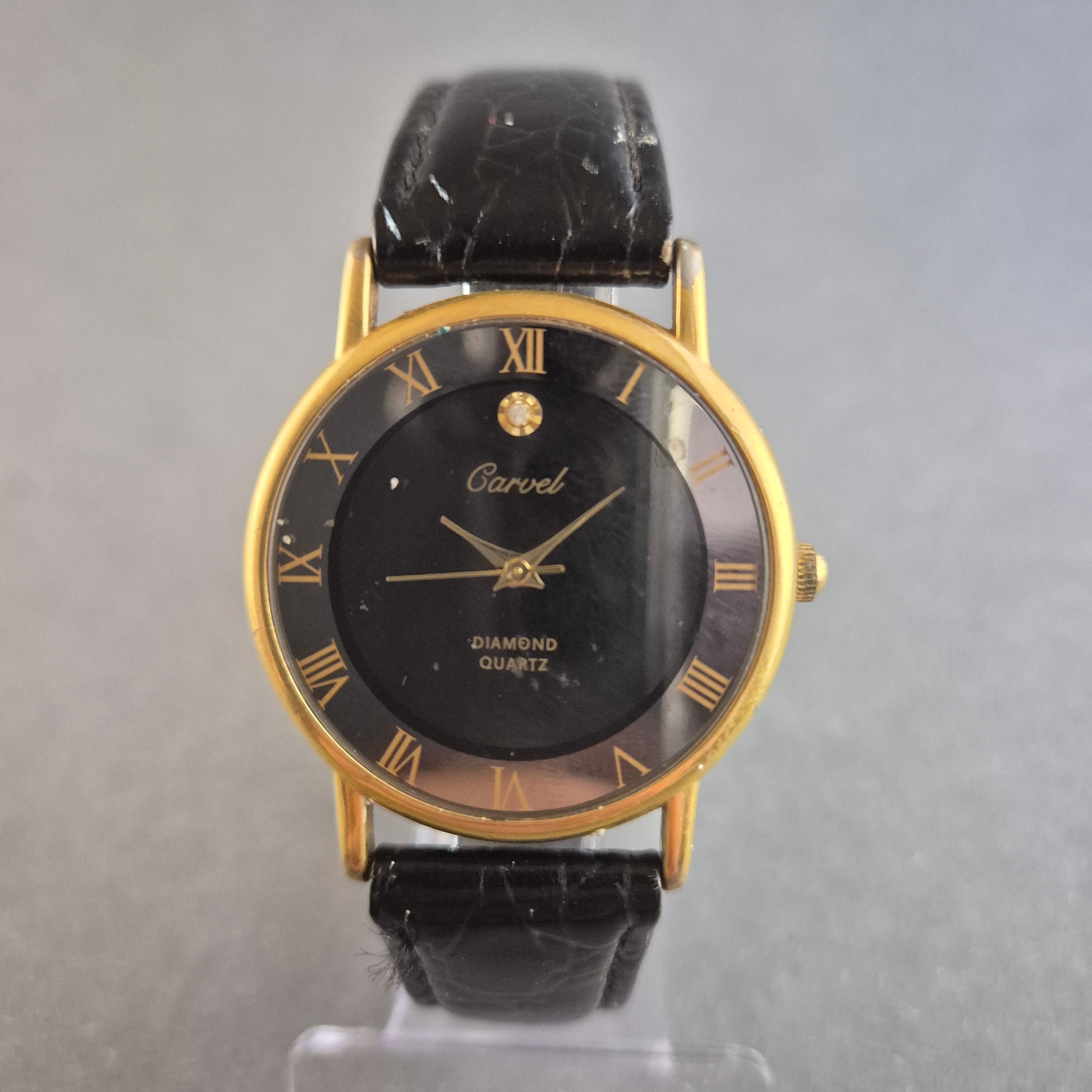 Diese stilvolle Herrenarmbanduhr von Carvel besticht durch ihr klassisch-elegantes Design. Das goldfarbene Gehäuse kombiniert mit dem schwarzen Zifferblatt und römischen Ziffern verleiht ihr eine luxuriöse Optik. Ein funkelnder Akzentstein auf der 12-Uhr-Position hebt das edle Design hervor. Dank des präzisen Quarzwerks bietet diese Uhr eine zuverlässige Zeitmessung. Das schwarze Lederarmband mit Krokoprägung rundet das elegante Erscheinungsbild ab.