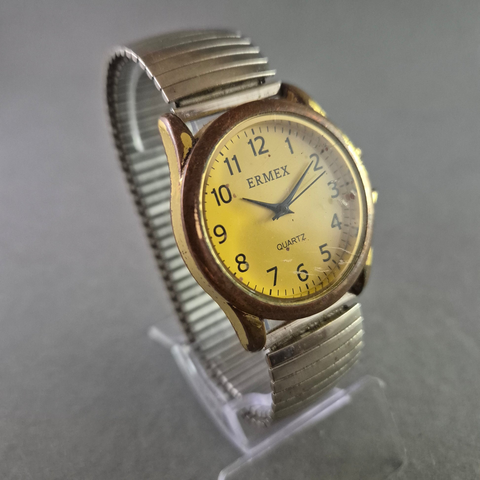 Diese ansprechende Damen Uhr der Marke ERMEX besticht durch ihr fröhlich gelbes Zifferblatt mit gut lesbaren schwarzen arabischen Ziffern, das einen lebendigen Akzent setzt. Das Gehäuse in einem warmen Goldton harmoniert perfekt mit dem silberfarbenen Flexband, wodurch ein attraktiver Bicolor-Look entsteht. Das praktische Flexband sorgt für einen bequemen Sitz und macht diese Uhr zu einem unkomplizierten und stylischen Begleiter für den Alltag.
