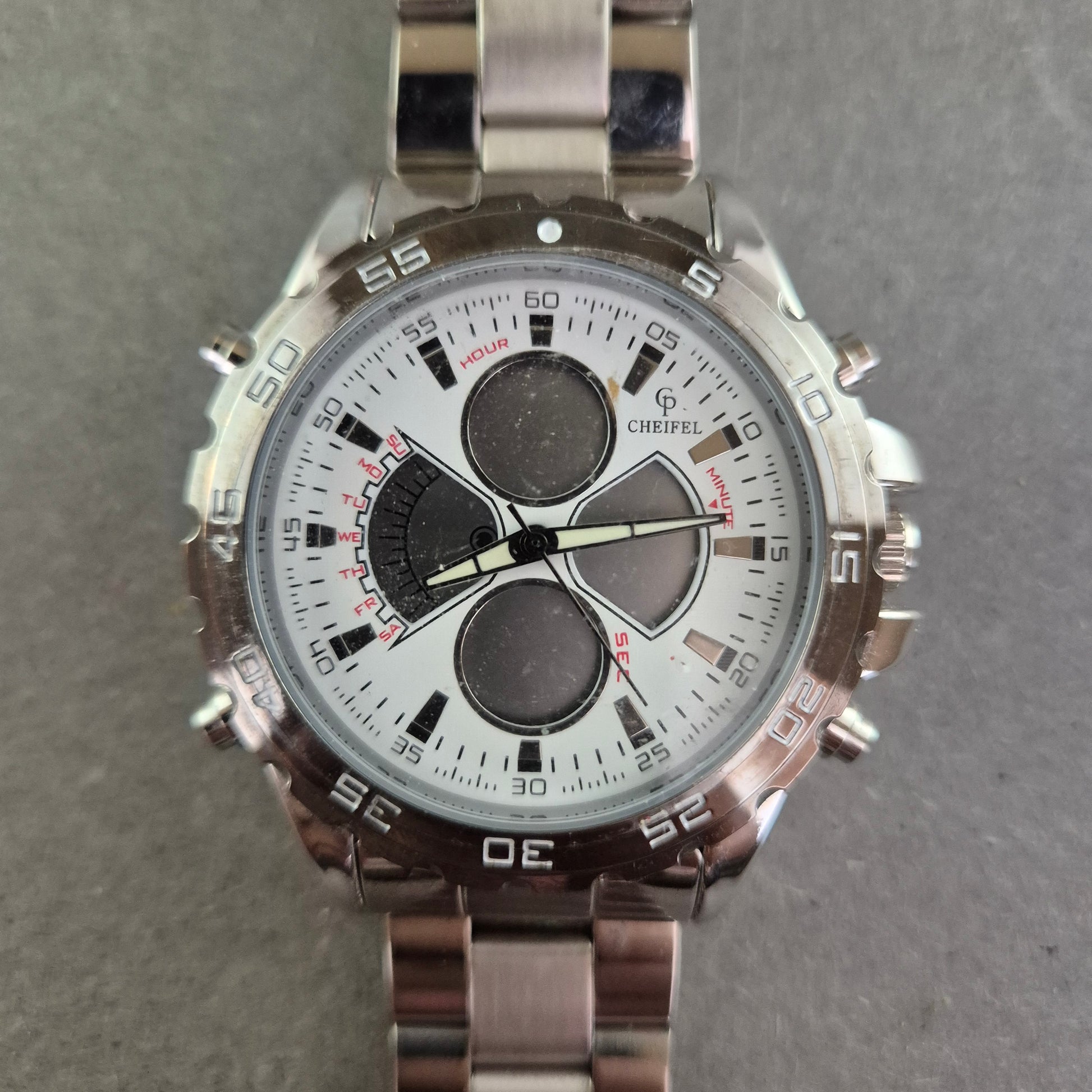 Der Cheifel Herrenchronograph vereint sportliches Design mit funktionaler Technik. Mit seinem großen weißen Zifferblatt, markanten Totalisatoren und silberfarbenen Akzenten eignet sich diese Uhr perfekt für aktive Träger. Das Edelstahlarmband sorgt für Stabilität und ein hochwertiges Tragegefühl. Die Uhr verfügt über verschiedene Chronographenfunktionen und eine robuste Edelstahlausführung – ideal für Freizeit und Alltag.