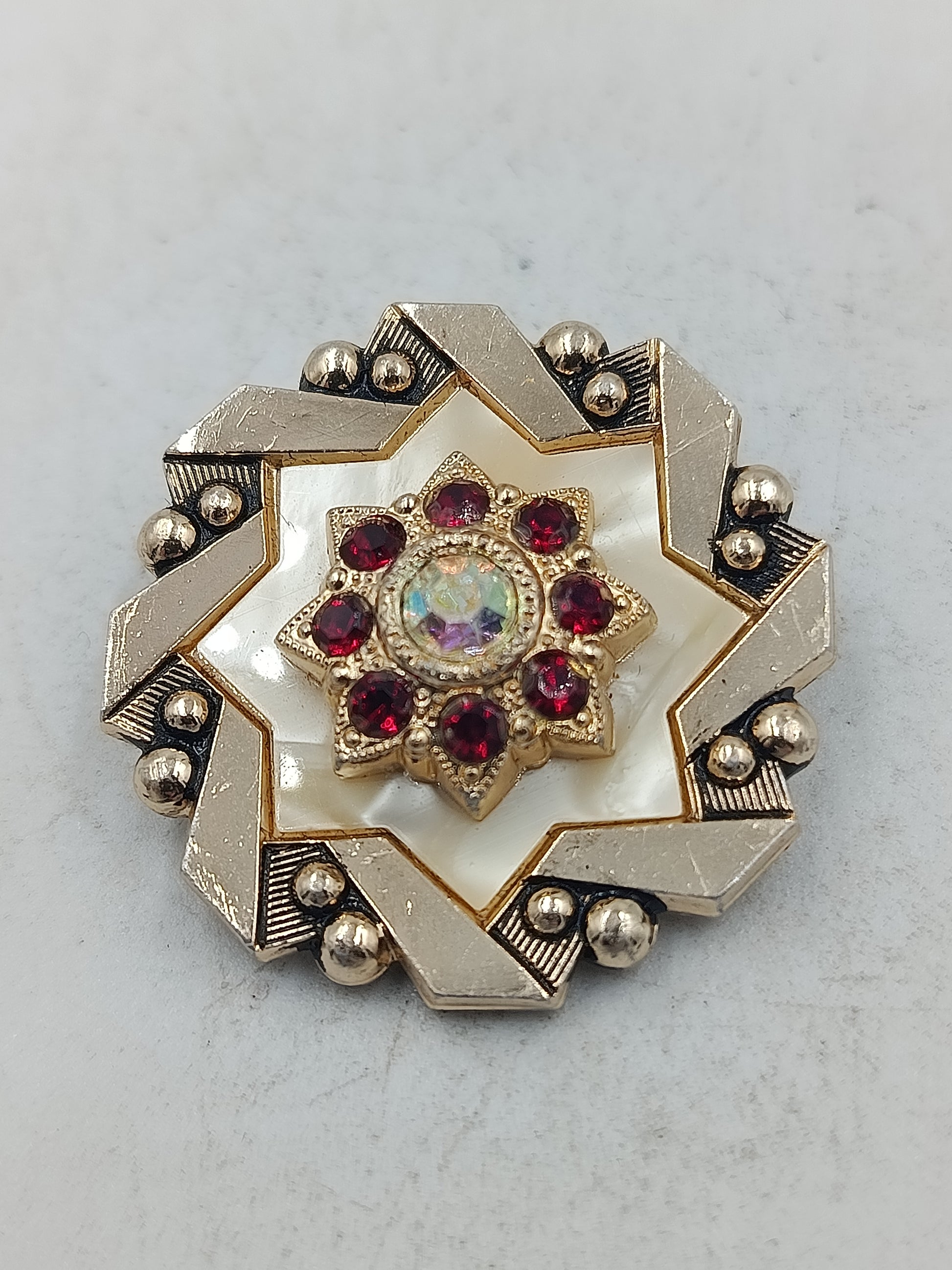 Diese auffällige Brosche besticht durch ihr kunstvolles Design in warmer Goldoptik kombiniert mit einem sternförmigen Aufbau und leuchtend roten Schmucksteinen Im Zentrum befindet sich ein irisierender Stein der je nach Lichteinfall schimmert Die geometrische Form und die detailreiche Verarbeitung verleihen dem Schmuckstück eine besondere Ausstrahlung Ideal als Blickfang an Jacke Mantel Kleid oder Schal Ein charakterstarkes Accessoire mit Vintage Anmutung