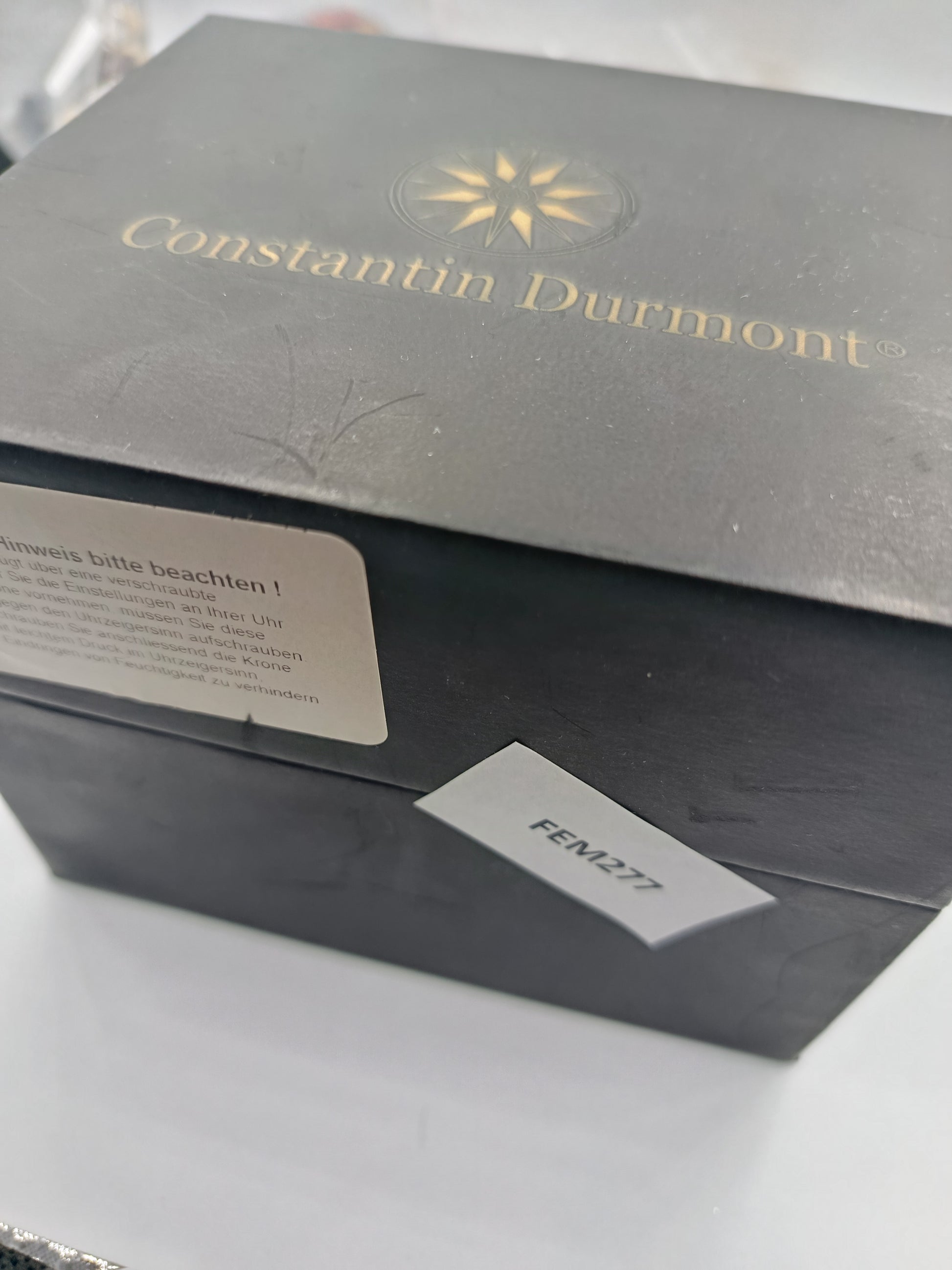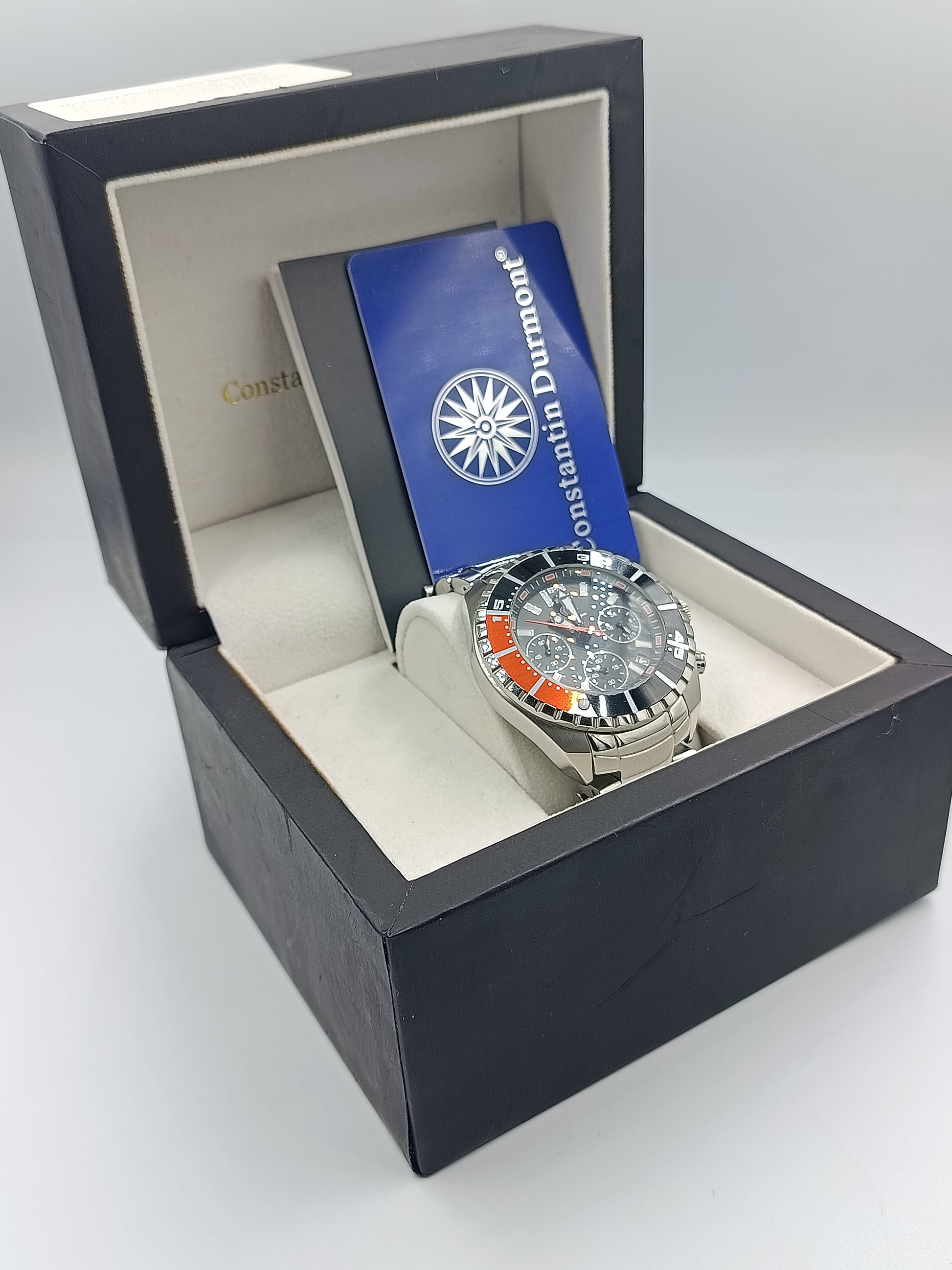 Sportlicher und robuster Herrenchronograph der Marke Constantin Durmont. Das massive Edelstahlgehäuse kombiniert mit einem Gliederarmband sorgt für eine markante Präsenz am Handgelenk. Das schwarze Zifferblatt mit roten und weißen Akzenten sowie die Chronographenfunktionen verleihen der Uhr einen dynamischen Look. Wird in der Originalbox mit Garantiekarte geliefert – perfekt für Sammler oder als Geschenk.