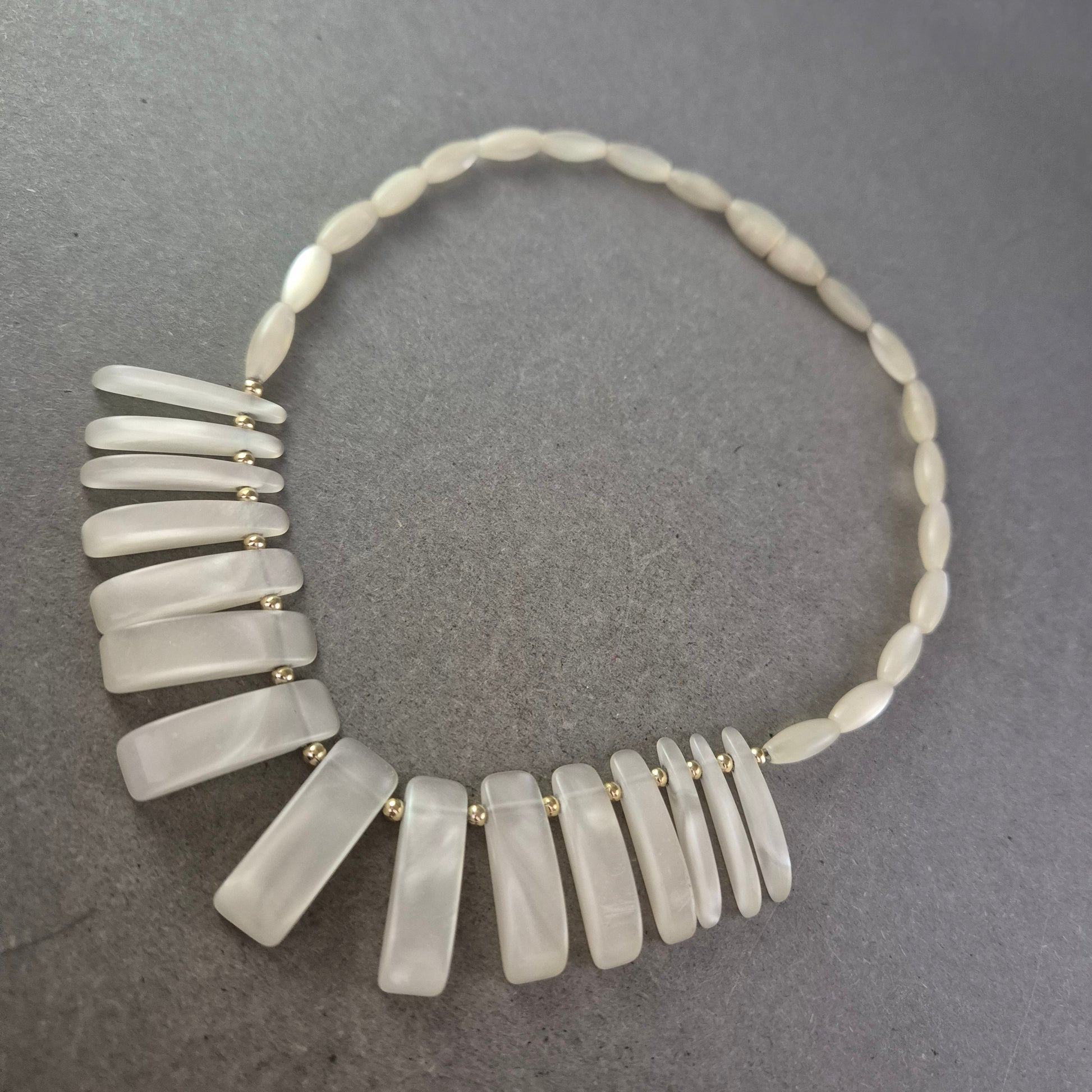 Diese einzigartige Damen Kette besticht durch ihre faszinierende Kombination aus zarten Perlmutt-Tönen und länglichen, fächerförmig angeordneten Elementen. Der obere Teil der Kette besteht aus ovalen Perlen, die sanft in die auffälligeren Perlmutt-Stücke übergehen, welche mit kleinen goldenen Akzenten verziert sind. Ein elegantes Statement-Schmuckstück, das jedem Ausschnitt eine besondere Note verleiht.