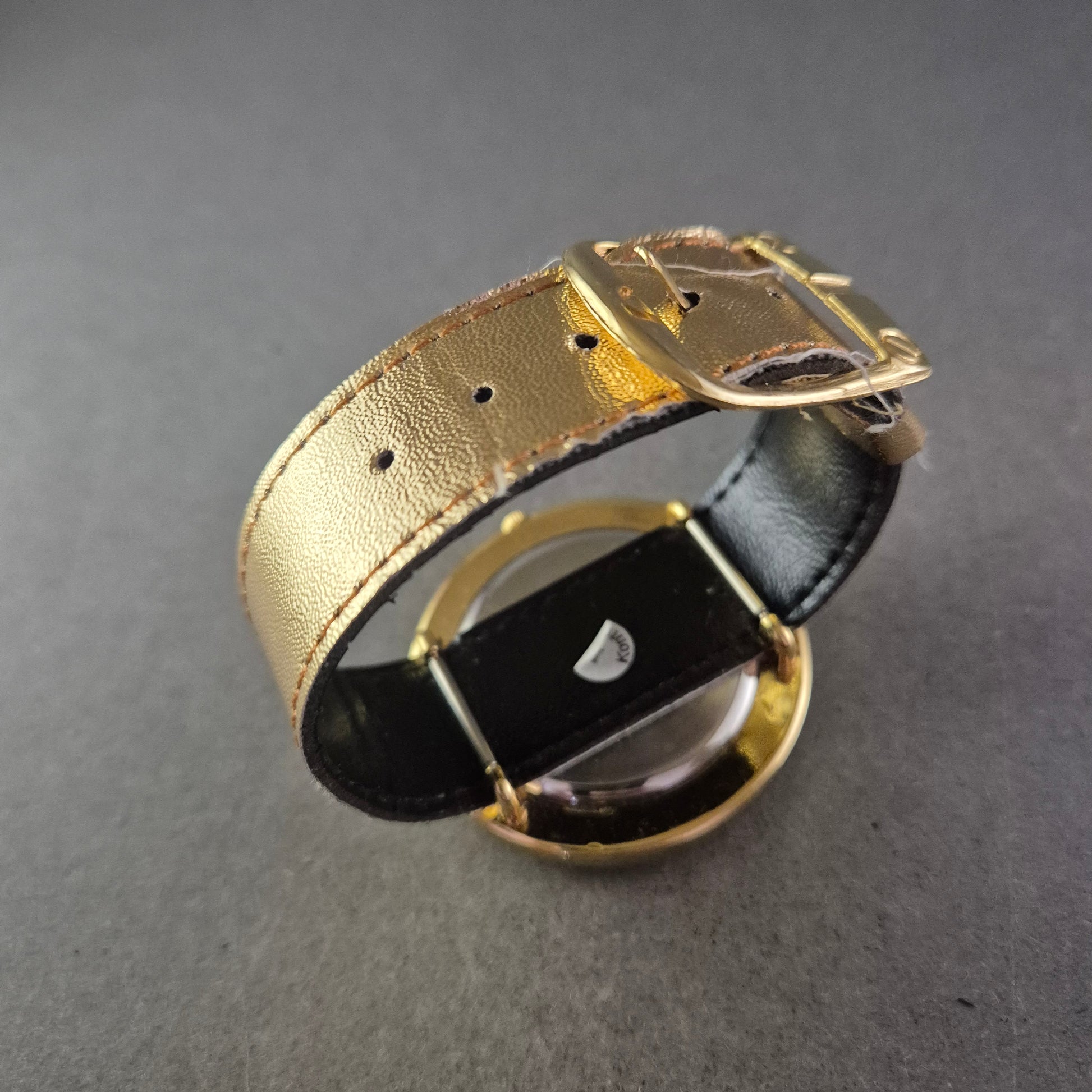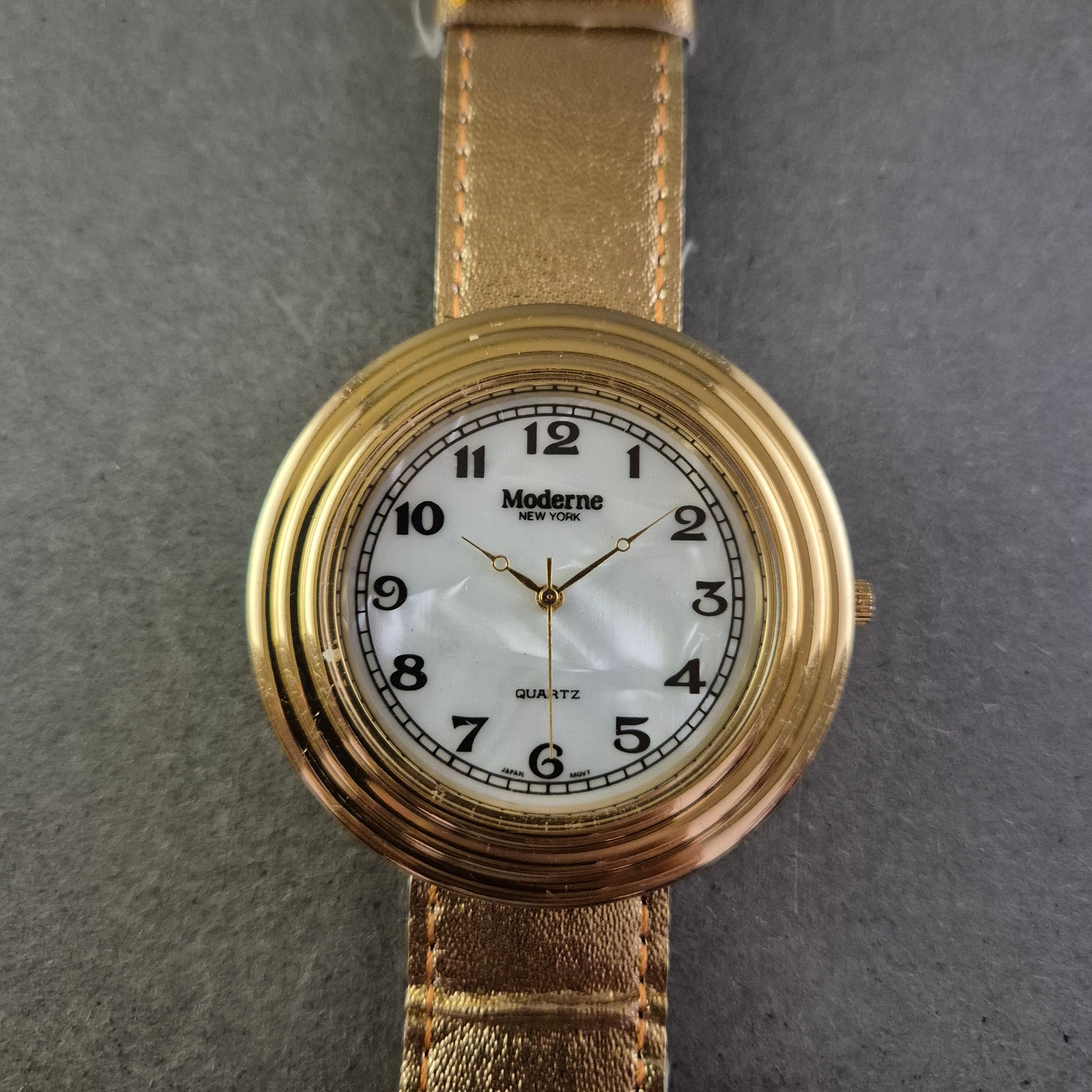 Diese stilvolle Damen Uhr von Moderne New York besticht durch ihr edles goldfarbenes Design und das schimmernde Perlmutt-Zifferblatt. Die klaren schwarzen Ziffern heben sich elegant ab und sorgen für eine gute Ablesbarkeit. Mit ihrem glamourösen Lederarmband ist diese Uhr ein modisches Statement für Damen, die sowohl Eleganz als auch zeitgemäßes Design schätzen.