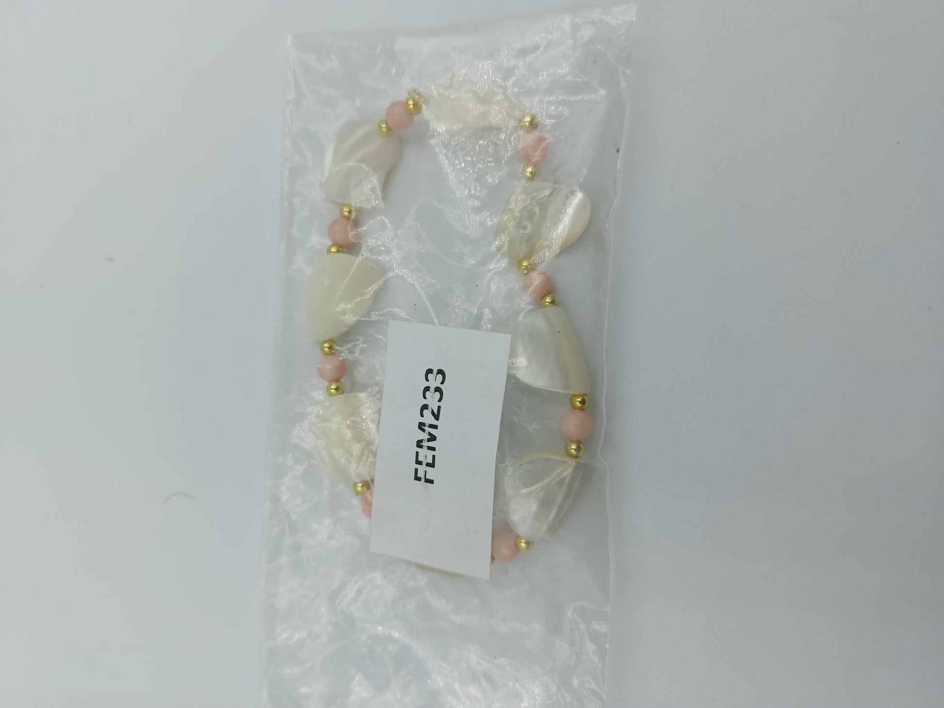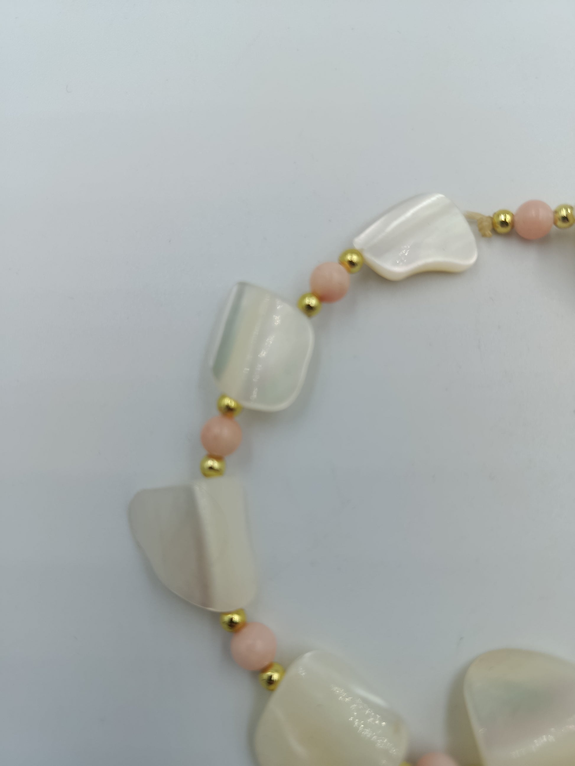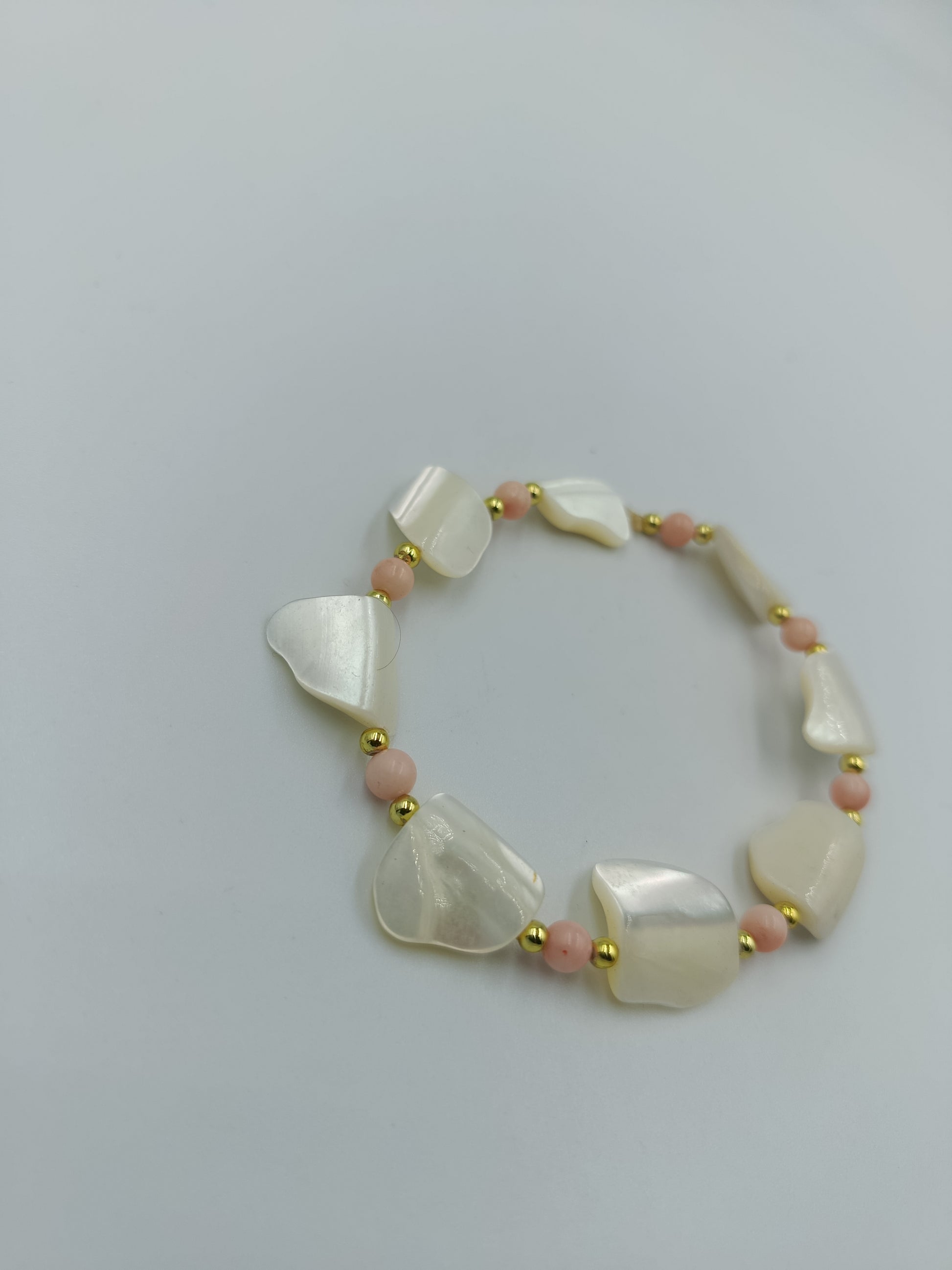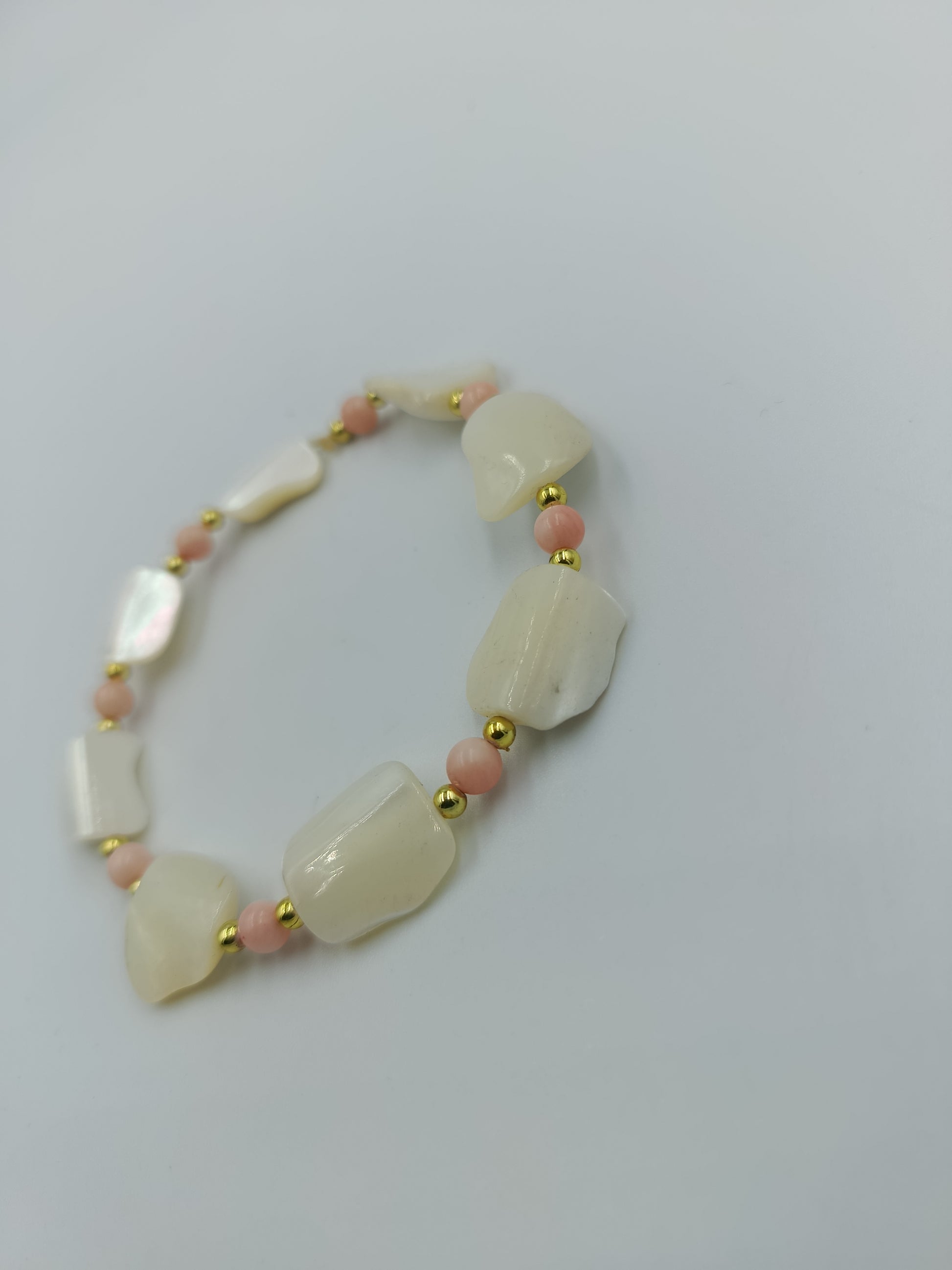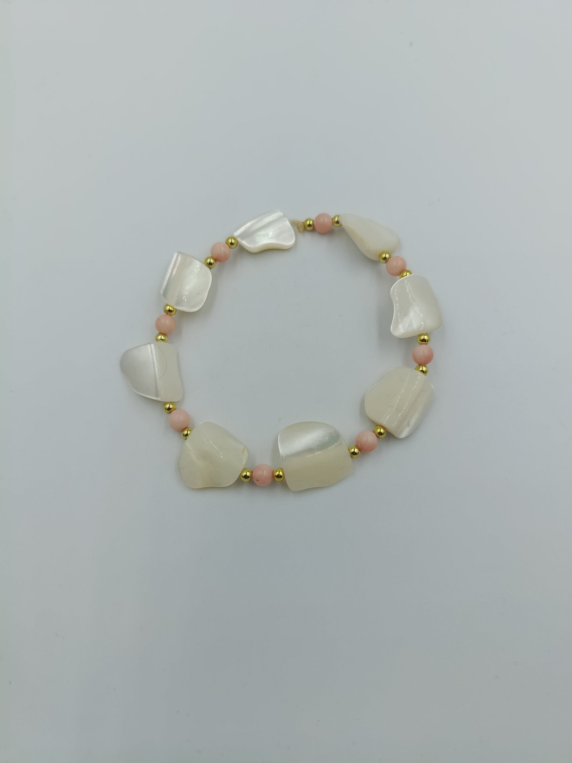 Elegantes, dehnbares Armband mit unregelmäßig geformten, weißen Muschel-Elementen, kombiniert mit zarten rosafarbenen Perlen und kleinen goldfarbenen Zwischenperlen. Durch das elastische Band passt es sich bequem dem Handgelenk an und lässt sich leicht an- und ausziehen.