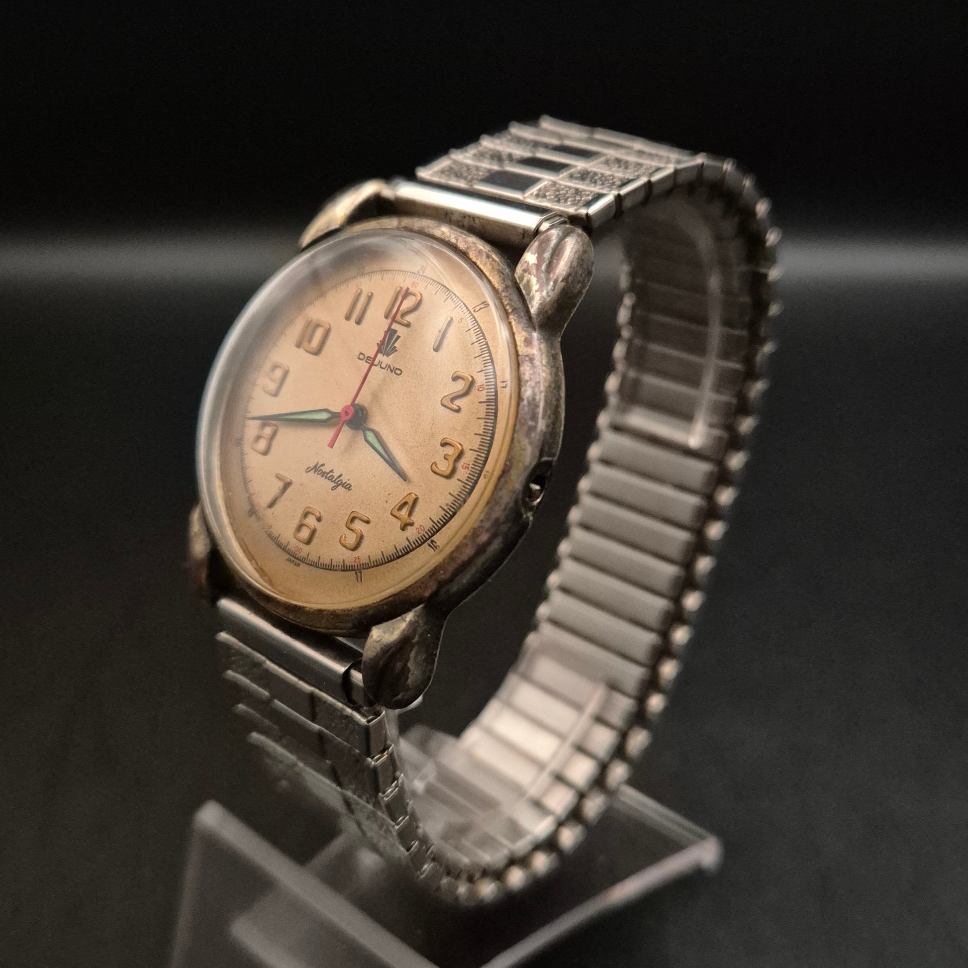 Diese DeJuno Herren Uhr aus der „Nostalgia“-Kollektion verbindet Retro-Charme mit funktionalem Design. Das Zifferblatt mit großen, goldfarbenen Ziffern und leuchtenden Zeigern sorgt für eine gute Ablesbarkeit. Besonders auffällig ist das strukturierte Stretch-Armband in Silberoptik. Achtung: Die Krone fehlt, daher nur als Ersatzteil oder Deko geeignet.