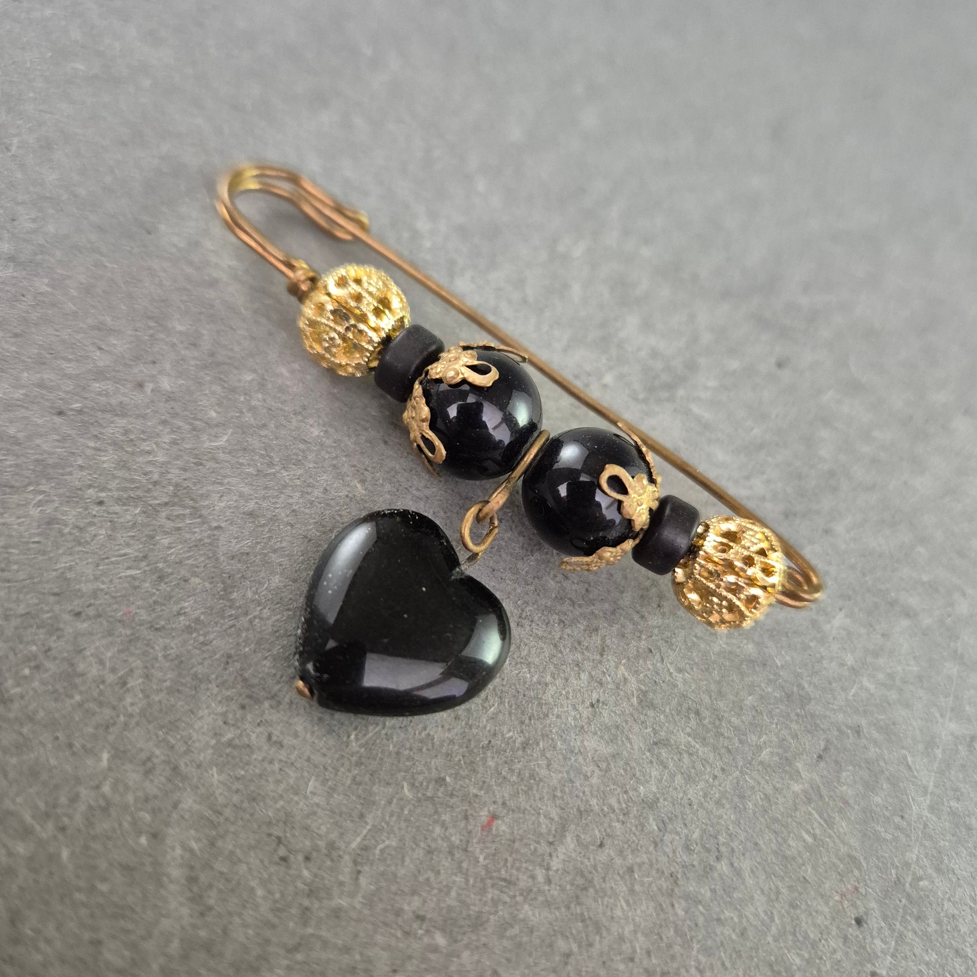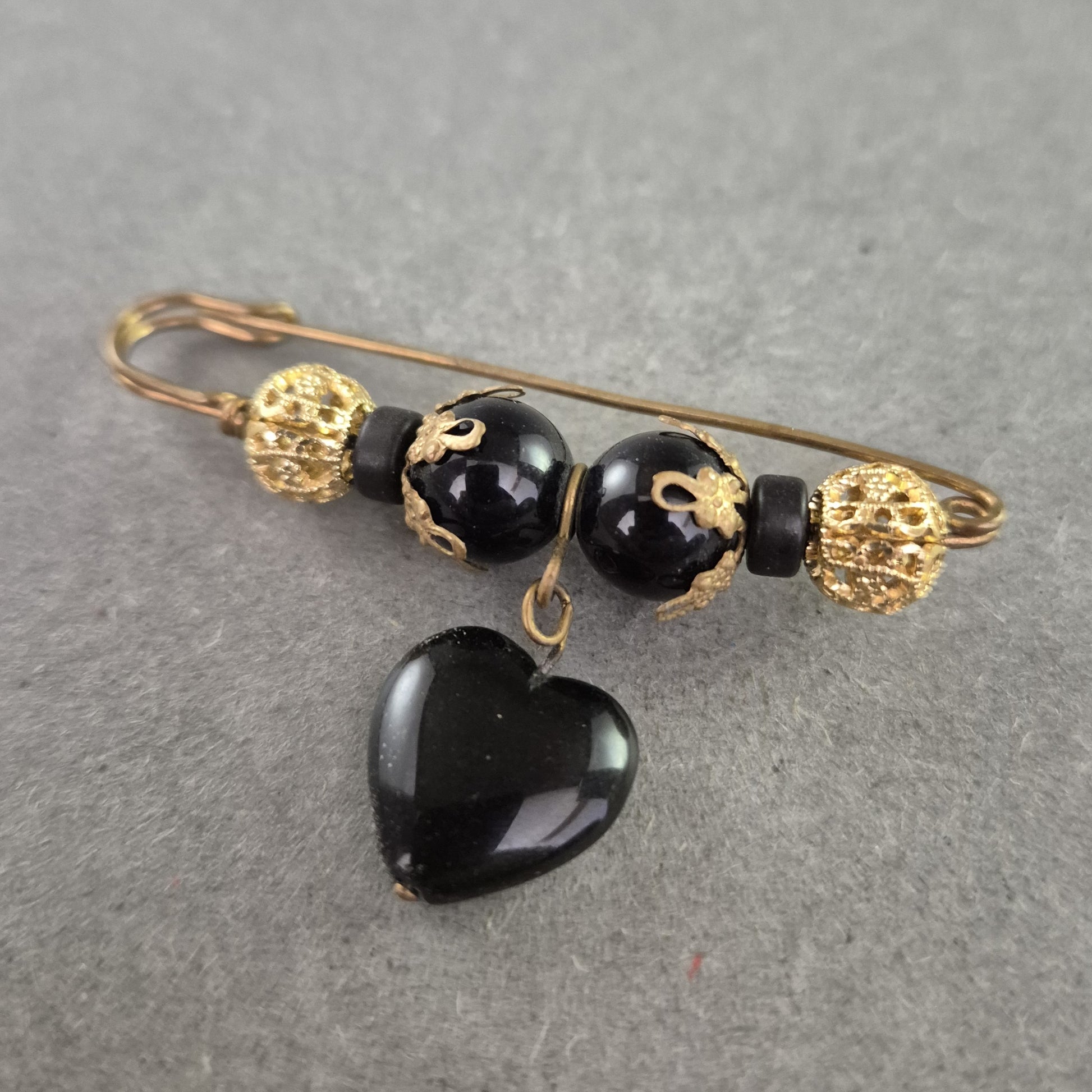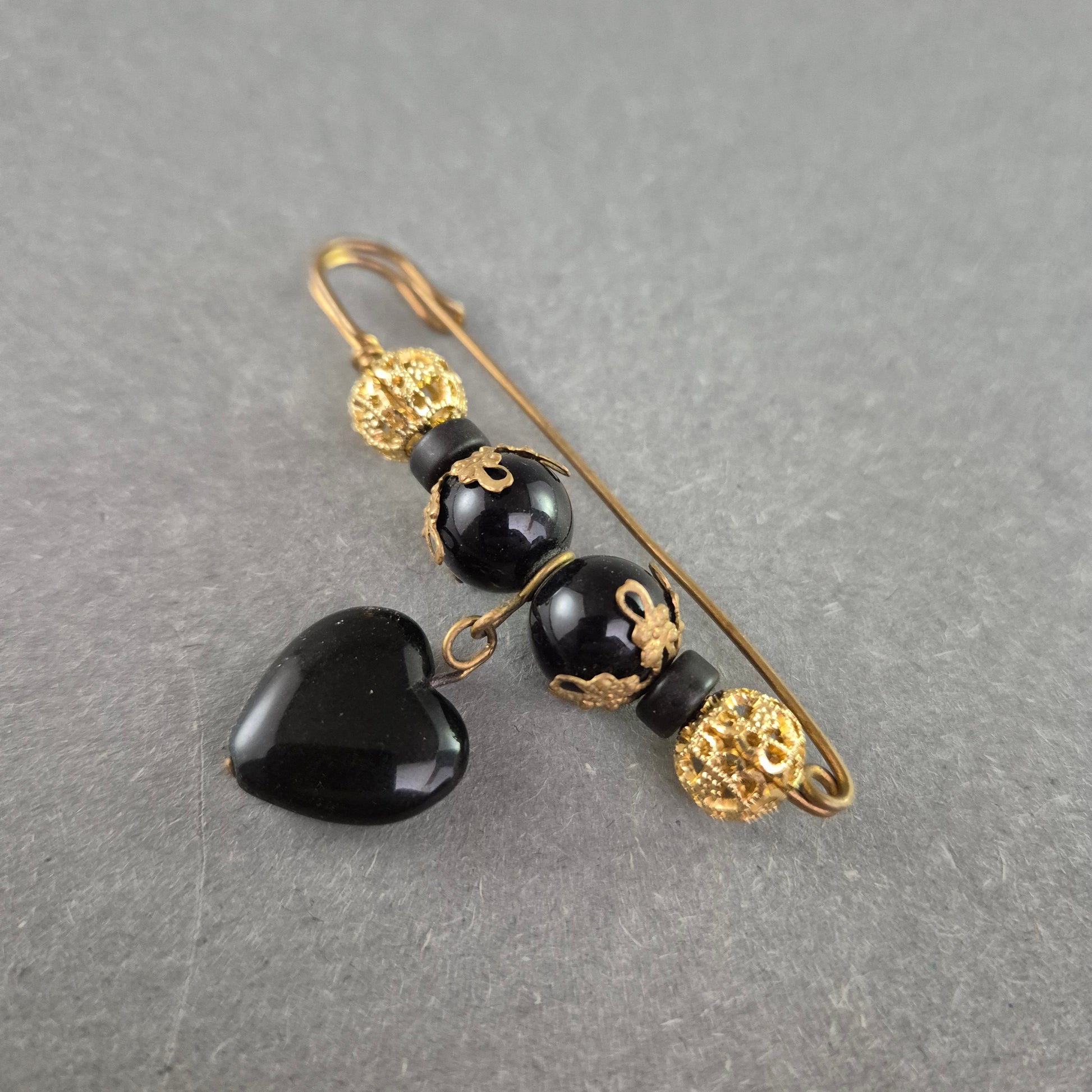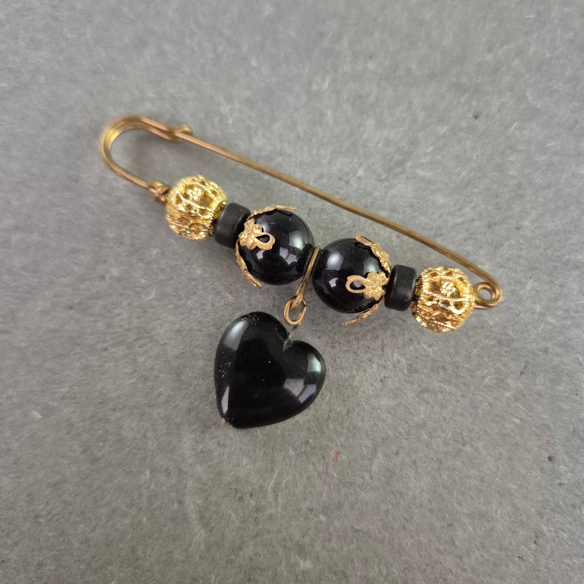 Dekorative Sicherheitsnadel mit schwarzem Herzanhänger – Vintage-Chic