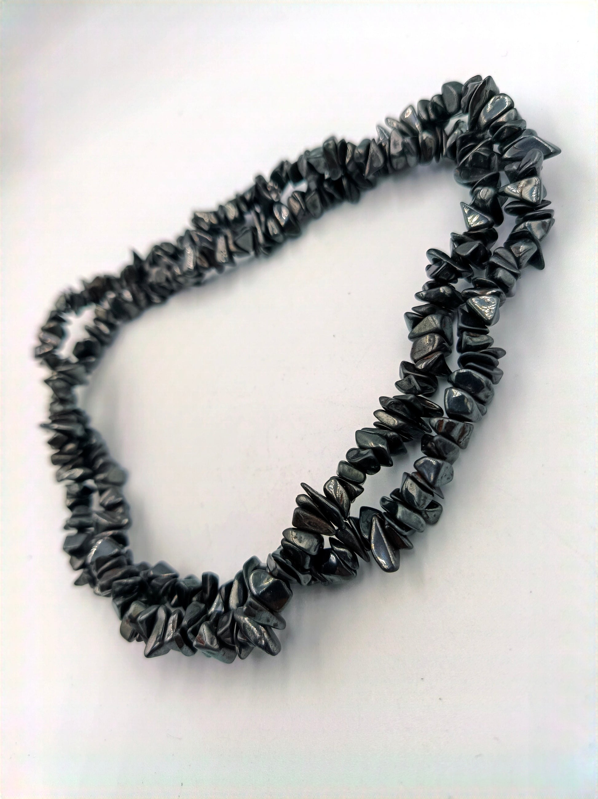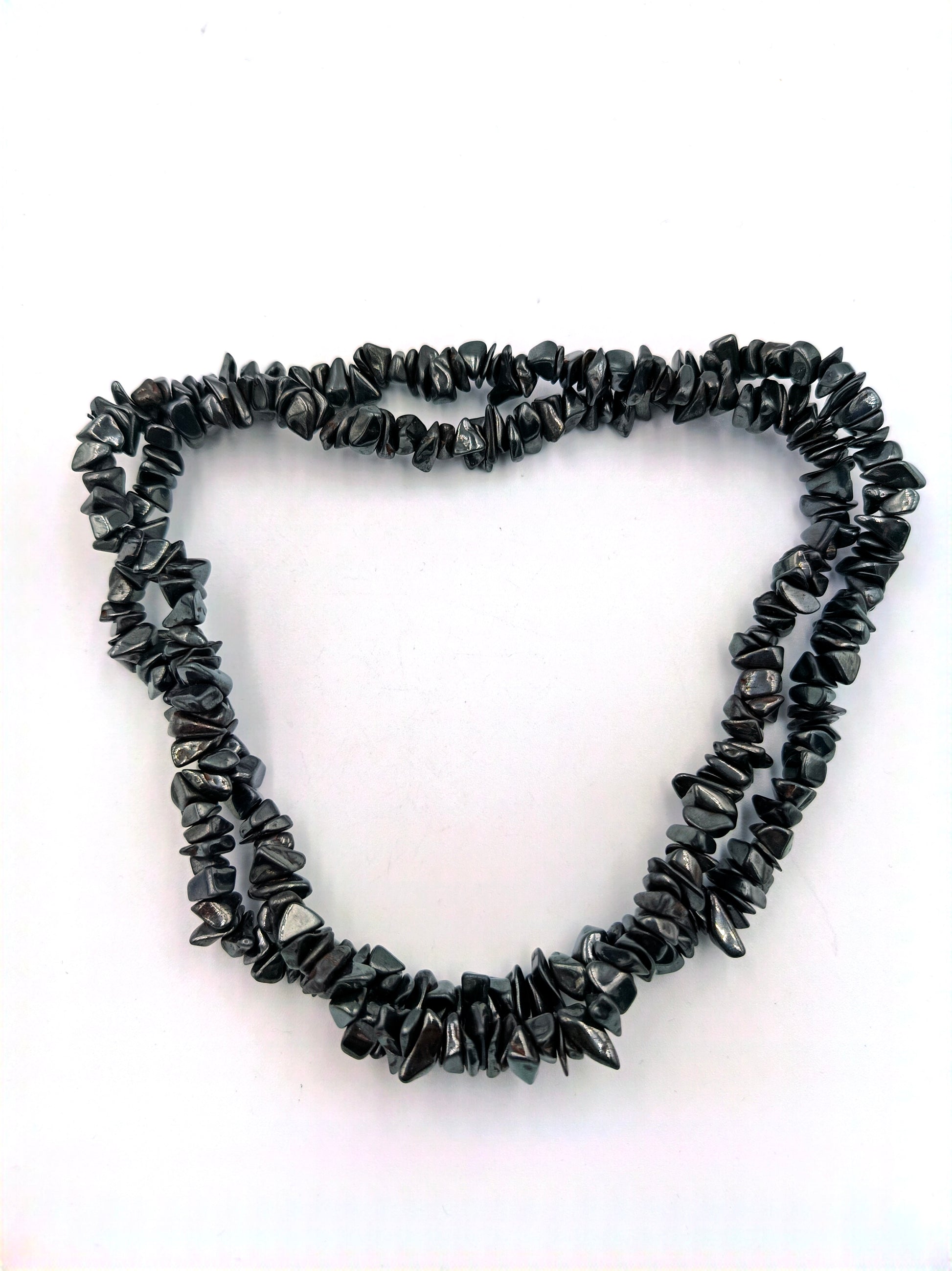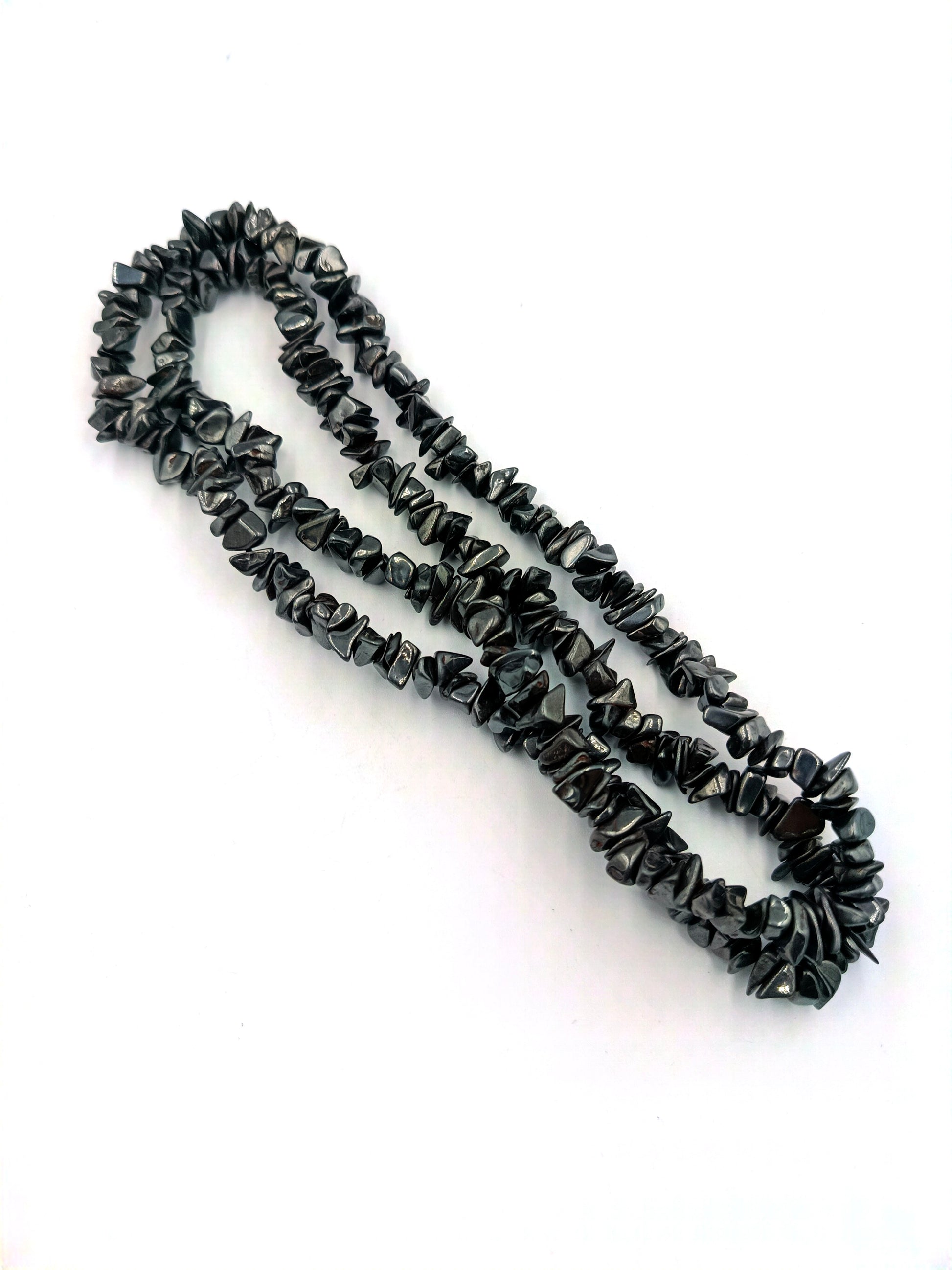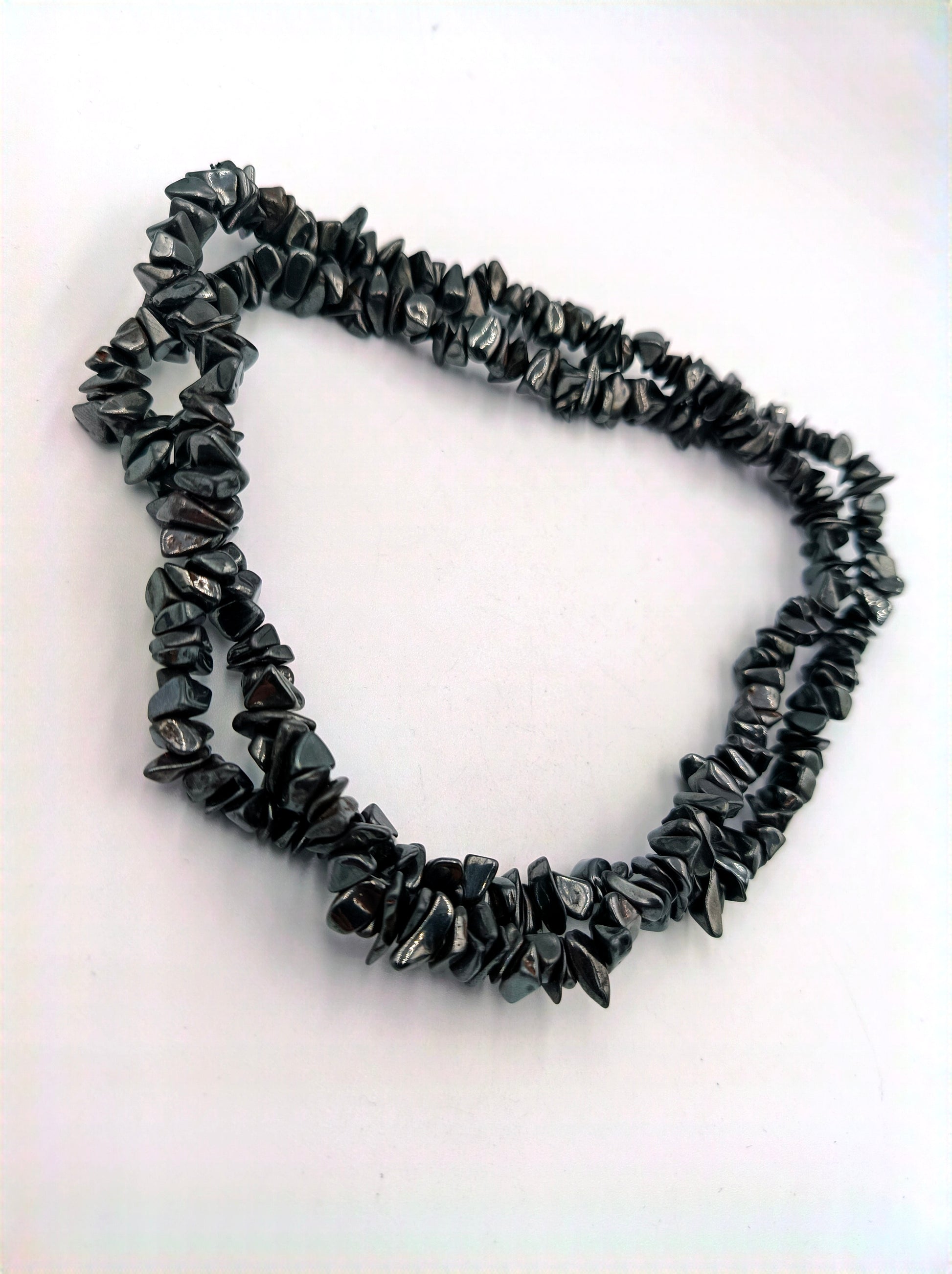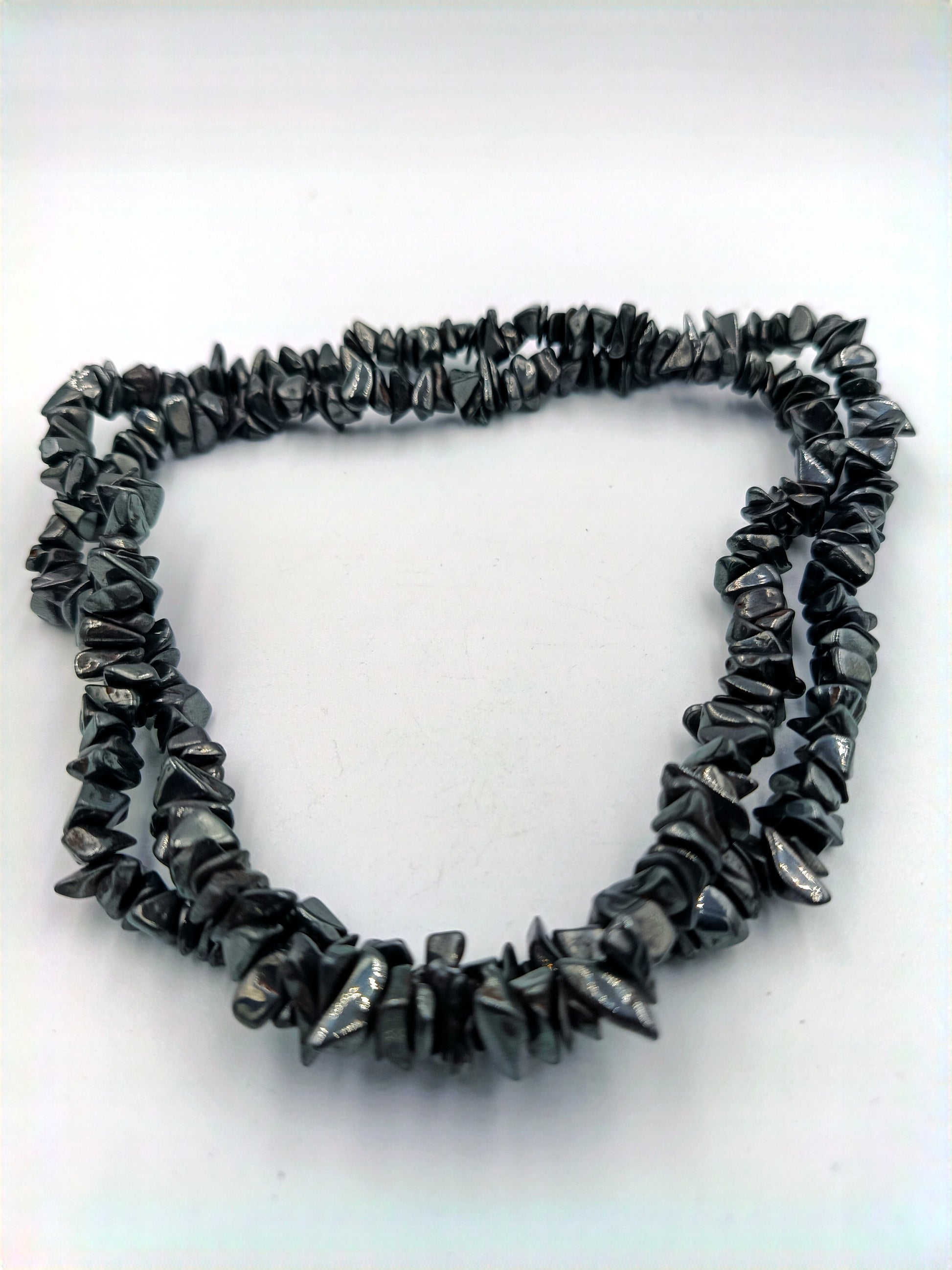 Diese auffällige Halskette besteht aus zwei Strängen mit polierten Hämatit-Splittern. Das tiefgraue, metallisch glänzende Material sorgt für eine edle und zugleich moderne Ausstrahlung. Die Kette kann einzeln oder in Kombination mit weiteren Schmuckstücken getragen werden und ist ein ausdrucksstarkes Accessoire für Liebhaber von Natursteinen.