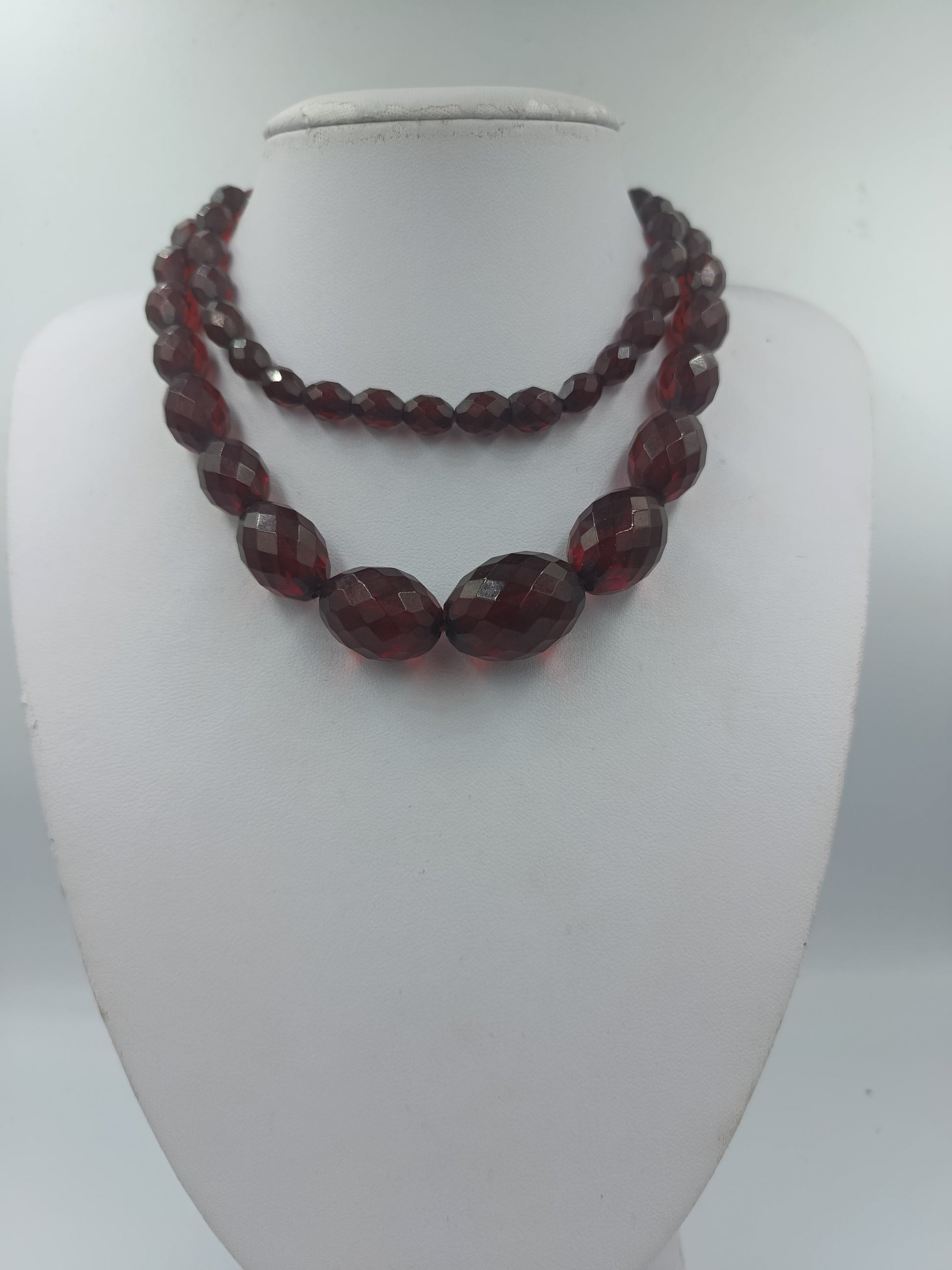 Wunderschöne zweireihige Halskette aus tief rotbraunen, facettierten Glasperlen, die im Licht einen edlen Glanz entfalten. Das elegante Design mit abgestuften Perlengrößen verleiht dieser Kette einen klassischen, luxuriösen Look – perfekt für elegante Anlässe oder als edles Accessoire im Alltag.