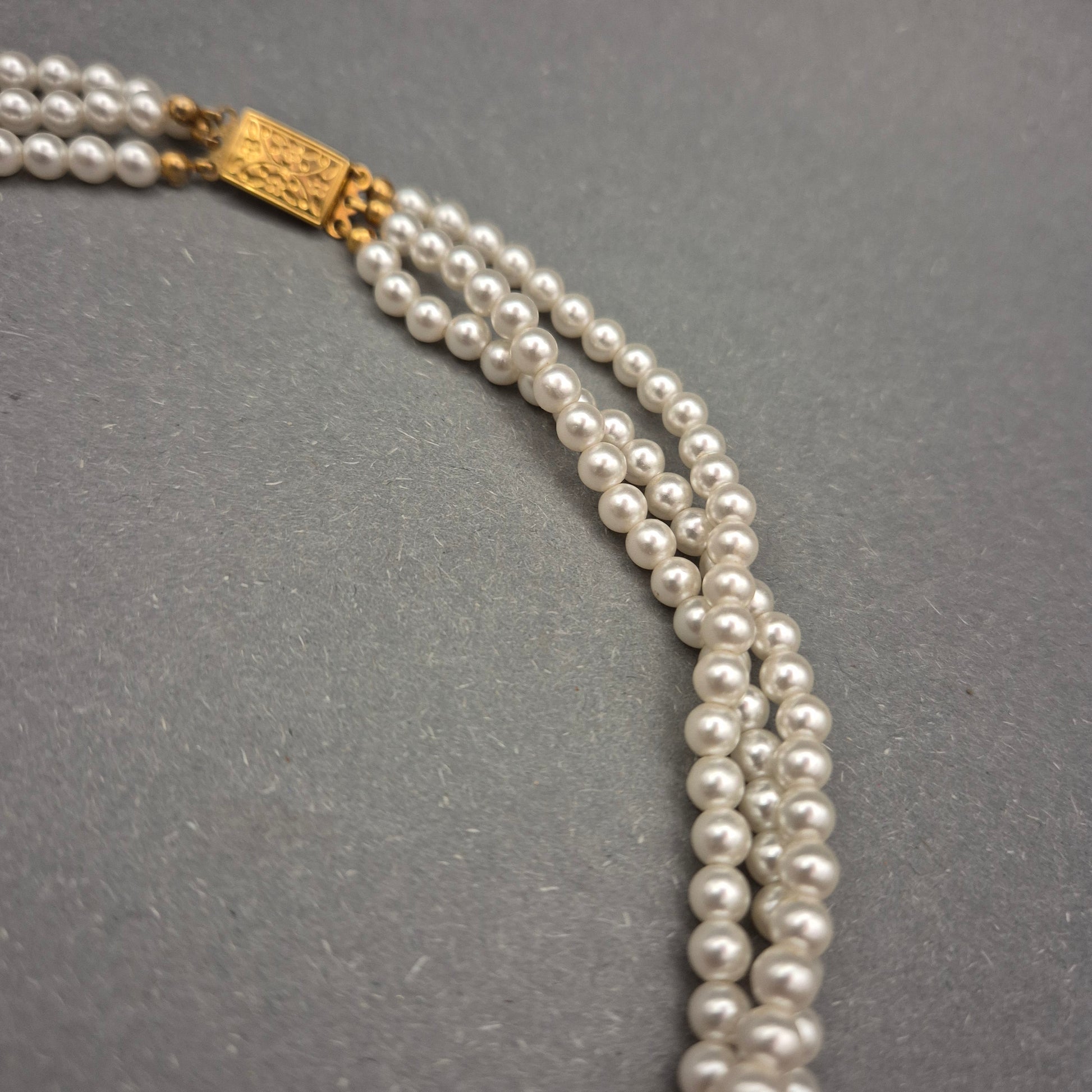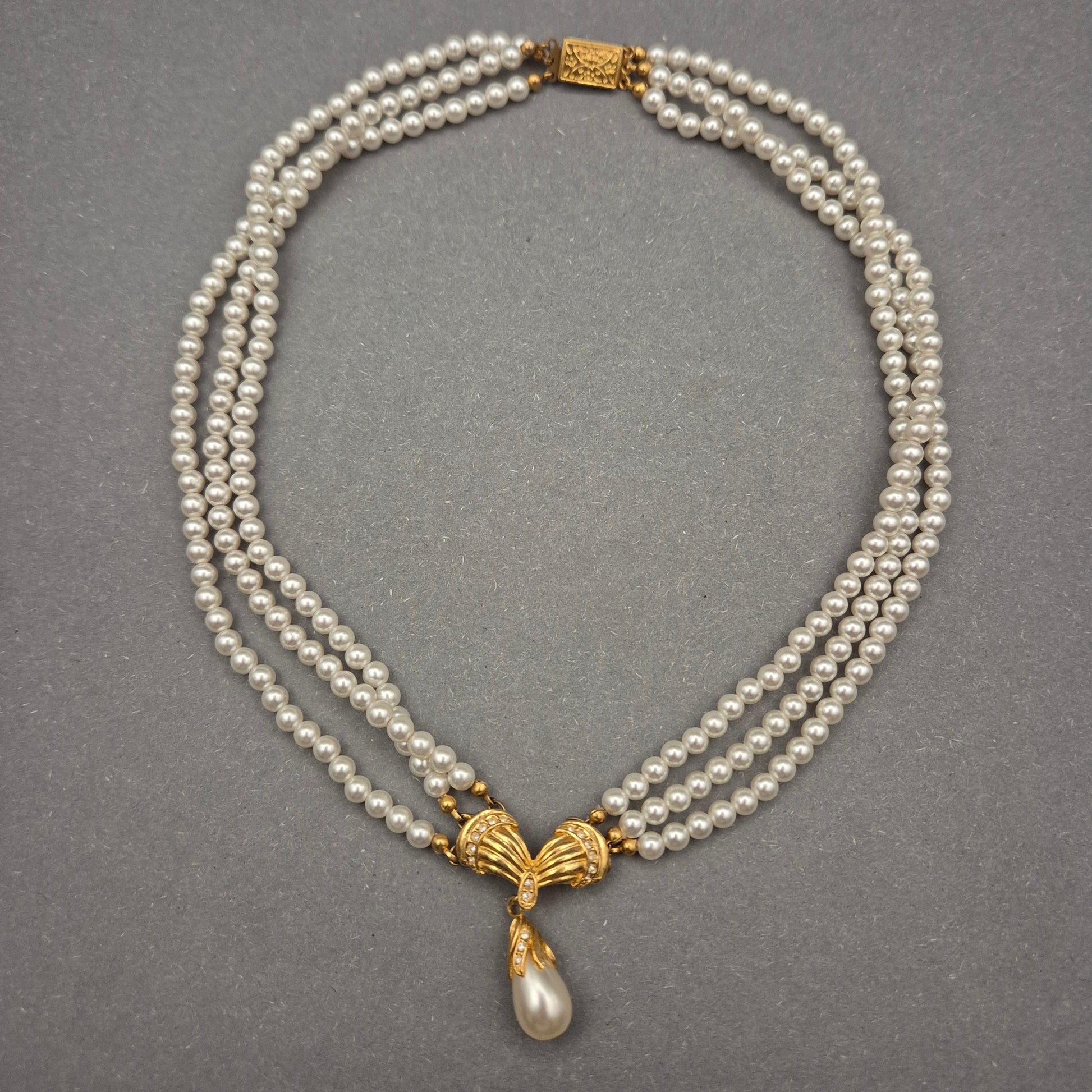 Diese edle Perlenkette mit drei feinen Strängen besticht durch ihre klassische Form und luxuriöse Ausstrahlung. Der goldfarbene Mittelteil mit funkelnden Details trägt einen stilvollen Tropfenanhänger, der das Schmuckstück zu einem eleganten Blickfang macht. Perfekt für festliche Anlässe oder besondere Momente mit nostalgischem Flair.
