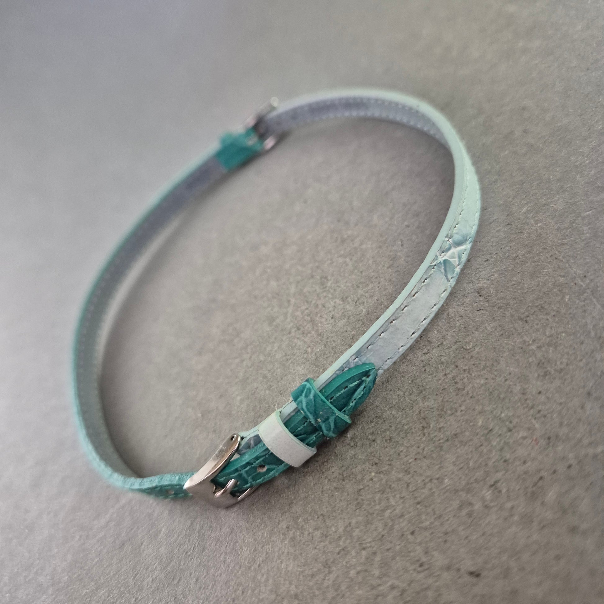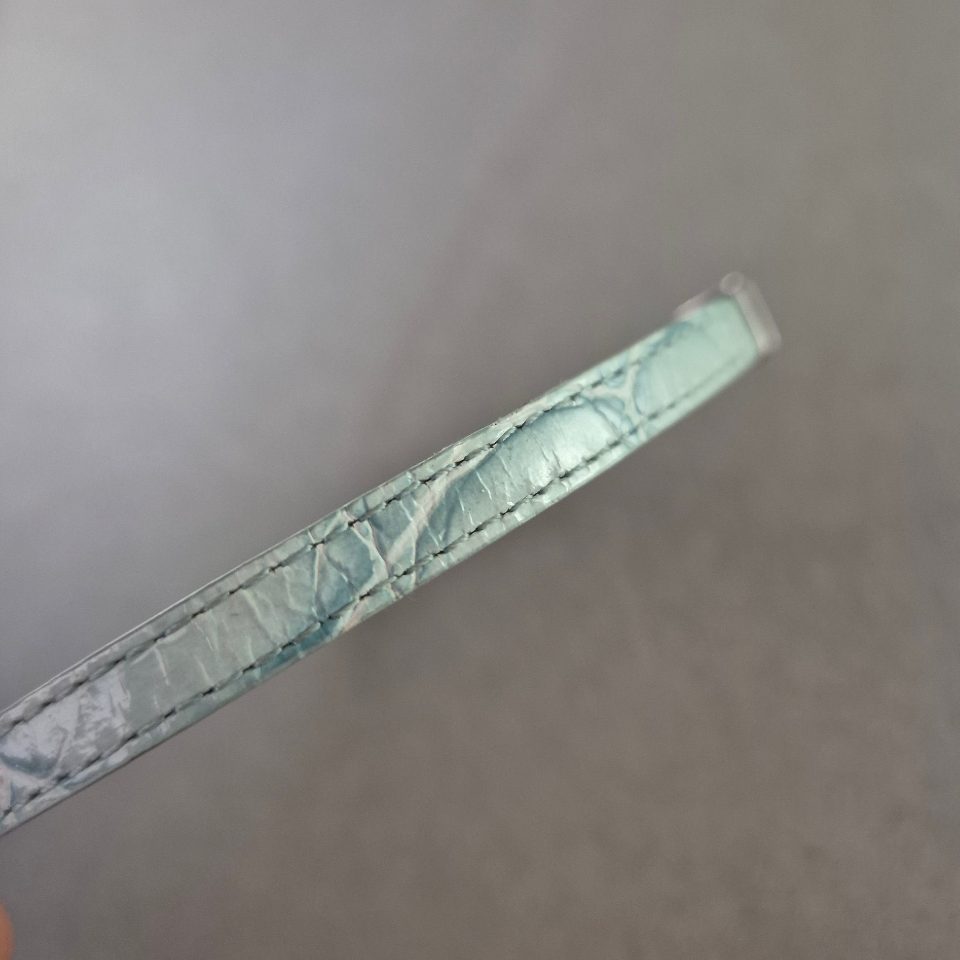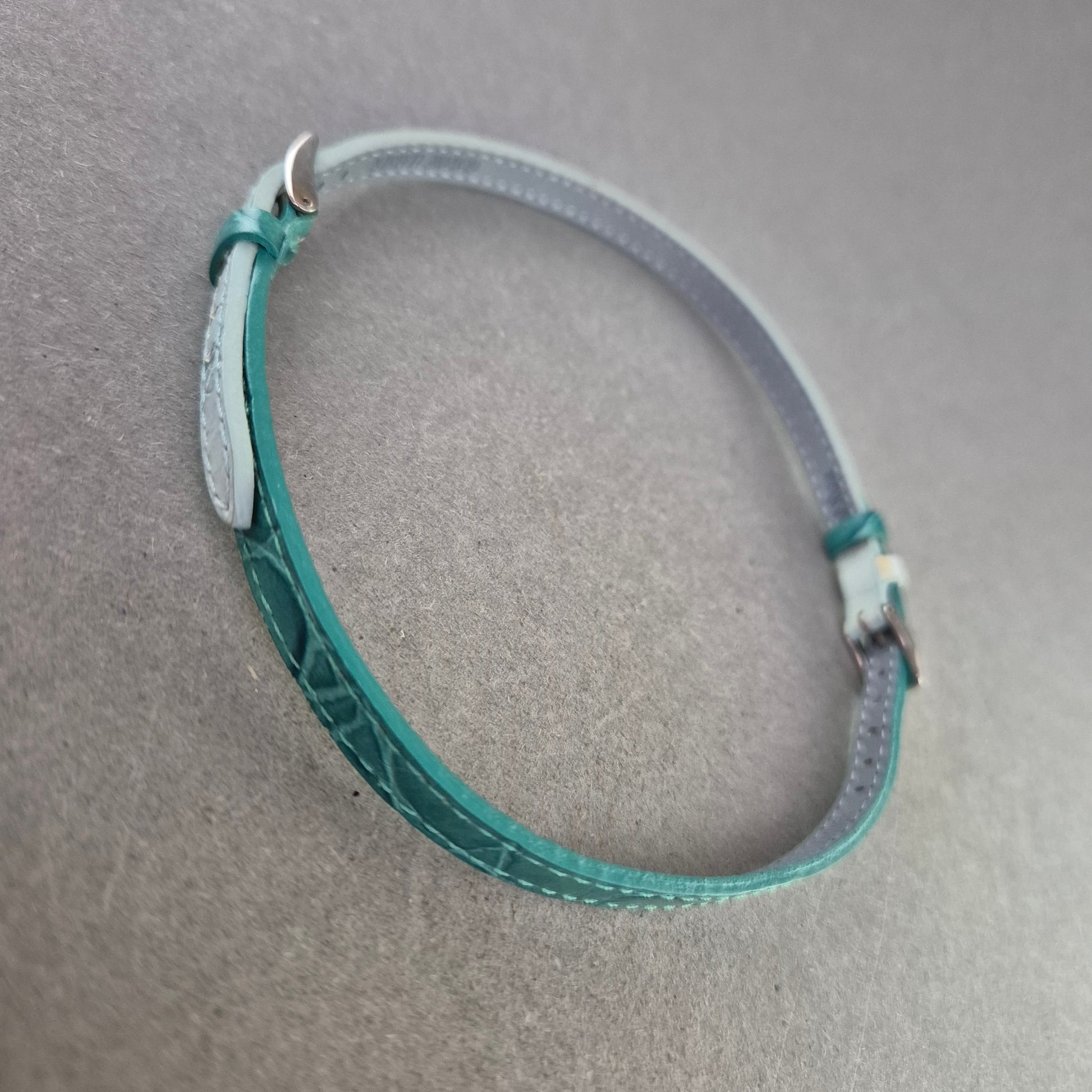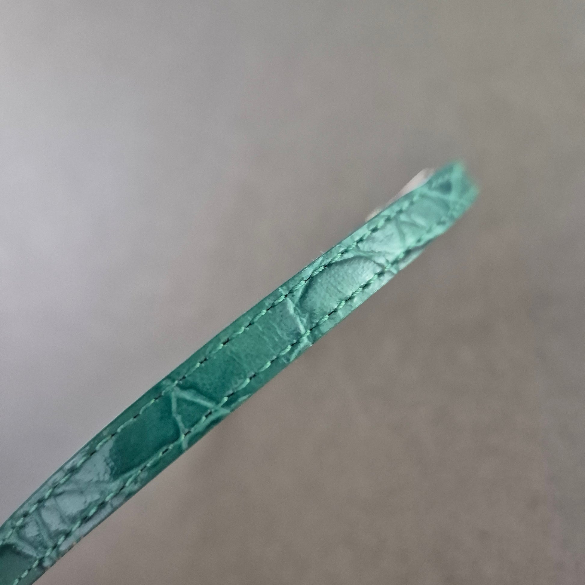 Dieses zierliche Armband aus türkisfarbenem Kunstleder besticht durch seine elegante Krokodilprägung und die klassische Dornschließe. Es eignet sich ideal als dezentes Accessoire für den Alltag oder als Ersatzband für besonders schmale Uhrengehäuse. Die Kombination aus hellen Farbtönen und glänzender Oberfläche verleiht dem Band einen frischen, modischen Touch.