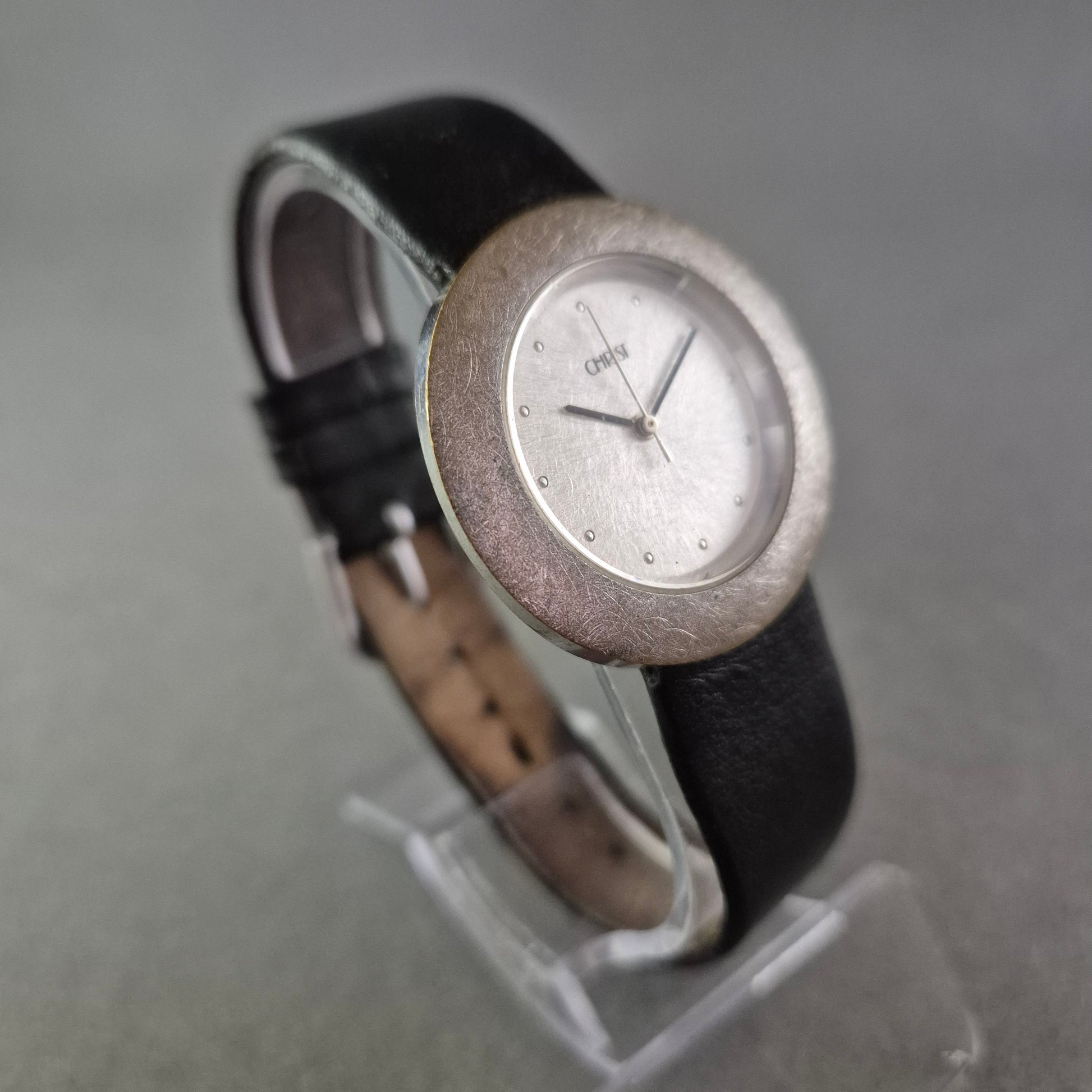 Diese elegante Damen Uhr der renommierten Marke Christ beeindruckt durch ihre schlichte Ästhetik und hochwertige Verarbeitung. Das silberfarbene Zifferblatt und Gehäuse mit gebürsteter Oberfläche verleiht der Uhr eine edle, fast seidenmatte Optik. Punktindizes und filigrane schwarze Zeiger unterstreichen das minimalistische Design. Ein schwarzes Lederarmband sorgt für angenehmen Tragekomfort – perfekt für Liebhaberinnen von puristischer Eleganz.