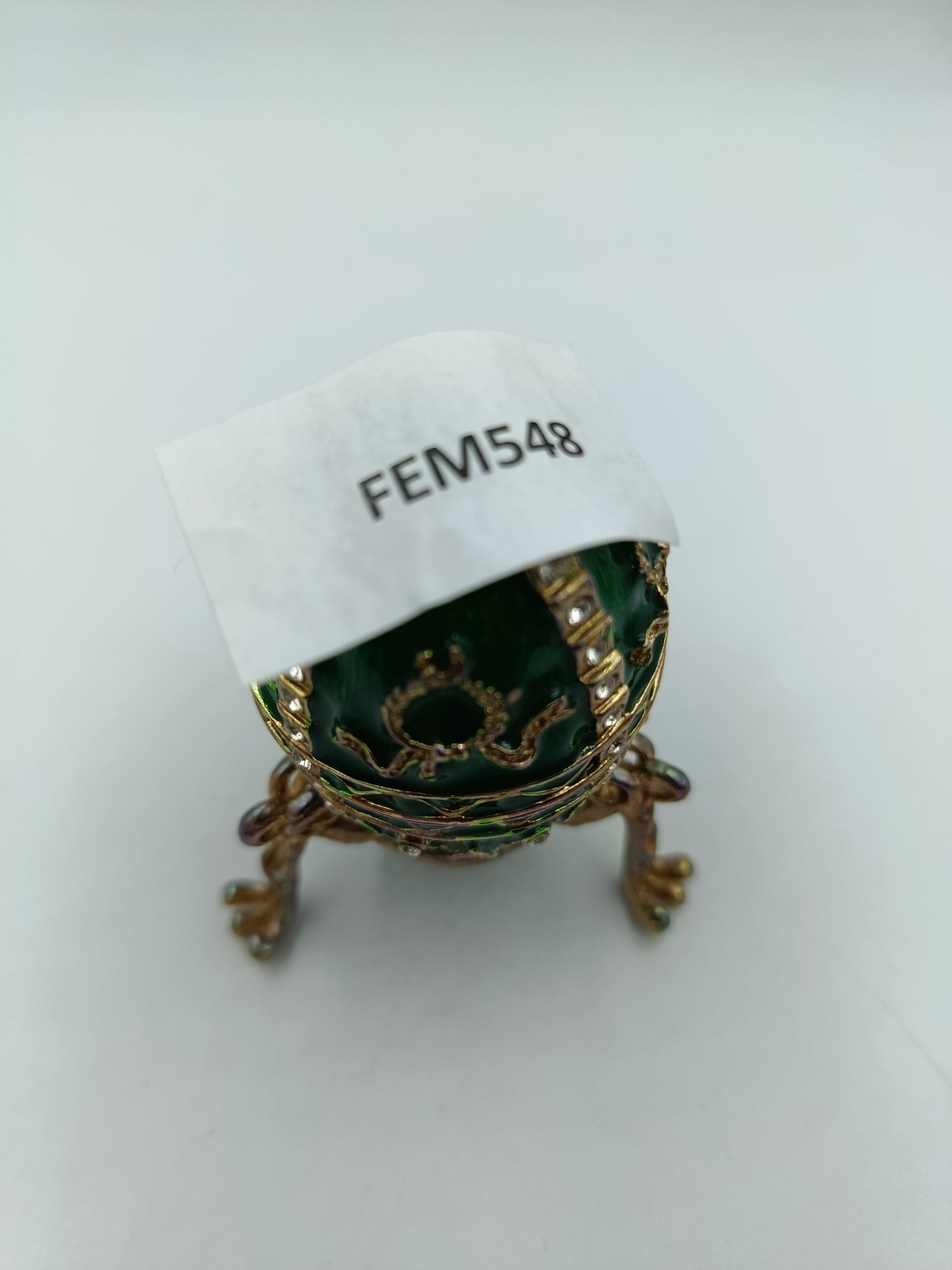 Diese aufwendig gearbeitete Schatulle im Fabergé-Stil besticht durch ihr tiefgrünes Emaille-Finish und ihre filigranen goldfarbenen Verzierungen. Funkelnde, klare Schmucksteine setzen elegante Akzente und verleihen der kleinen Schatulle einen luxuriösen Charakter. Ideal als Dekoobjekt, Sammlerstück oder zur stilvollen Aufbewahrung kleiner Kostbarkeiten.