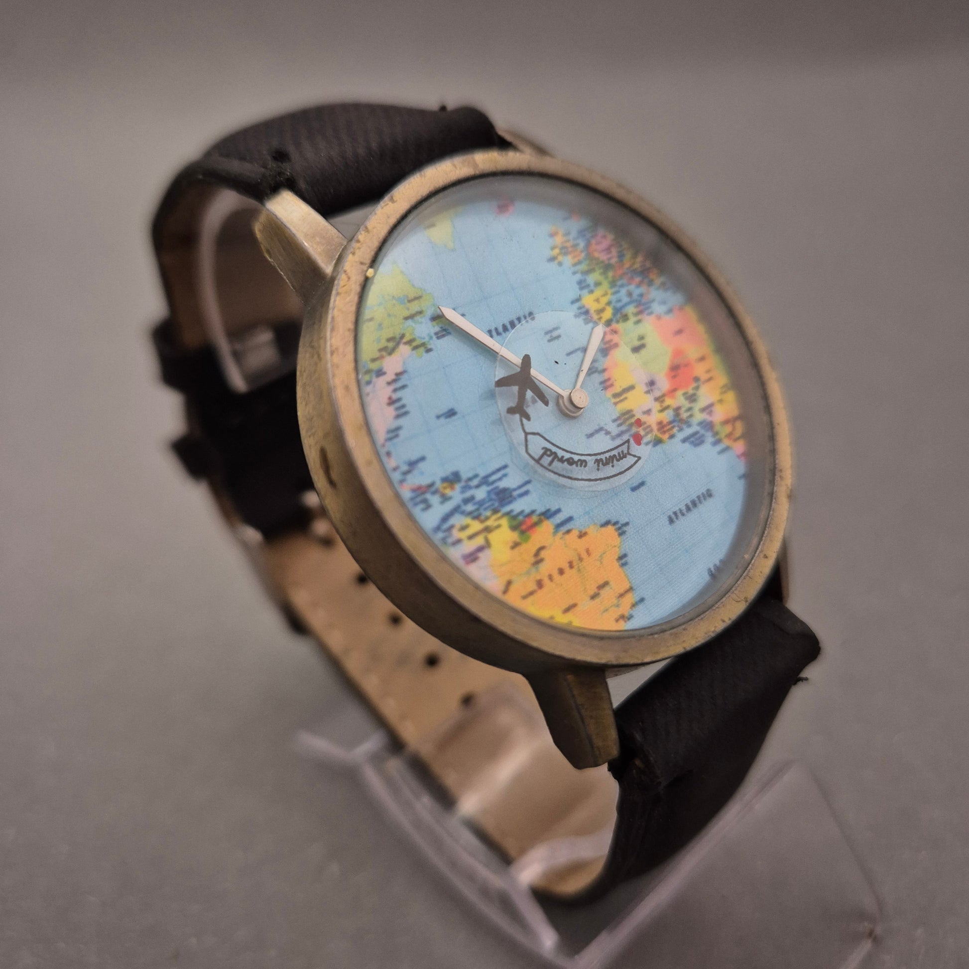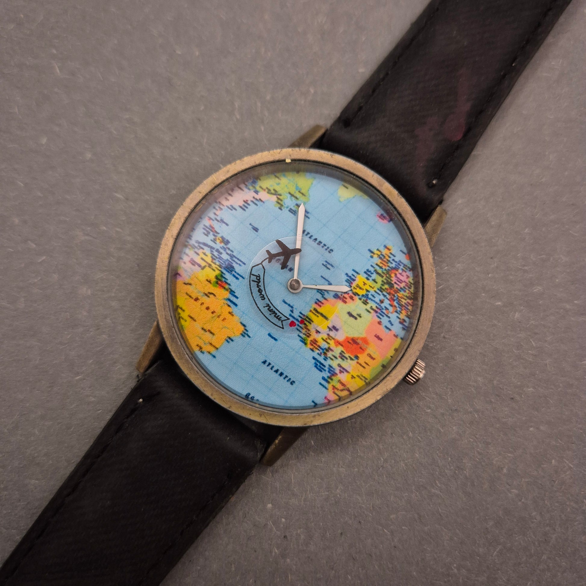 Diese Armbanduhr ist ein Muss für alle Reisebegeisterten und Globetrotter. Anstatt eines herkömmlichen Zifferblatts zeigt die Uhr eine farbenfrohe Weltkarte, die das Element des Abenteuers direkt auf das Handgelenk bringt. Das außergewöhnliche Design wird durch den Sekundenzeiger akzentuiert, der die Form eines kleinen Flugzeugs hat, das auf seinem "Traumreise" ("dream voyage") um die Welt kreist. Das Gehäuse ist in einer bronzefarbenen oder Antik-Optik gehalten und wird von einem klassischen schwarzen Kunstlederarmband gehalten. Ein echter Blickfang und Gesprächsanreger.