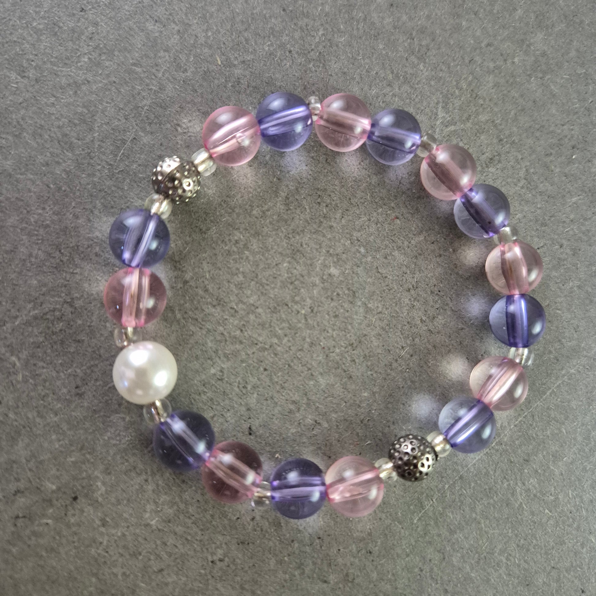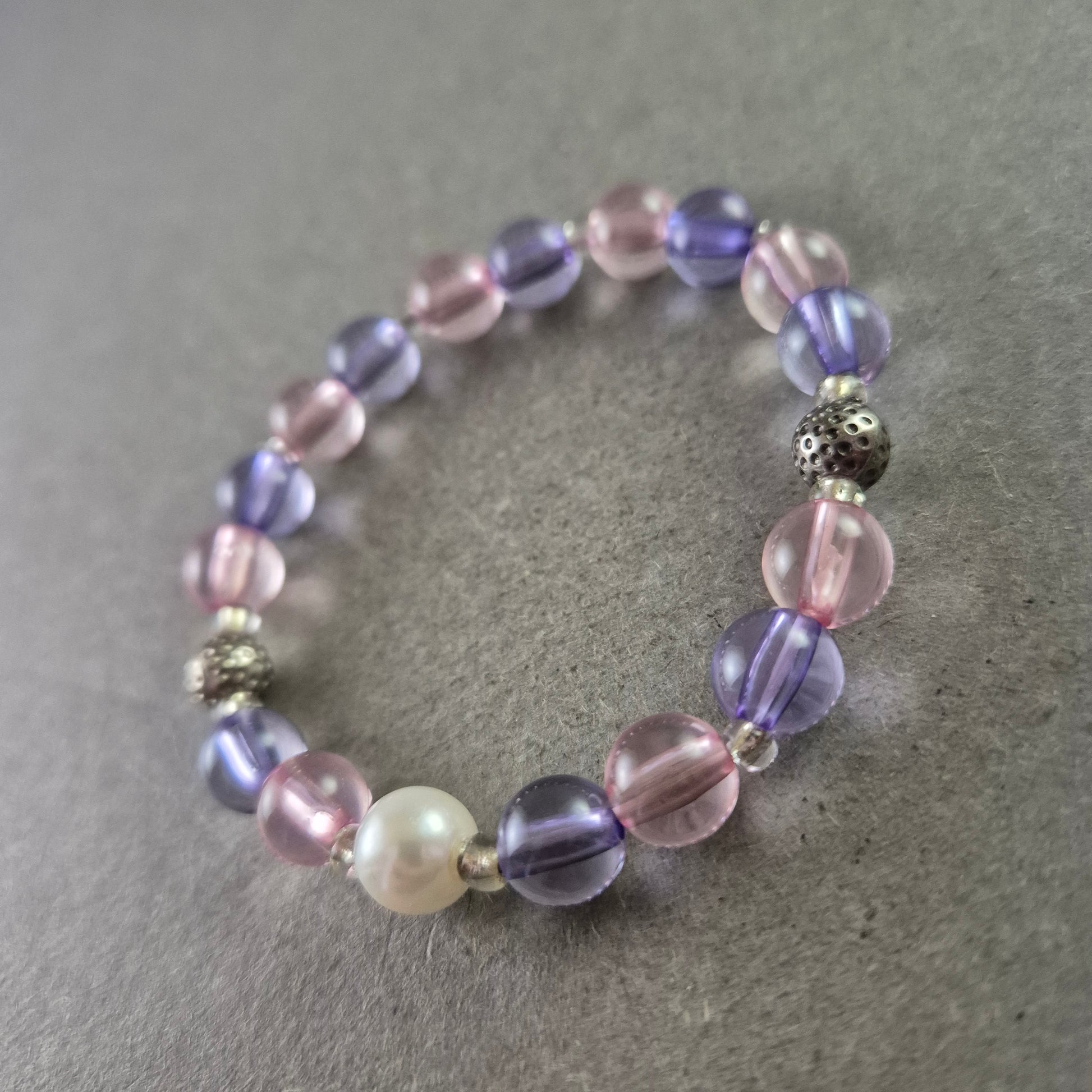Dieses zarte Armband besteht aus abwechselnd rosa und violetten Glasperlen, die ihm einen femininen und verspielten Charakter verleihen. Akzente setzen kleine silberfarbene Zwischenelemente sowie eine weiße Perle, die das Design harmonisch abrundet. Durch das elastische Band lässt sich das Armband bequem an- und ablegen und passt sich verschiedenen Handgelenkgrößen flexibel an.