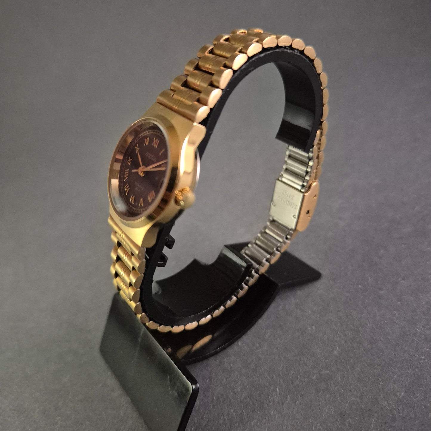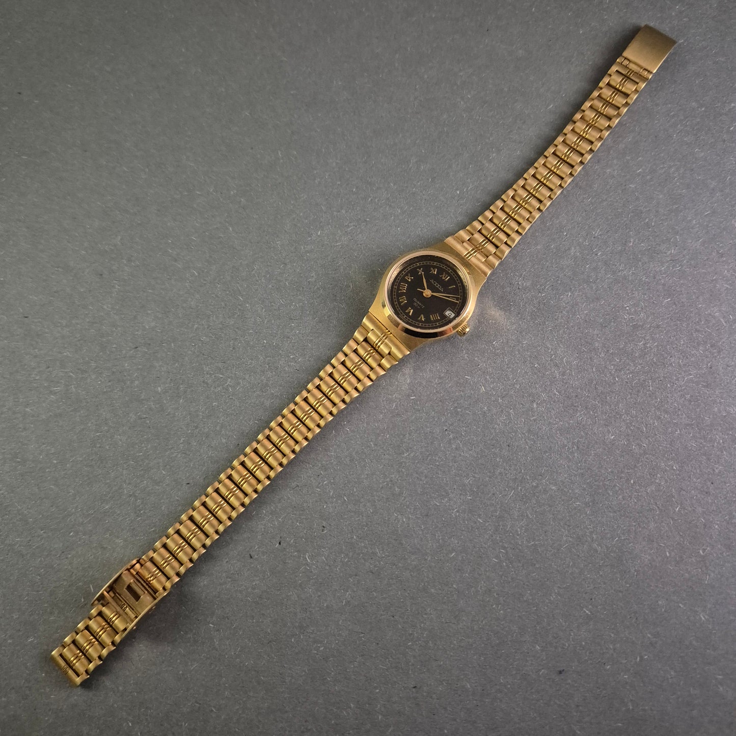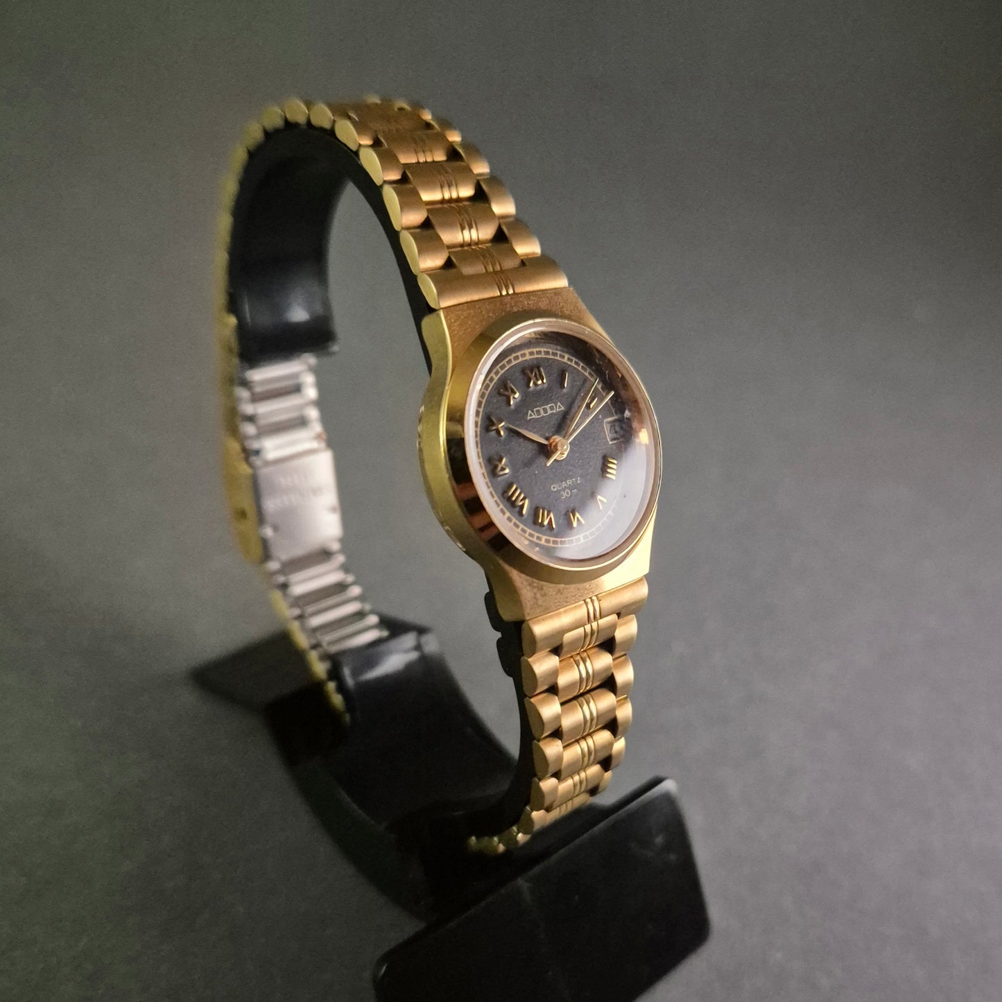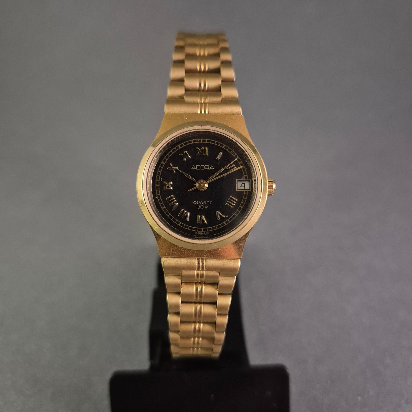 Diese ADORA Damenarmbanduhr kombiniert zeitlose Eleganz mit praktischer Funktionalität. Das goldene Gehäuse und Armband harmonieren perfekt mit dem schwarzen Zifferblatt, auf dem römische Ziffern ein klassisches Erscheinungsbild schaffen. Die Datumsanzeige auf 3 Uhr und die Wasserdichtigkeit bis 30 m machen sie zu einem stilvollen Begleiter für den Alltag und besondere Anlässe.