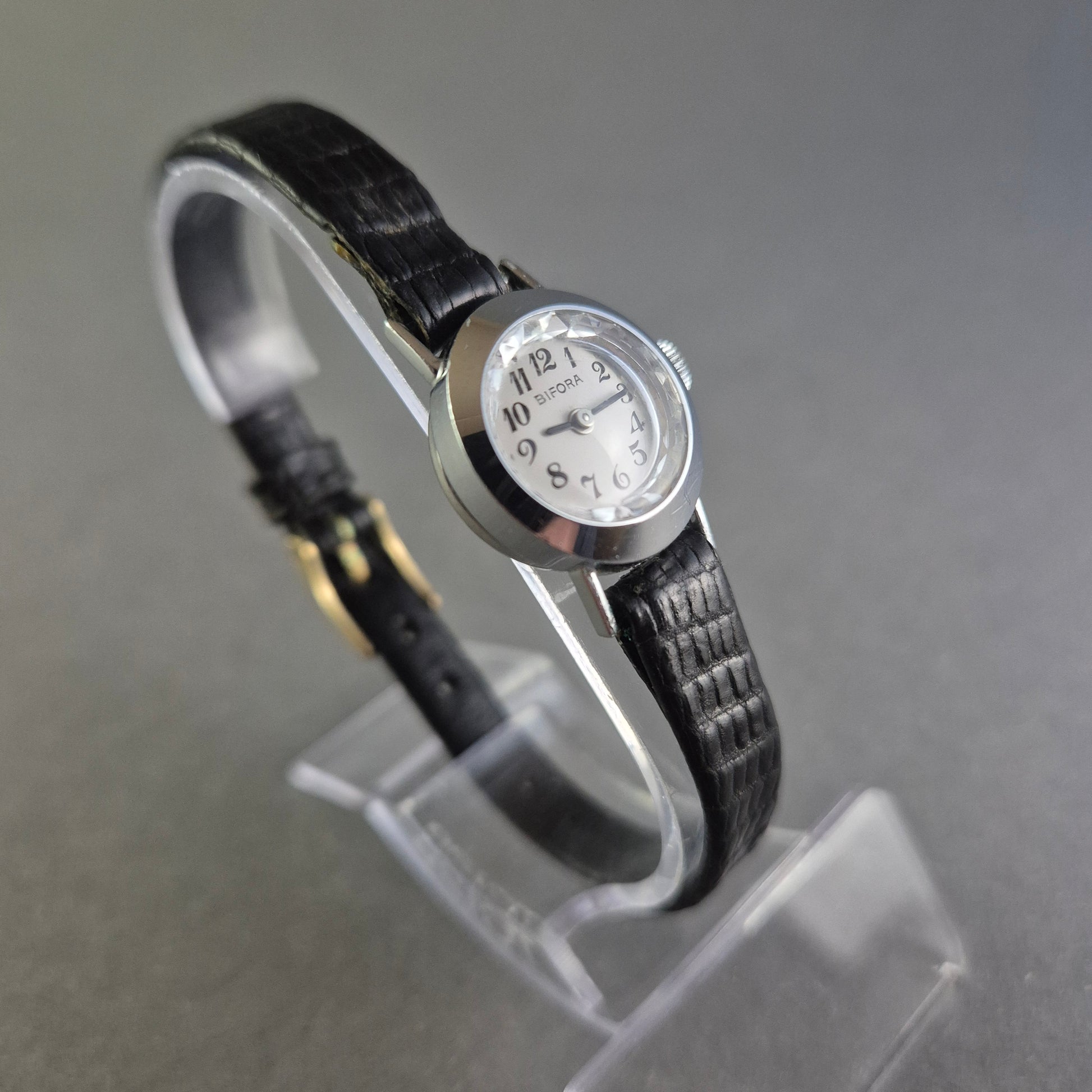 Diese stilvolle Damenarmbanduhr von Bifora vereint Vintage-Charme mit zeitloser Eleganz. Das kompakte, runde Edelstahlgehäuse wird durch ein markantes Zifferblatt mit geschwungenen arabischen Zahlen ergänzt. Das schwarze Lederarmband verleiht der Uhr eine klassische Note und sorgt für angenehmen Tragekomfort. Angetrieben von einem präzisen mechanischen Handaufzugswerk ist sie die perfekte Wahl für Liebhaberinnen traditioneller Uhrmacherkunst.