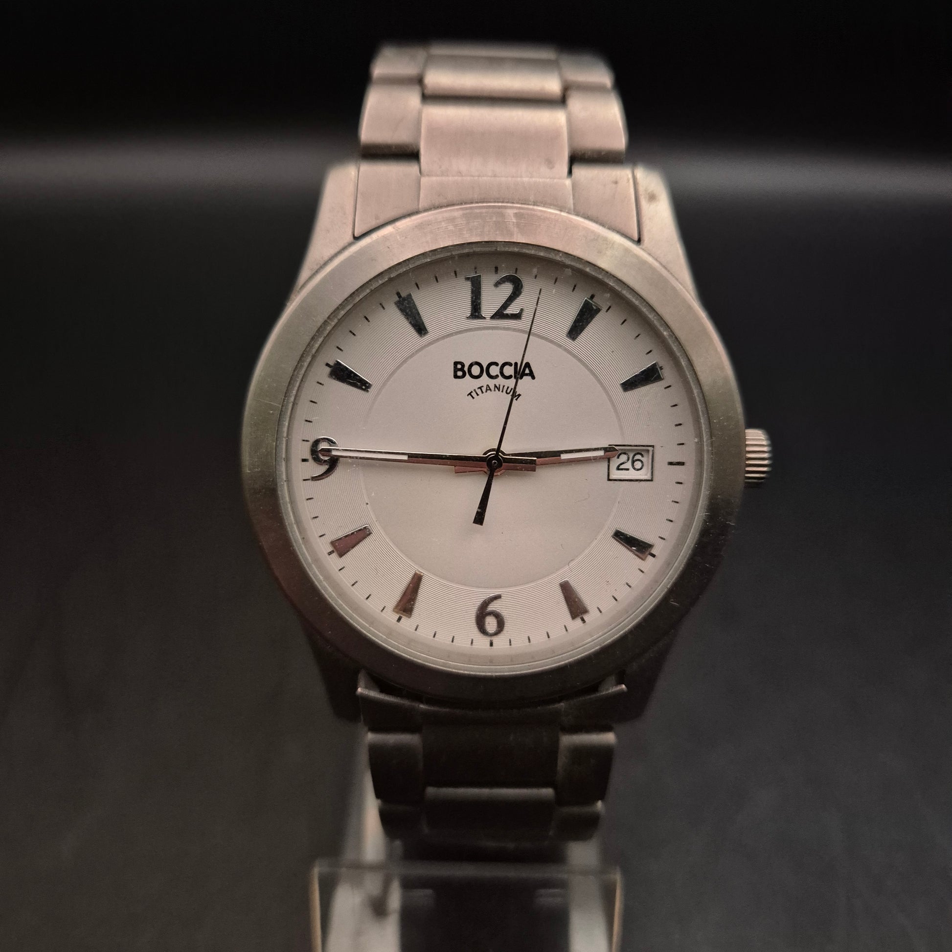 Diese Boccia Titan Herren Armbanduhr vereint schlichte Eleganz mit hohem Tragekomfort dank des leichten und hypoallergenen Titan-Gehäuses und -Armbands. Das helle, klare Zifferblatt ist mit markanten Indizes und arabischen Ziffern bei 12 und 6 Uhr versehen. Ein praktisches Datumsfenster bei 4 Uhr rundet die Funktionalität ab. Die Uhr wird von einem zuverlässigen Quarzwerk angetrieben und ist bis zu 5 Bar wasserdicht (Angabe auf dem Gehäuseboden). Das matte Titan verleiht der Uhr ein modernes, unaufdringliches Finish, perfekt für den täglichen Gebrauch oder formellere Anlässe. Der Zustand ist gebraucht mit leichten Gebrauchsspuren, die dem Titan-Look Charakter verleihen.