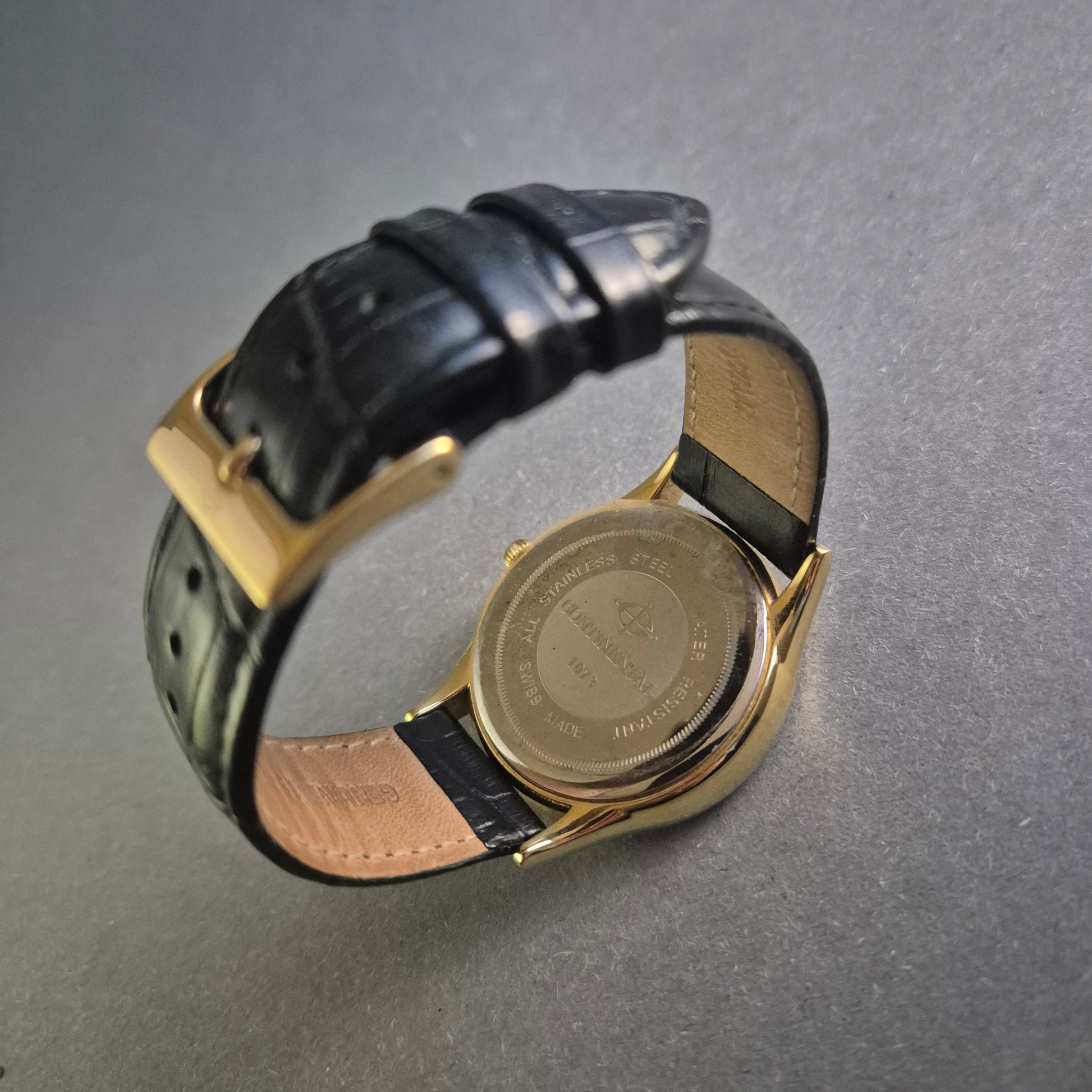 Diese Continental Herrenarmbanduhr vereint elegantes Design mit höchster Schweizer Qualität. Das goldfarbene Edelstahlgehäuse umrahmt ein stilvolles schwarzes Zifferblatt mit feinen goldenen Details und einer praktischen Datumsanzeige. Das hochwertige schwarze Lederarmband mit Krokodilprägung sorgt für einen luxuriösen Look und hohen Tragekomfort.