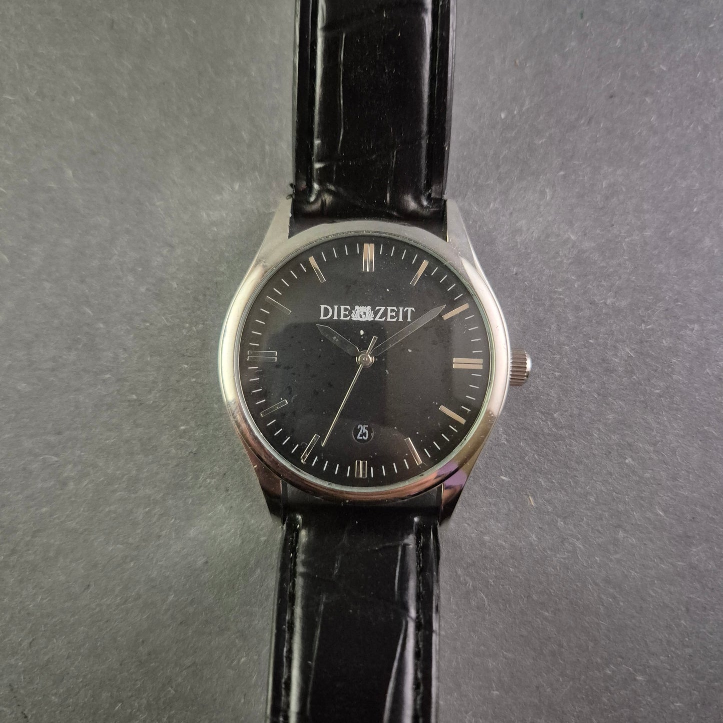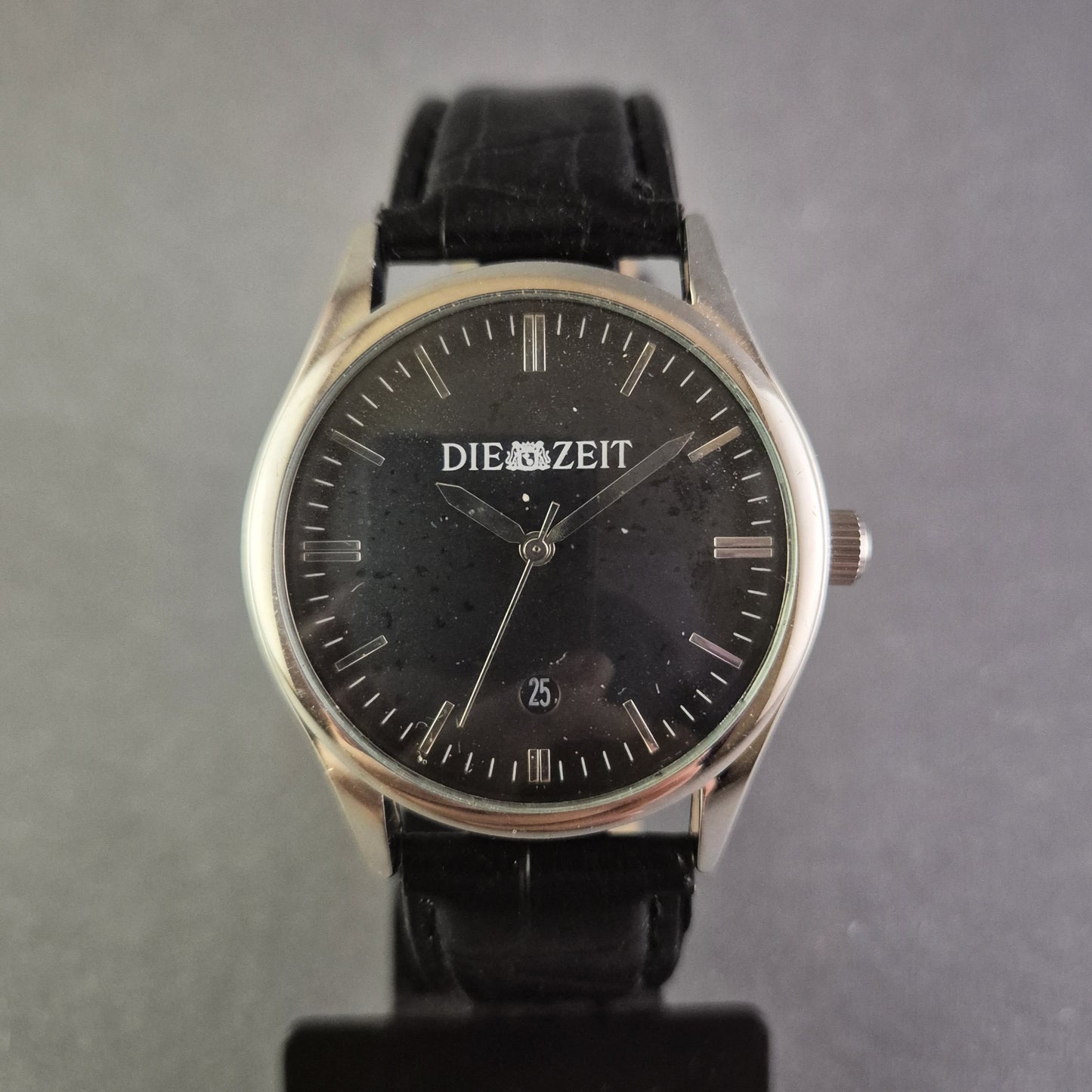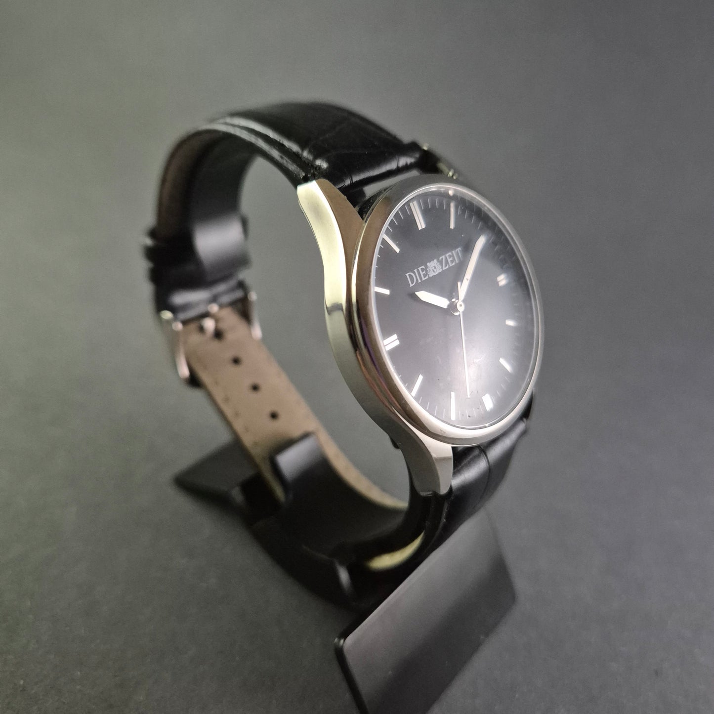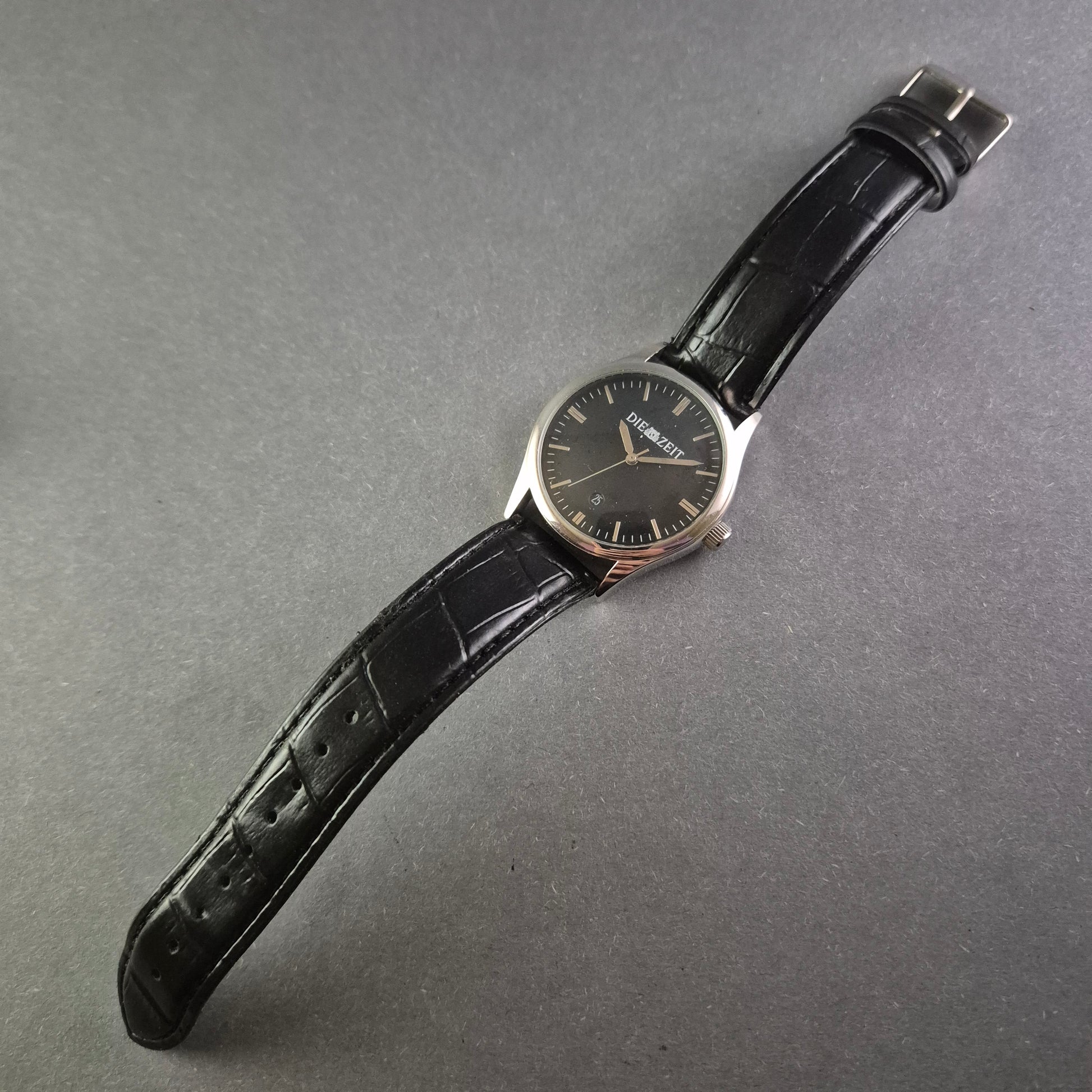 Diese stilvolle Herrenarmbanduhr der Marke Die Zeit vereint klassische Eleganz und hochwertige Verarbeitung. Das schwarze Zifferblatt mit dezentem Datumsfenster und feinen Indexen verleiht der Uhr eine edle Ausstrahlung. Das polierte Edelstahlgehäuse wird durch ein schwarzes Lederarmband mit Krokodilprägung perfekt ergänzt, wodurch die Uhr sowohl im Alltag als auch bei besonderen Anlässen getragen werden kann.