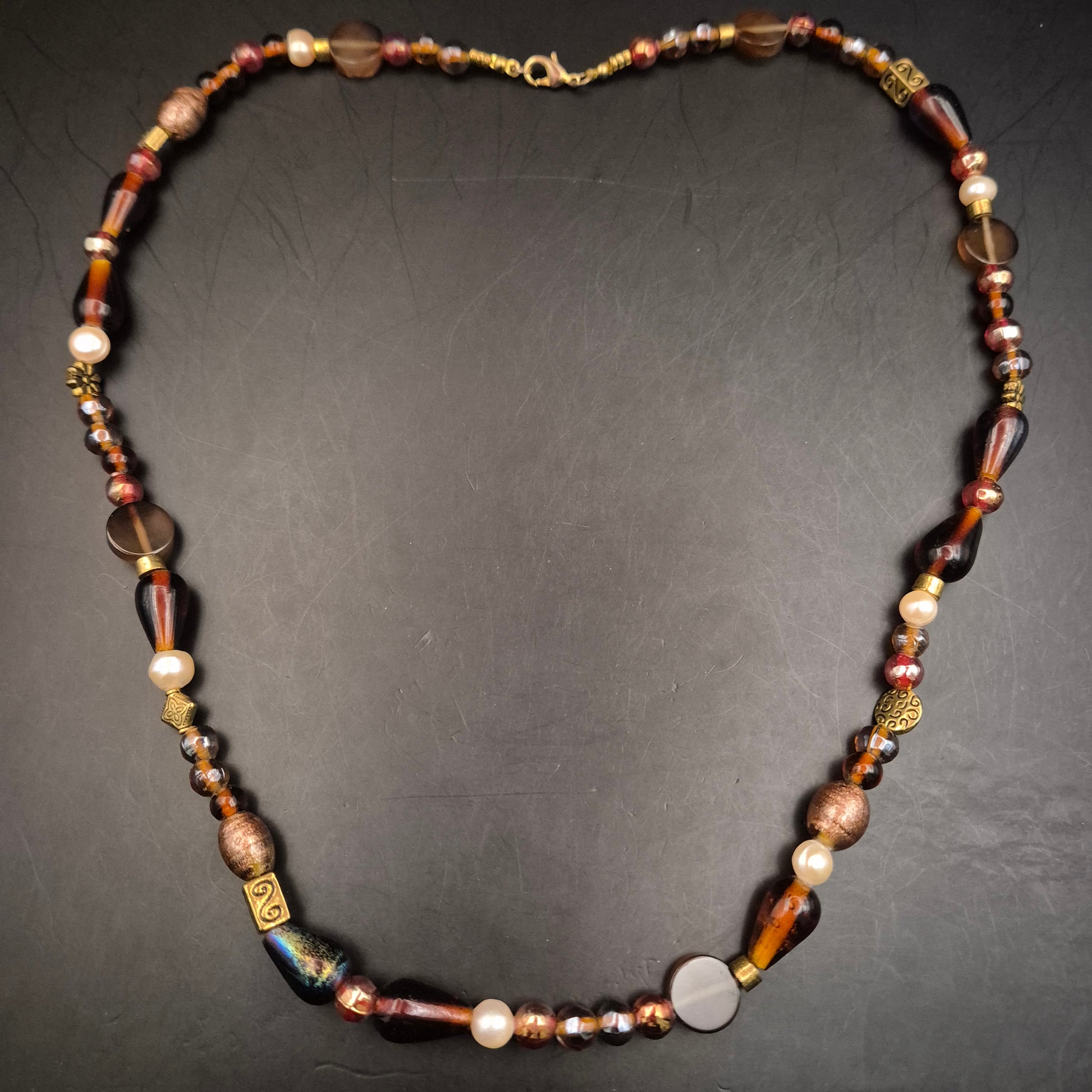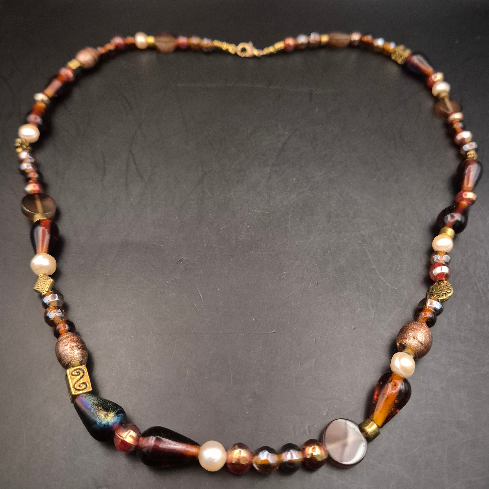 Diese kunstvoll gestaltete Halskette vereint eine Vielzahl an Glasperlen, Metallic-Elementen und kunstvoll geformten Formen in warmen Tönen wie Bernstein, Gold, Braun und Creme. Die abwechslungsreiche Kombination aus Materialien und Formen verleiht der Kette einen lebendigen, dennoch edlen Look. Perfekt geeignet als ausdrucksstarkes Accessoire für Vintage-Liebhaber oder besondere Anlässe.