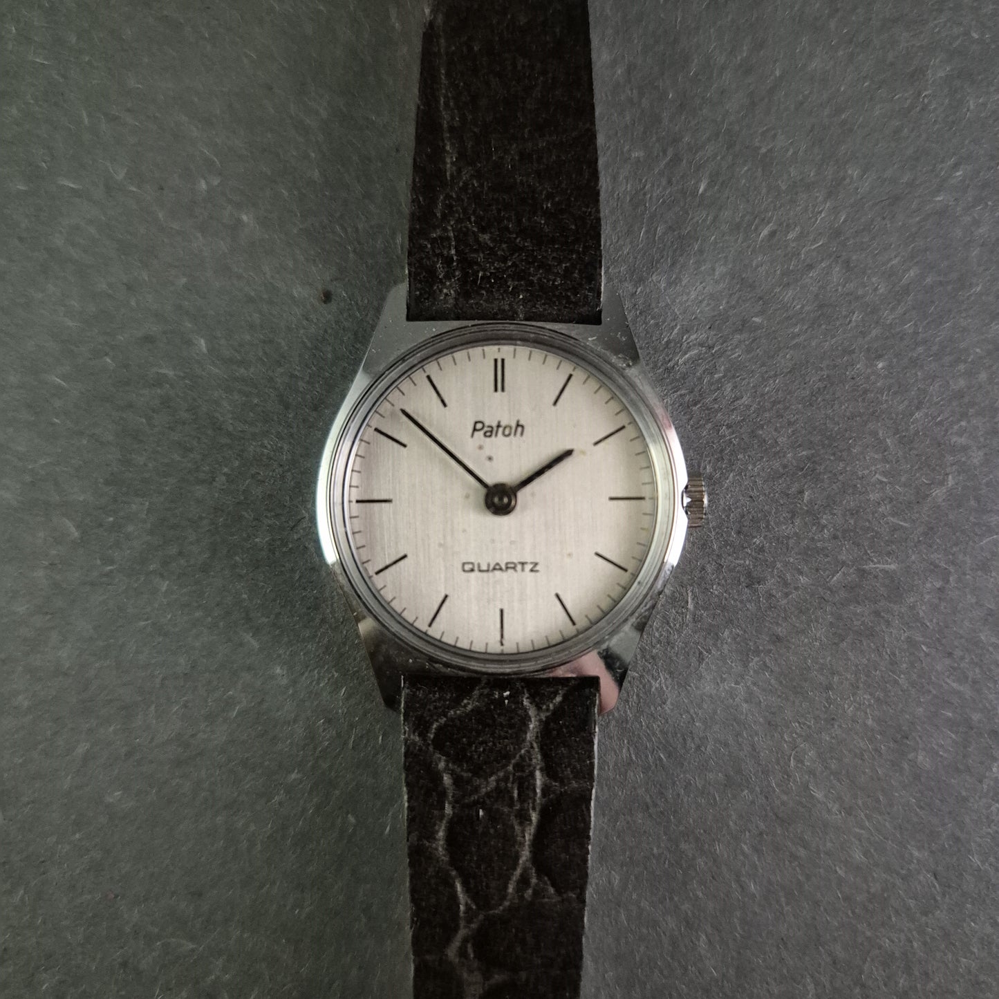 Diese elegante Patoh Damenarmbanduhr vereint schlichte Schönheit mit Funktionalität. Das silberfarbene Zifferblatt ist klar strukturiert und mit dezenten Strichindizes versehen. Das Gehäuse aus Edelstahl bietet Langlebigkeit, während das schwarze Armband mit geprägtem Muster für ein stilvolles Finish sorgt. Diese Uhr ist ein perfekter Begleiter für den Alltag oder besondere Anlässe.