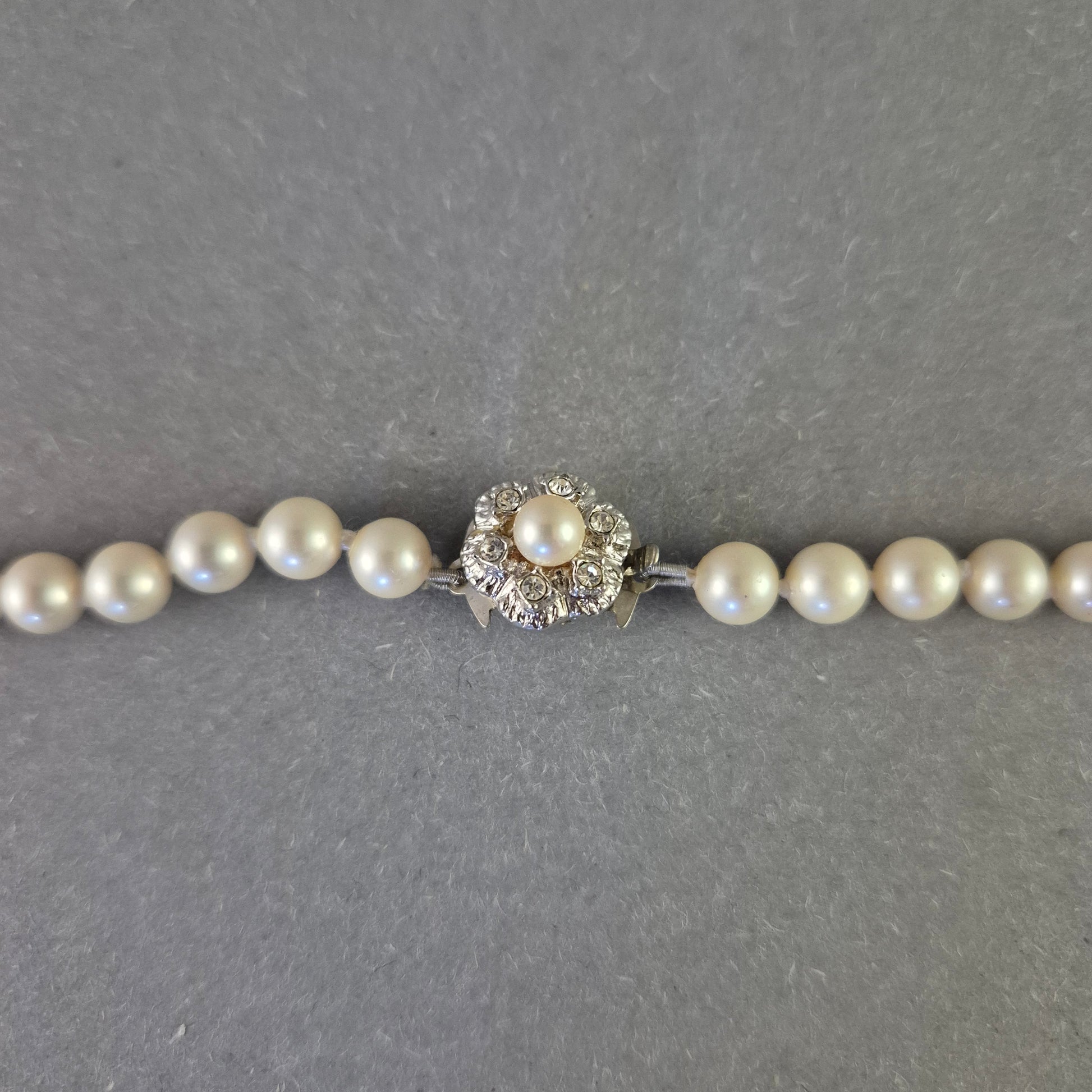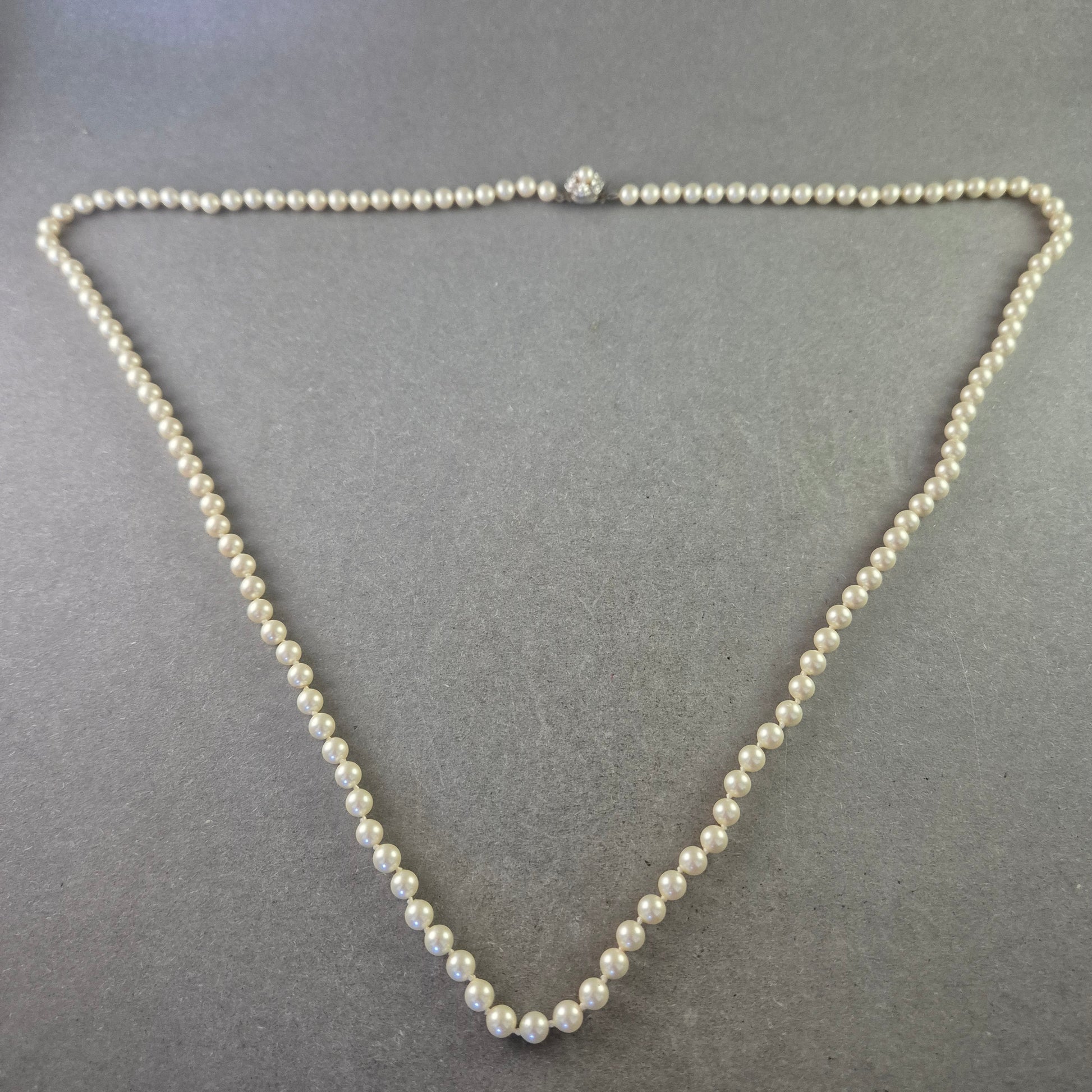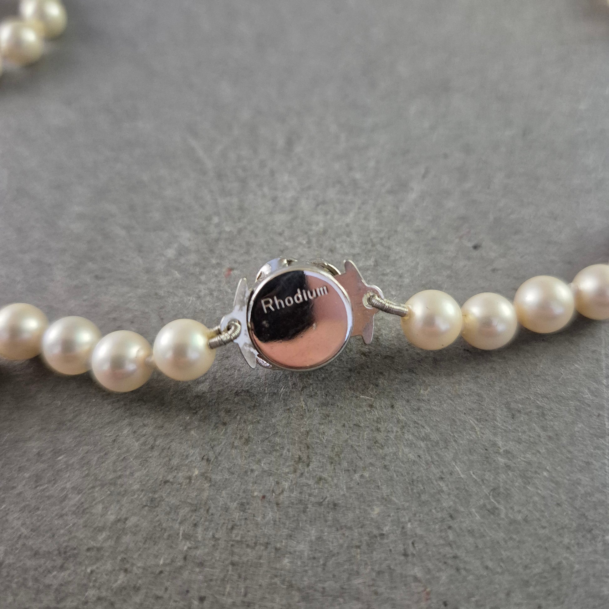 Eine klassische Perlenkette, bestehend aus einer Vielzahl kleiner, cremeweißer Perlen. Der robuste Verschluss ist aus Rhodium gefertigt und sorgt für einen sicheren Halt. Dieses zeitlose Schmuckstück verleiht jedem Outfit einen Hauch von Eleganz.