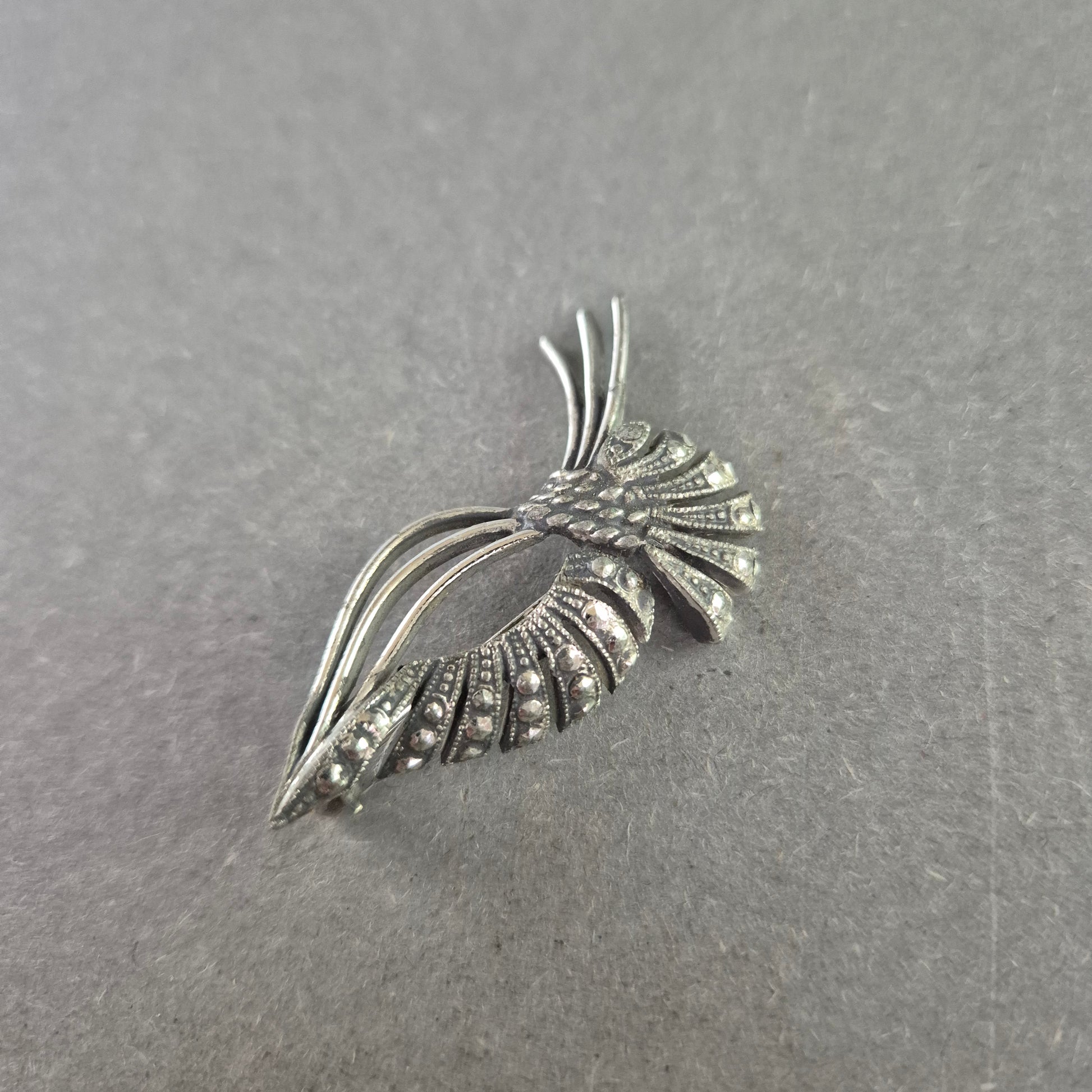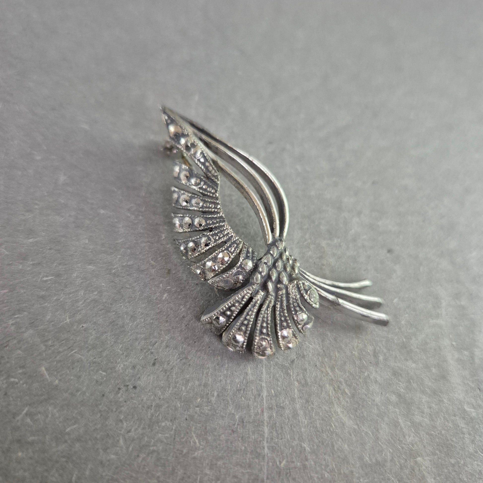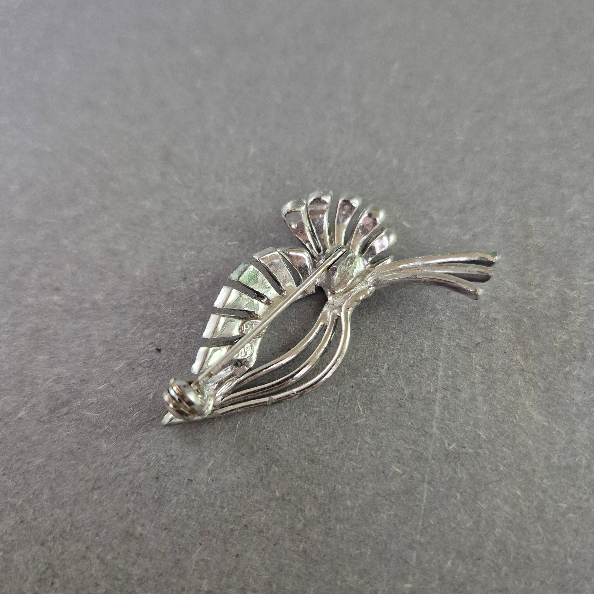 Diese stilvolle Vintage-Brosche aus silberfarbenem Metall überzeugt durch ihr geschwungenes florales Design und funkelnde Strassakzente. Das Motiv erinnert an ein kunstvoll stilisiertes Blatt oder eine abstrakte Blüte und verleiht jedem Outfit eine elegante, nostalgische Note. Perfekt geeignet für Sammler oder als stilvolles Accessoire auf Blazern und Mänteln.