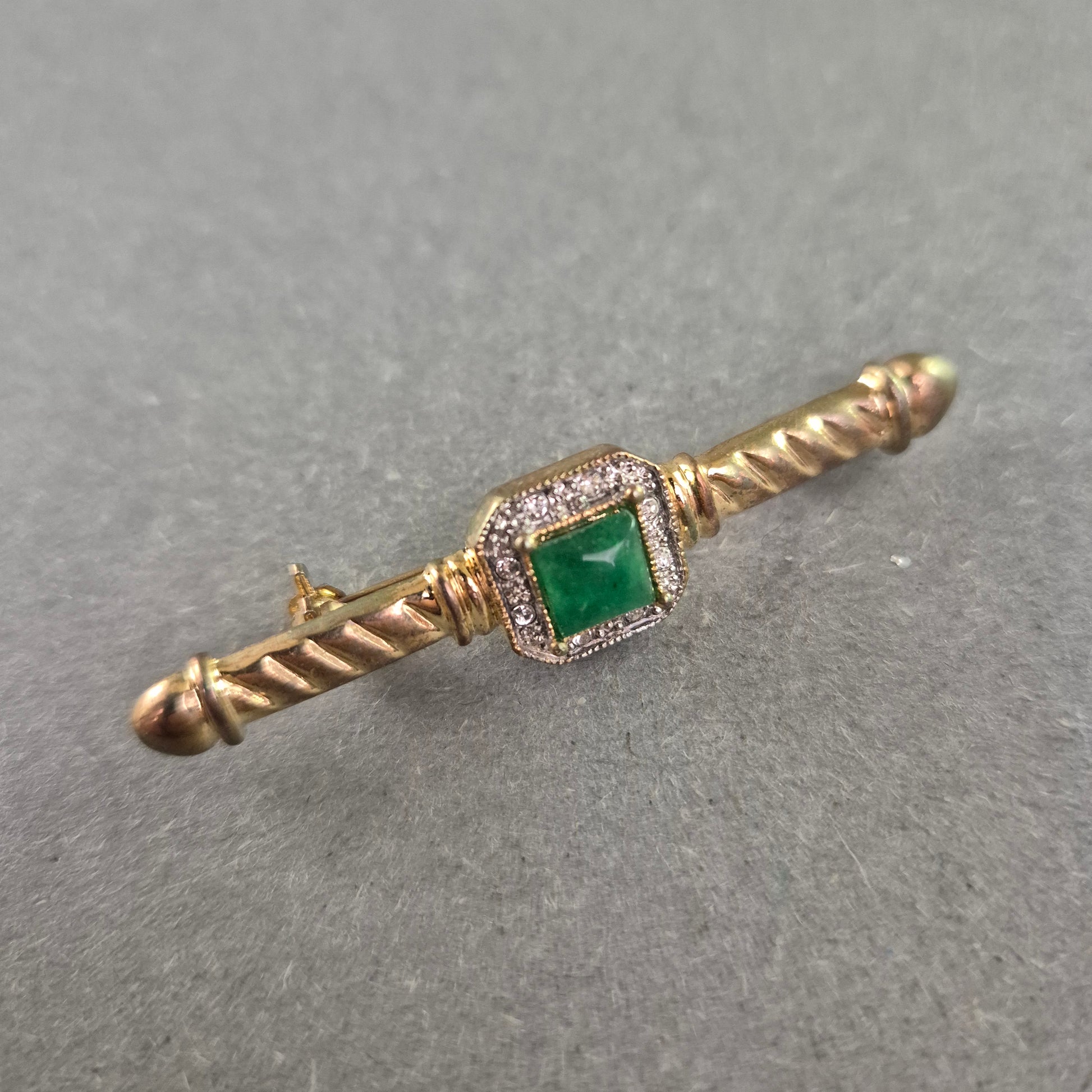 Diese edle Vintage-Brosche im klassischen Stabdesign kombiniert ein strukturiertes, goldfarbenes Metall mit einem tiefgrünen Zierstein im Zentrum. Umrahmt wird der Stein von funkelnden kleinen Strasssteinen, die dem Schmuckstück eine luxuriöse Note verleihen. Ideal für formelle Outfits, Blusen oder Blazer – ein stilvoller Blickfang mit zeitlosem Charakter.