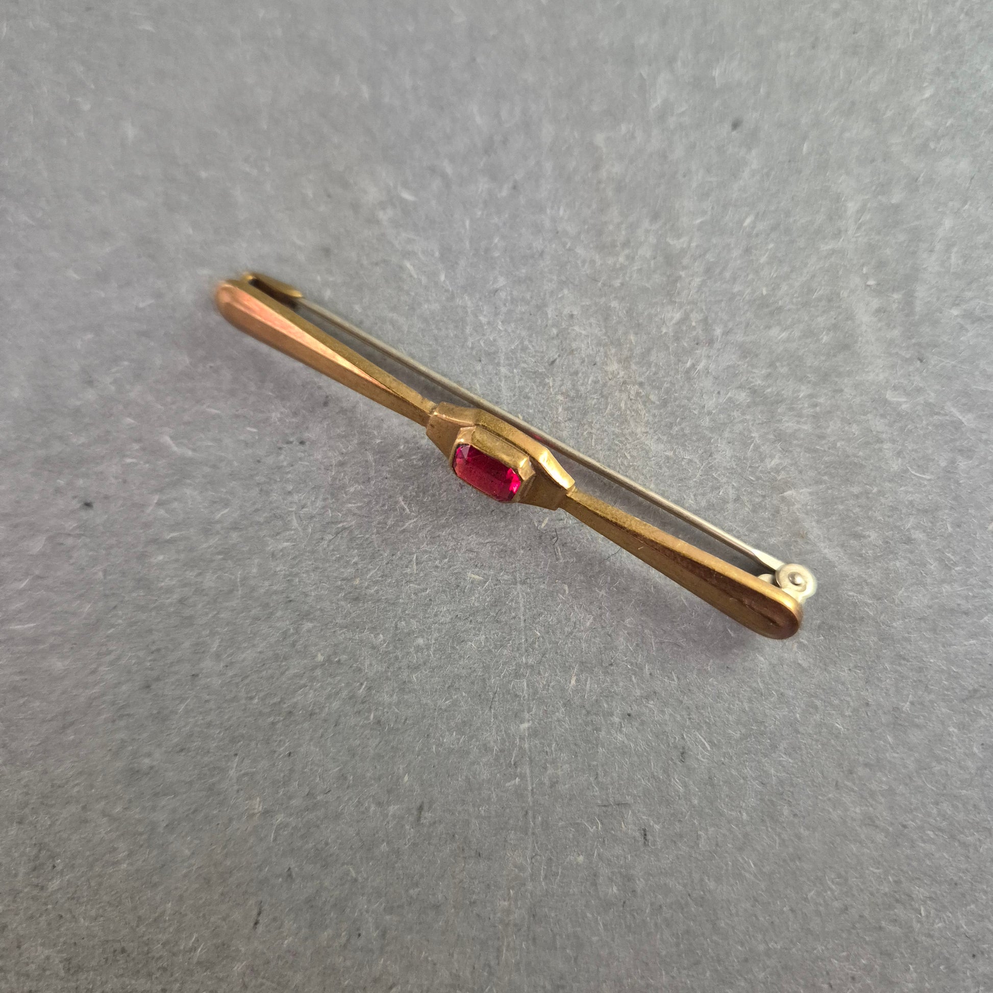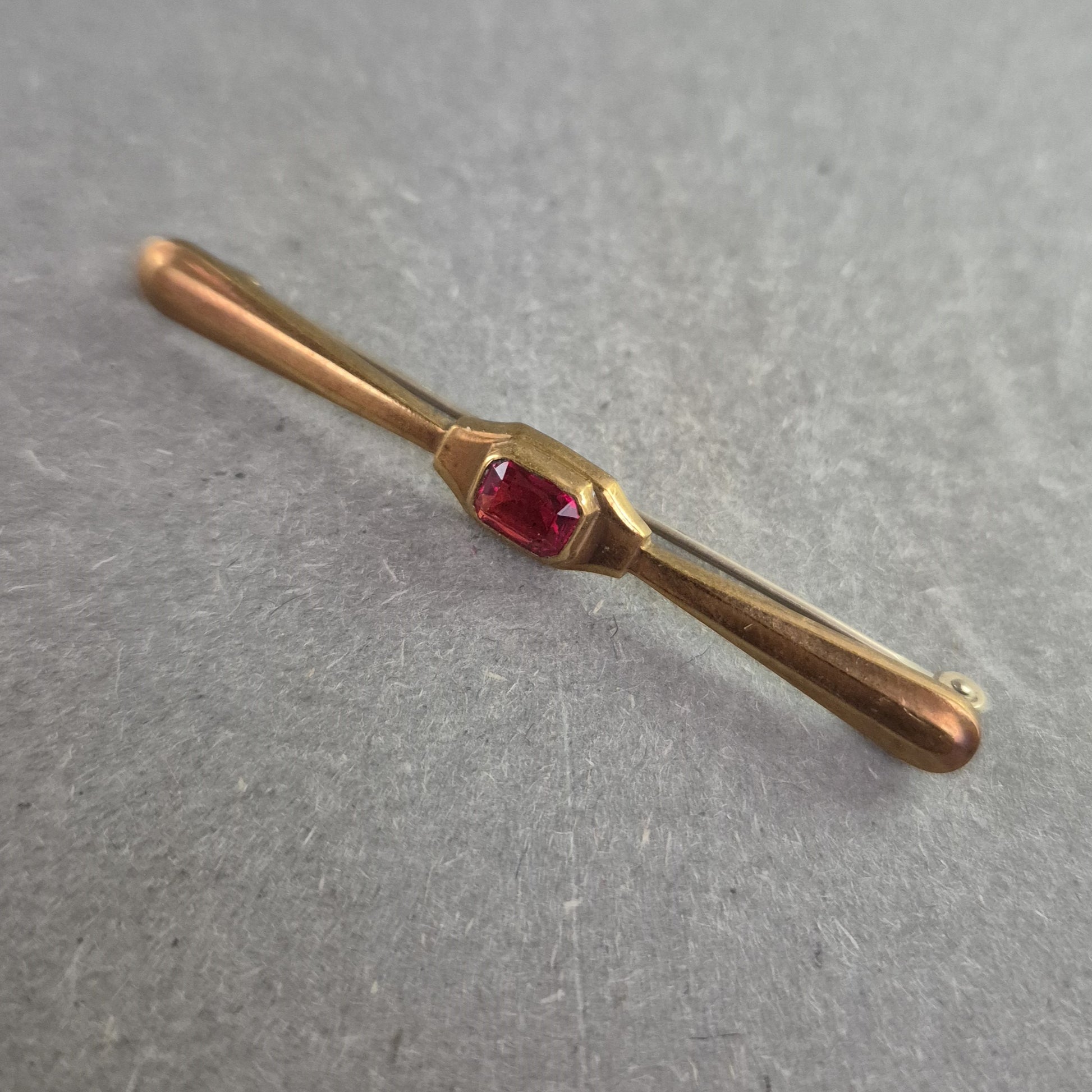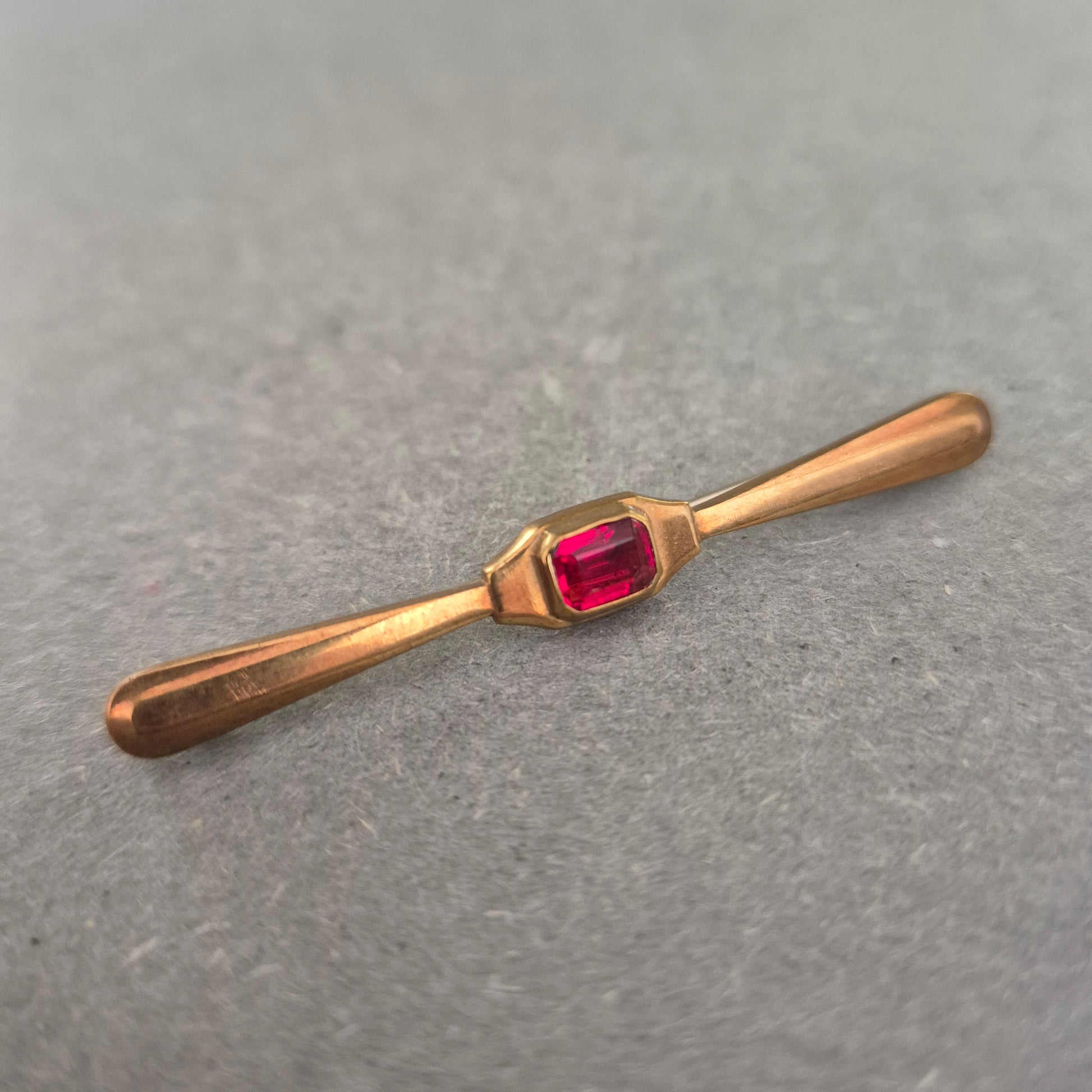 Diese schlanke Vintage-Brosche überzeugt mit einer minimalistischen, doch edlen Gestaltung. Die klaren Linien des goldfarbenen Metallkörpers werden durch einen zentral eingefassten rubinroten Stein akzentuiert, der für einen Hauch von Luxus sorgt. Ideal als stilvolles Accessoire für Blusen, Schals oder Jacken.