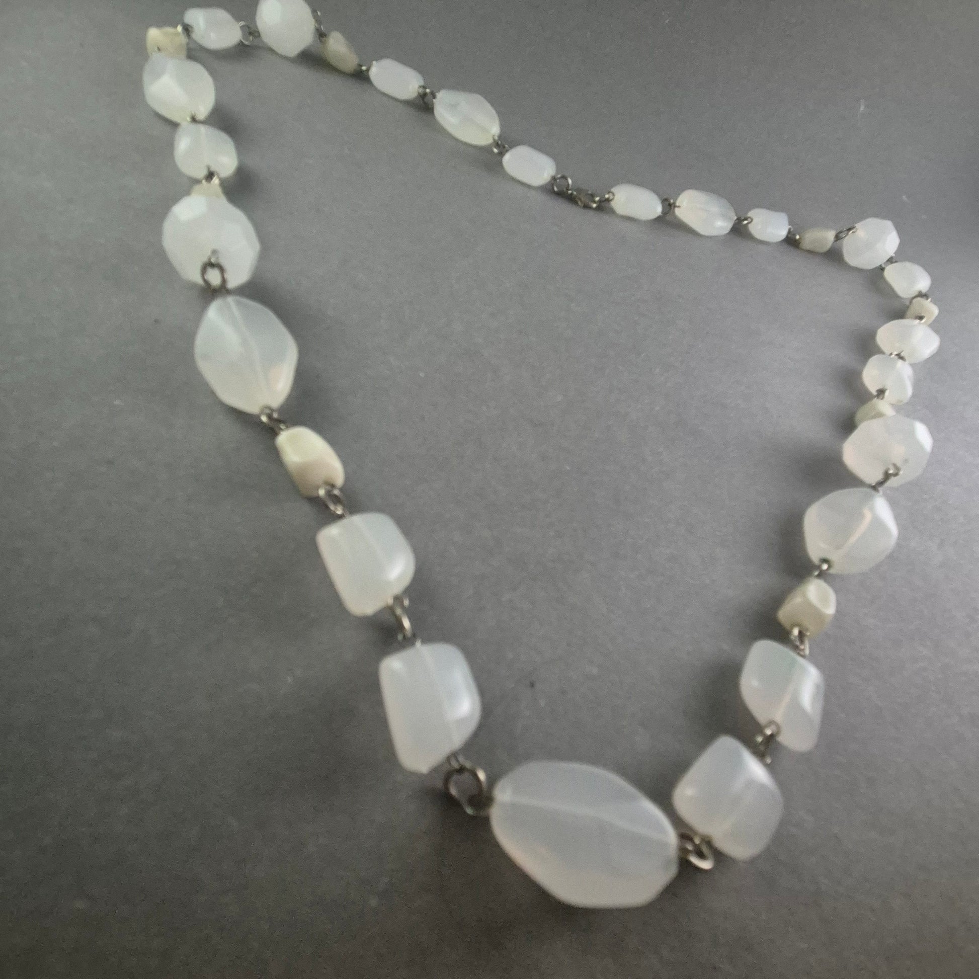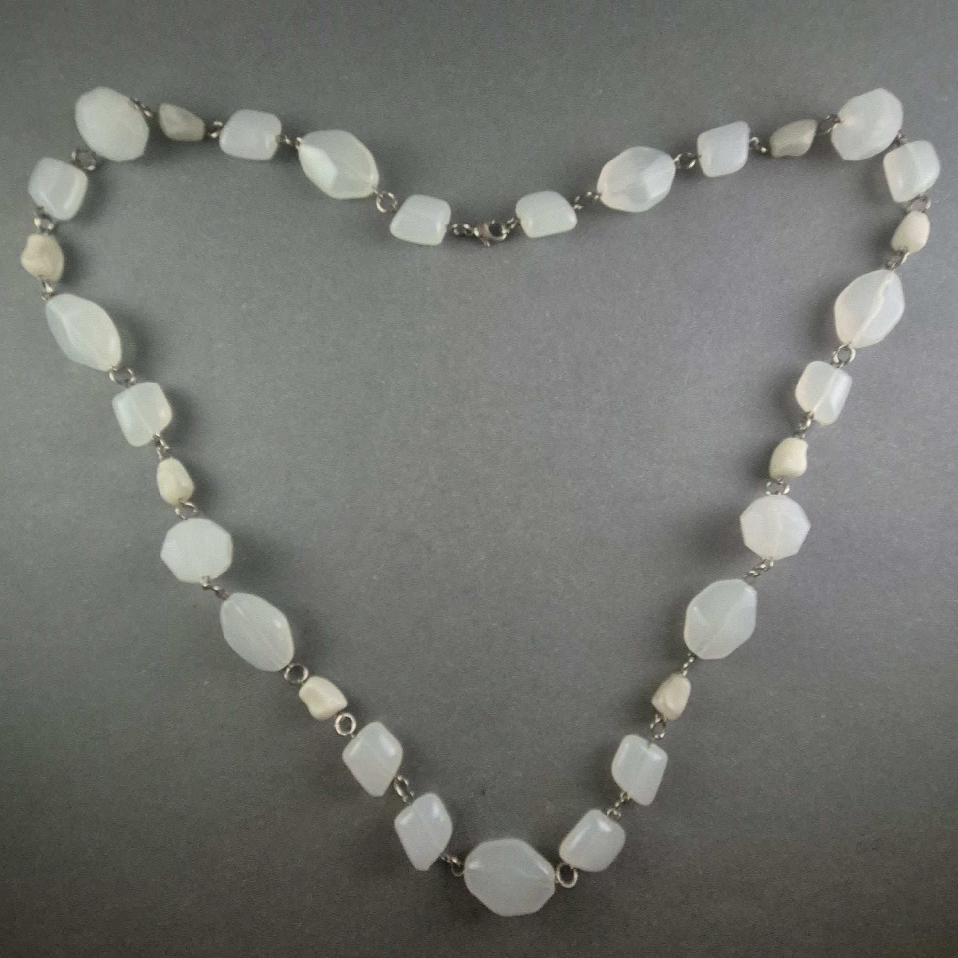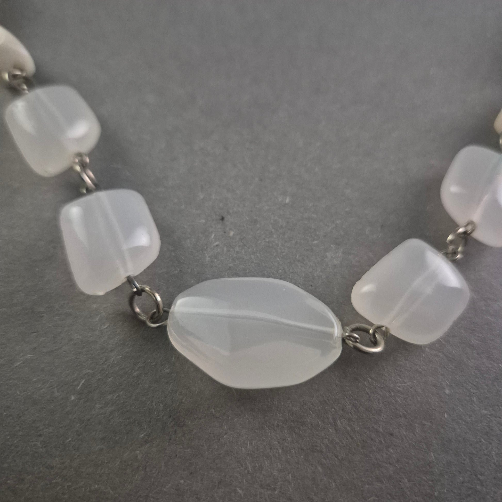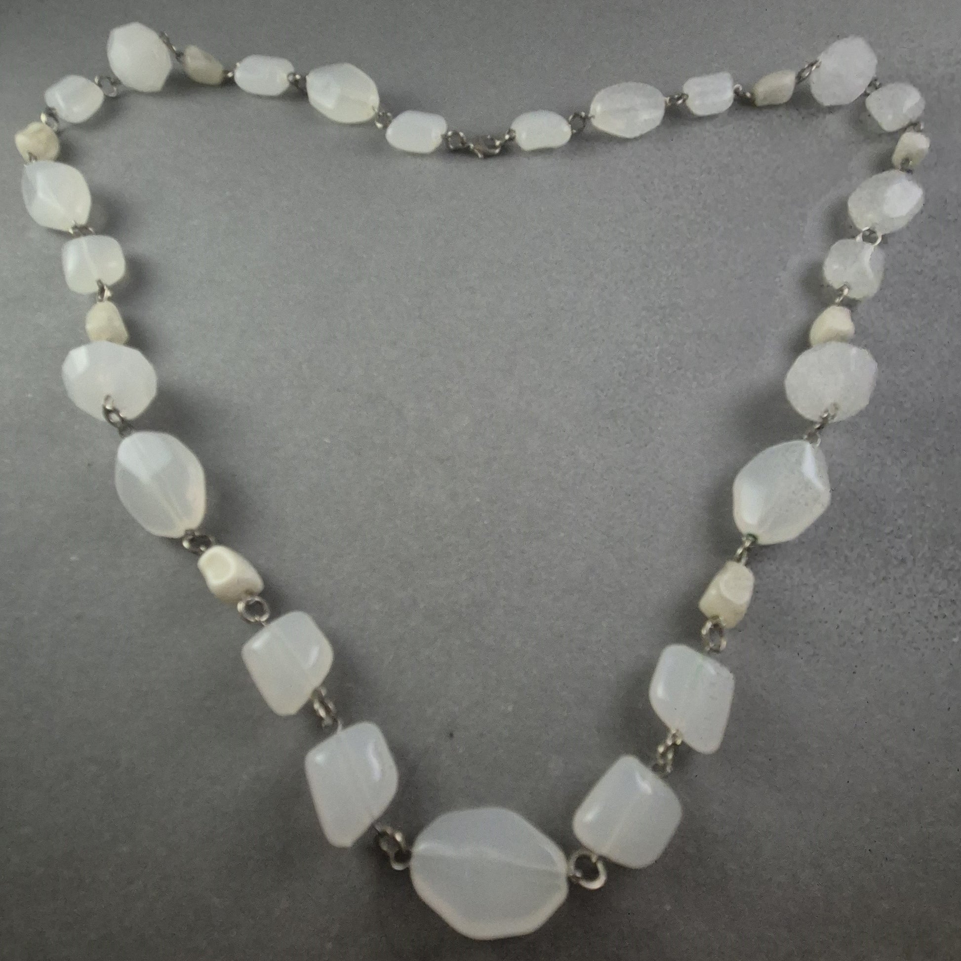 Diese exquisite Vintage-Kette aus facettierten Glasperlen in strahlendem Weiß besticht durch ihr elegantes Design und ihre vielseitige Einsetzbarkeit. Die unregelmäßig geformten Perlen sind kunstvoll mit Metallgliedern verbunden, was der Kette einen charmanten, handgefertigten Look verleiht. Ideal für besondere Anlässe oder als stilvolles Accessoire im Alltag.