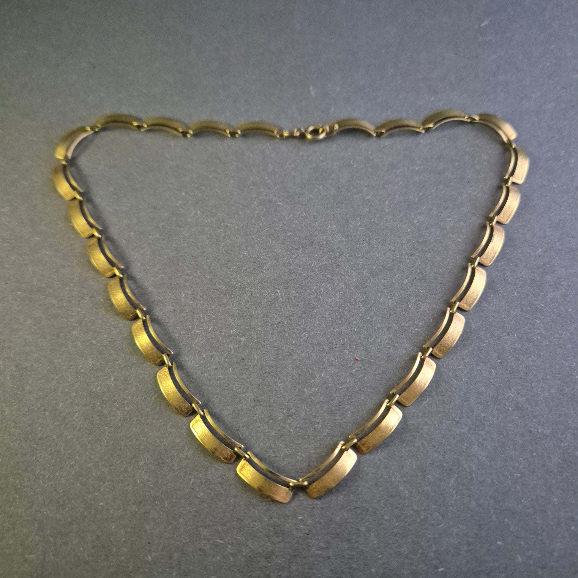 Diese stilvolle Vintage-Halskette besticht durch ihr schlichtes und doch raffiniertes Design. Die Glieder aus goldfarbenem Metall sind leicht geschwungen und matt gebürstet, was der Kette eine edle und dezente Ausstrahlung verleiht. Dank ihres zeitlosen Looks lässt sie sich sowohl zu eleganten als auch zu lässigen Outfits kombinieren. Der klassische Federringverschluss sorgt für einen sicheren Halt.