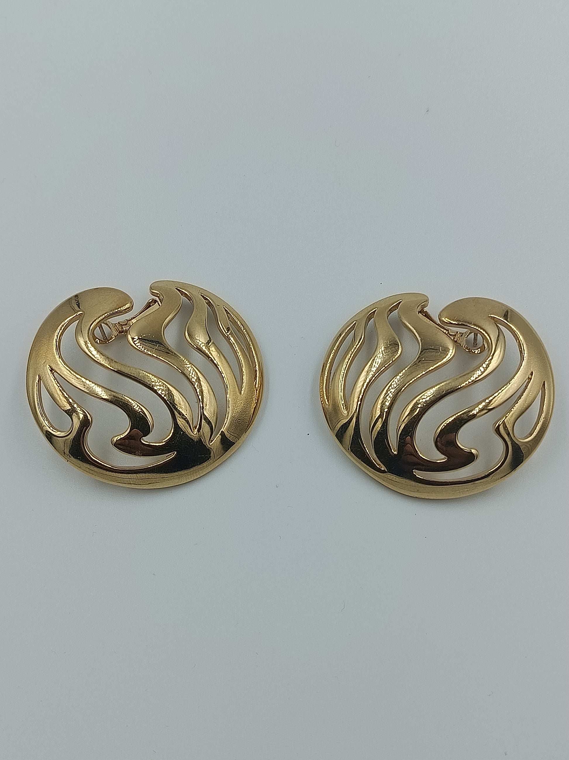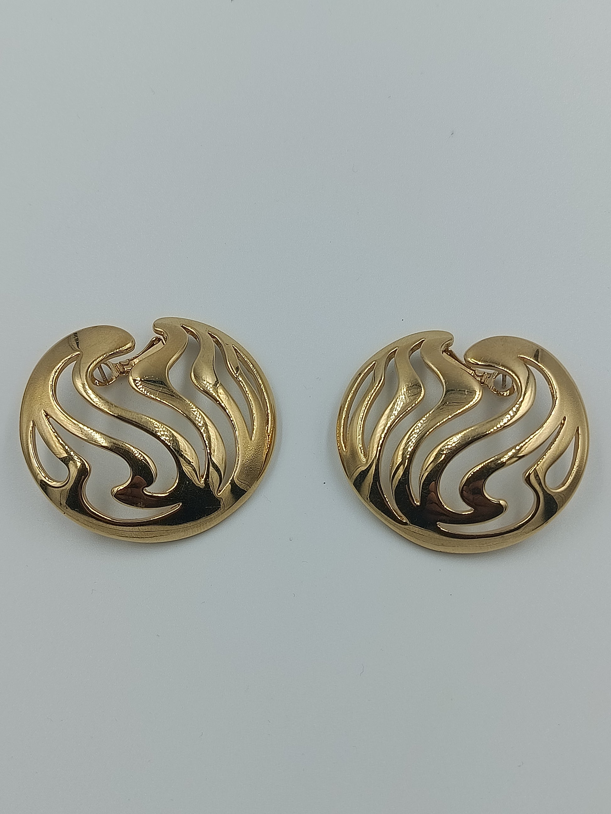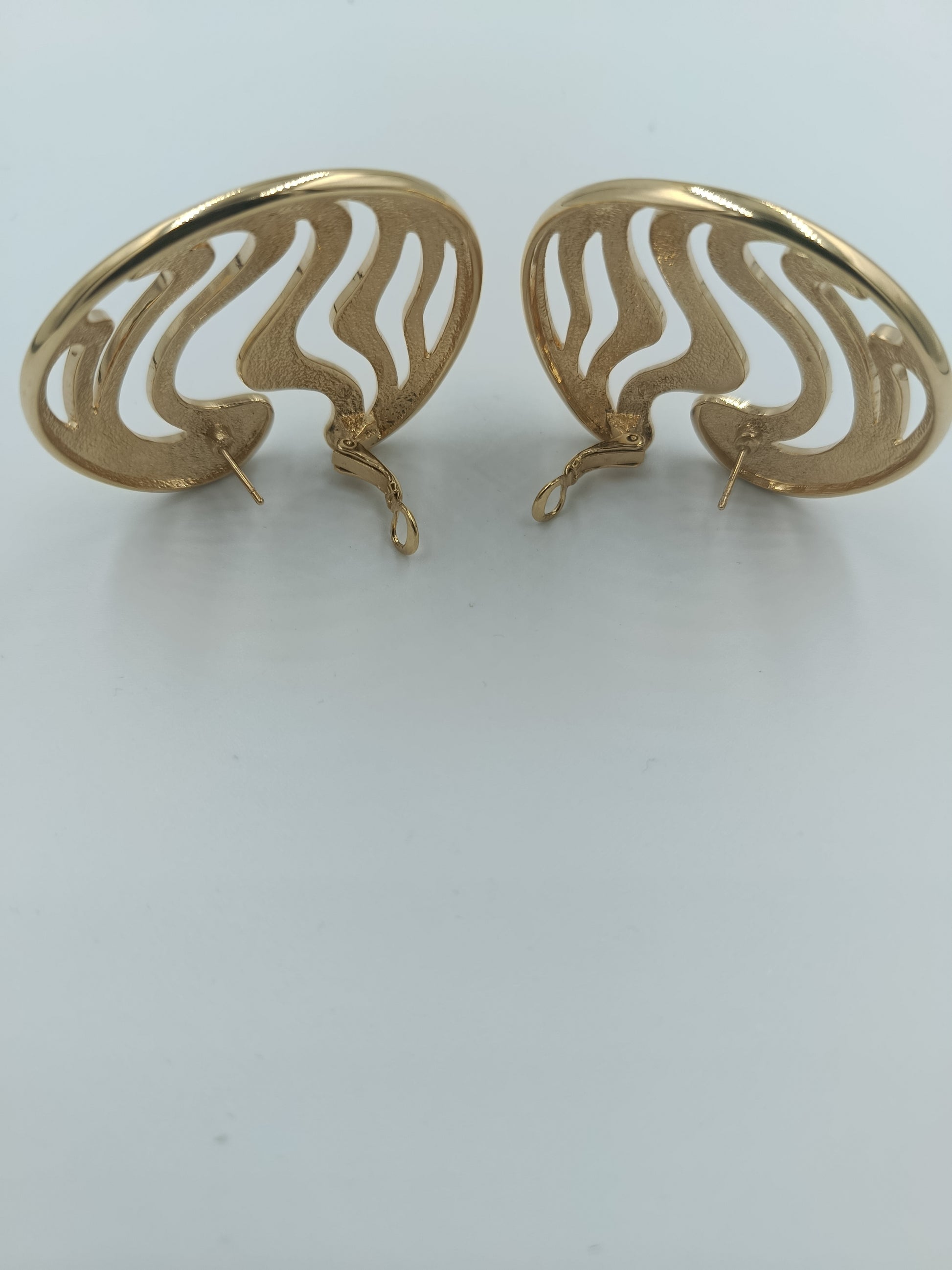 Diese eindrucksvollen Vintage-Ohrringe vereinen klare Linien mit einem kunstvollen Wellenmuster. Das goldfarbene Design wirkt edel und ausdrucksstark, während die offene Struktur dem Schmuckstück eine leichte, elegante Note verleiht. Perfekt, um jedem Outfit einen Hauch von Retro-Charme und Glamour zu verleihen.