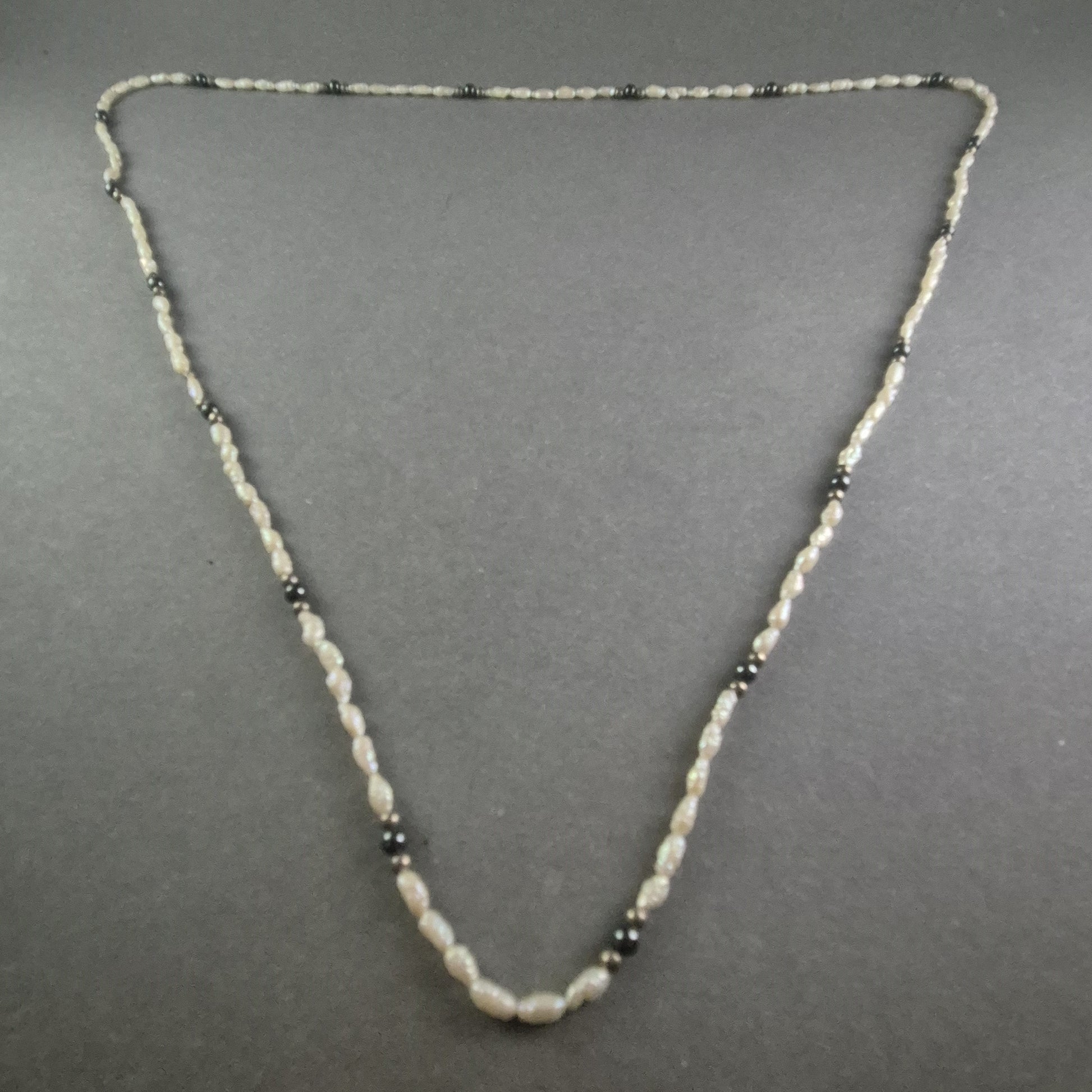 Diese exquisite Vintage-Perlenkette kombiniert kunstvoll schimmernde Süßwasser-Zuchtperlen mit glänzenden Hämatit-Akzenten. Das unregelmäßige Design der Perlen verleiht der Kette eine natürliche Eleganz, während die dunklen Hämatit-Elemente für einen modernen Kontrast sorgen. Perfekt für besondere Anlässe oder um einem schlichten Outfit einen Hauch von Luxus zu verleihen.
