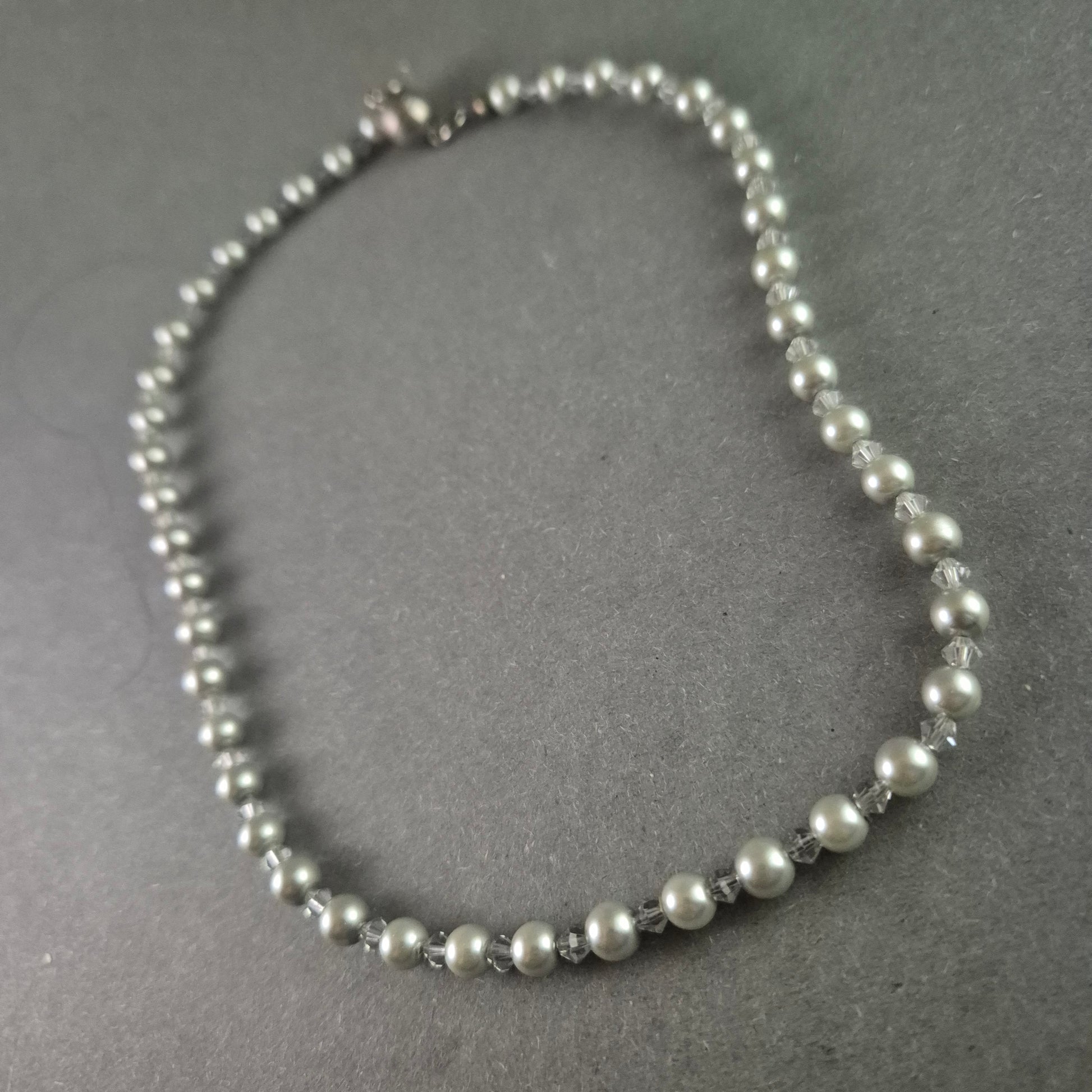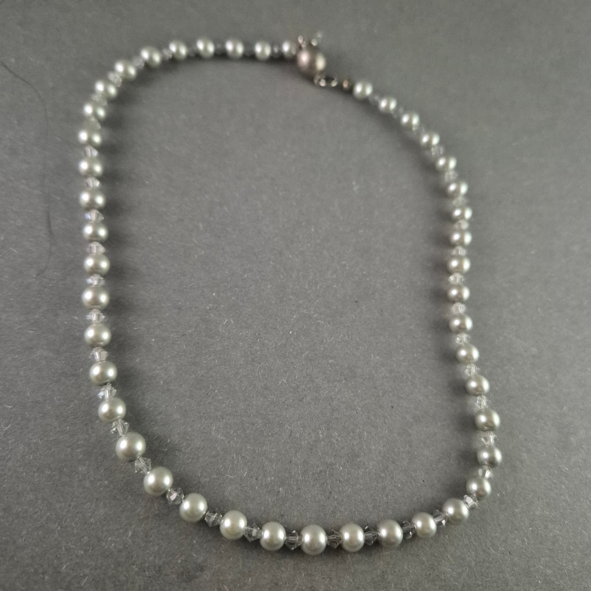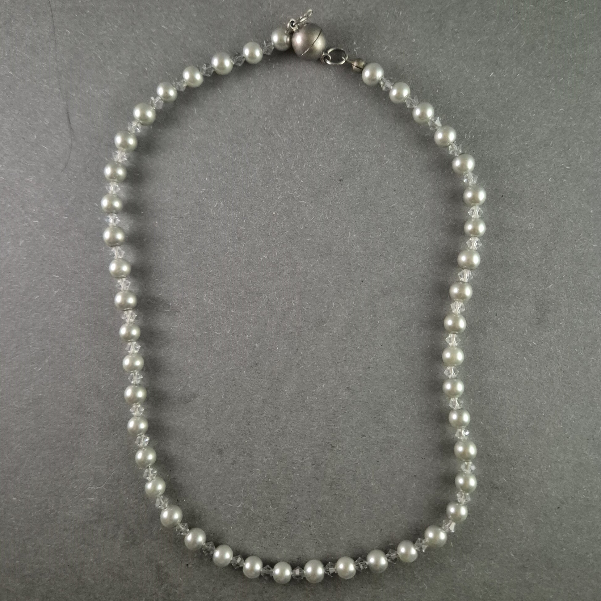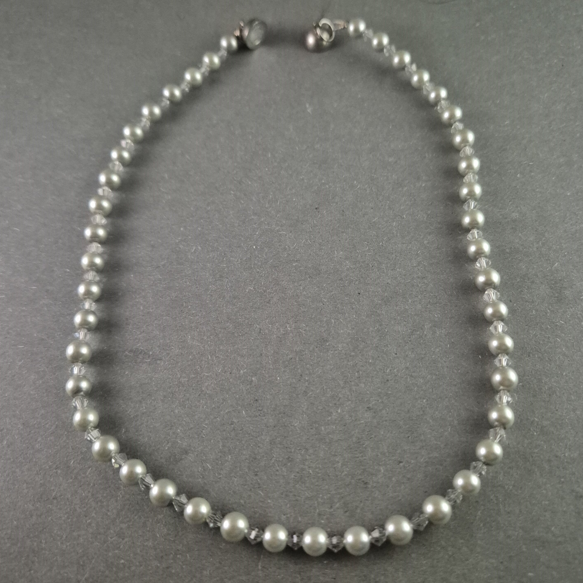 Diese edle Vintage-Perlenkette besticht durch ihre harmonische Kombination aus schimmernden Perlen und funkelnden Kristallperlen. Die silberfarbenen Perlen verleihen dem Schmuckstück eine zeitlose Eleganz, während die facettierten Kristalle für ein sanftes Funkeln sorgen. Mit ihrem klassischen Design ist diese Kette das perfekte Accessoire für besondere Anlässe oder stilvolle Alltagslooks.