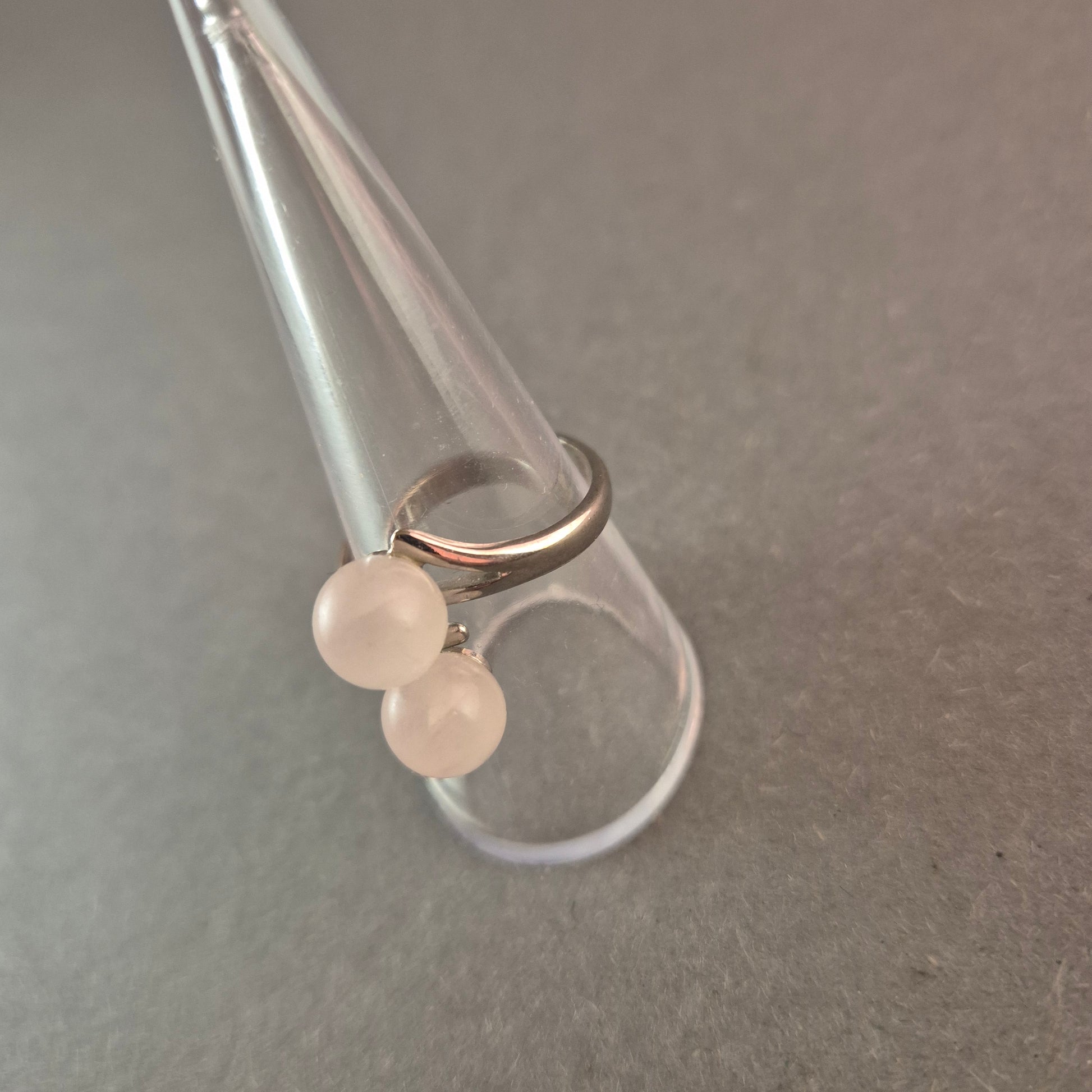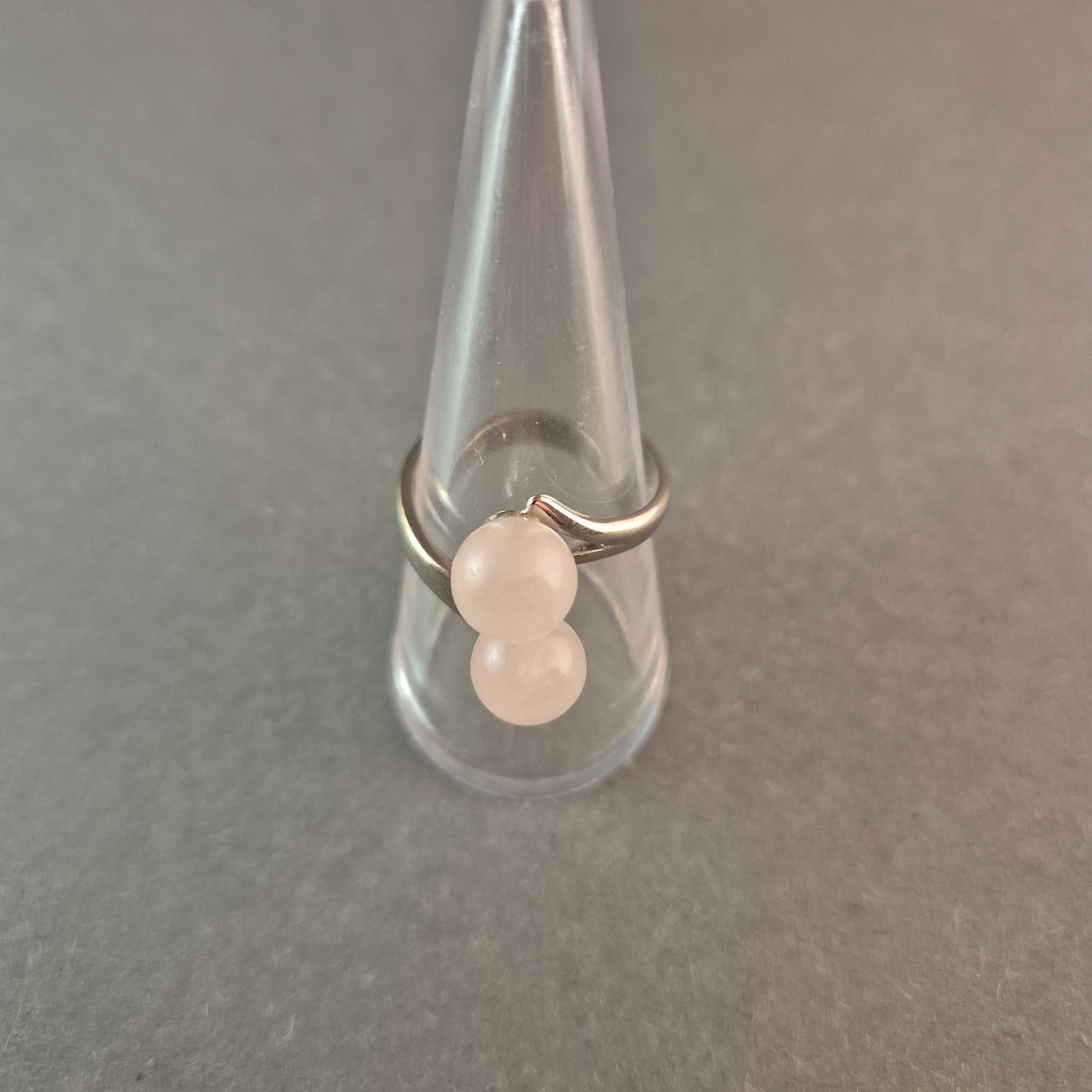 Dieser stilvolle Vintage-Ring besticht durch sein minimalistisches, aber dennoch edles Design. Zwei weiße, kugelförmige Edelstein-Perlen sind anmutig in eine geschwungene Silberfassung eingebettet. Die schlichte Eleganz macht diesen Ring zu einem perfekten Accessoire für verschiedene Anlässe.