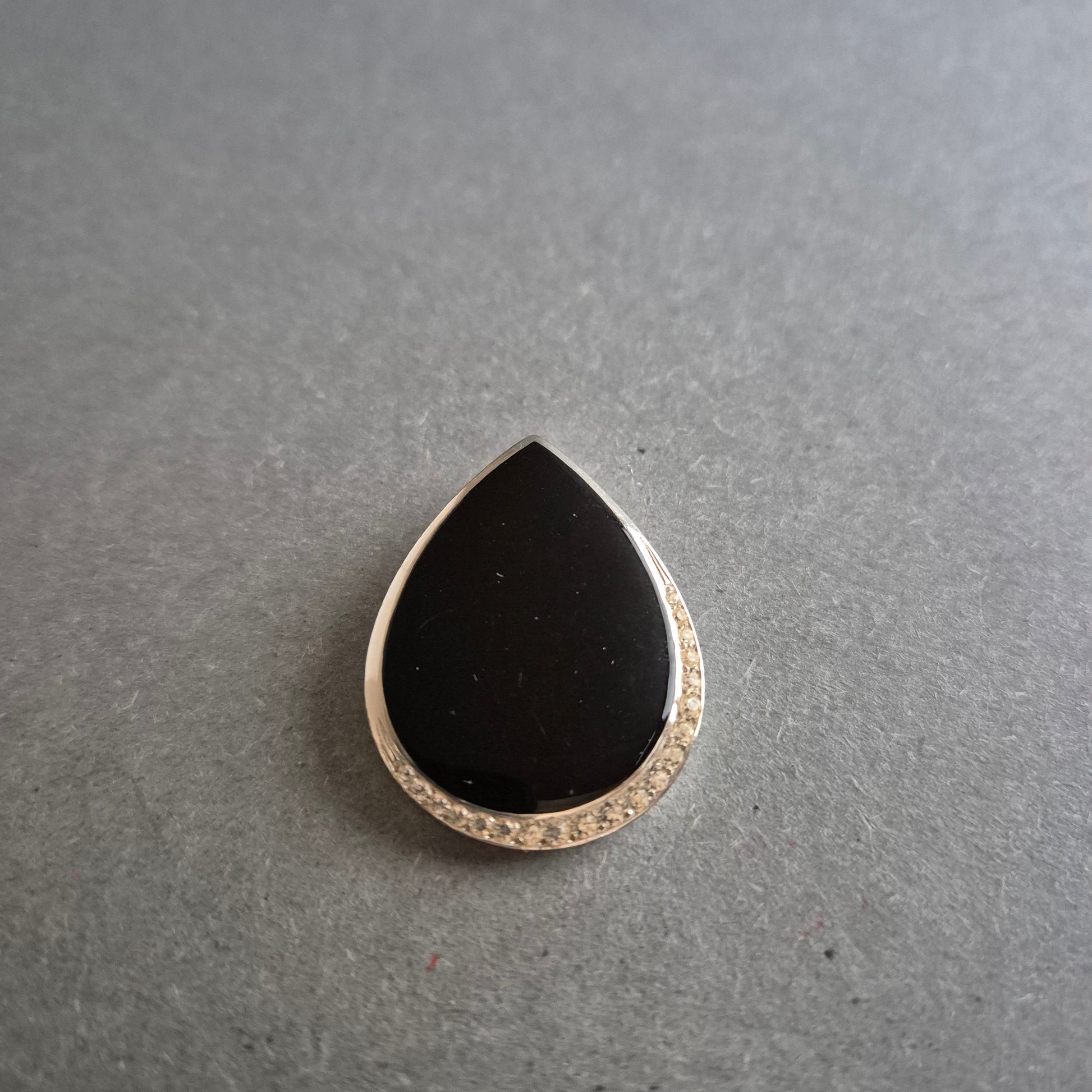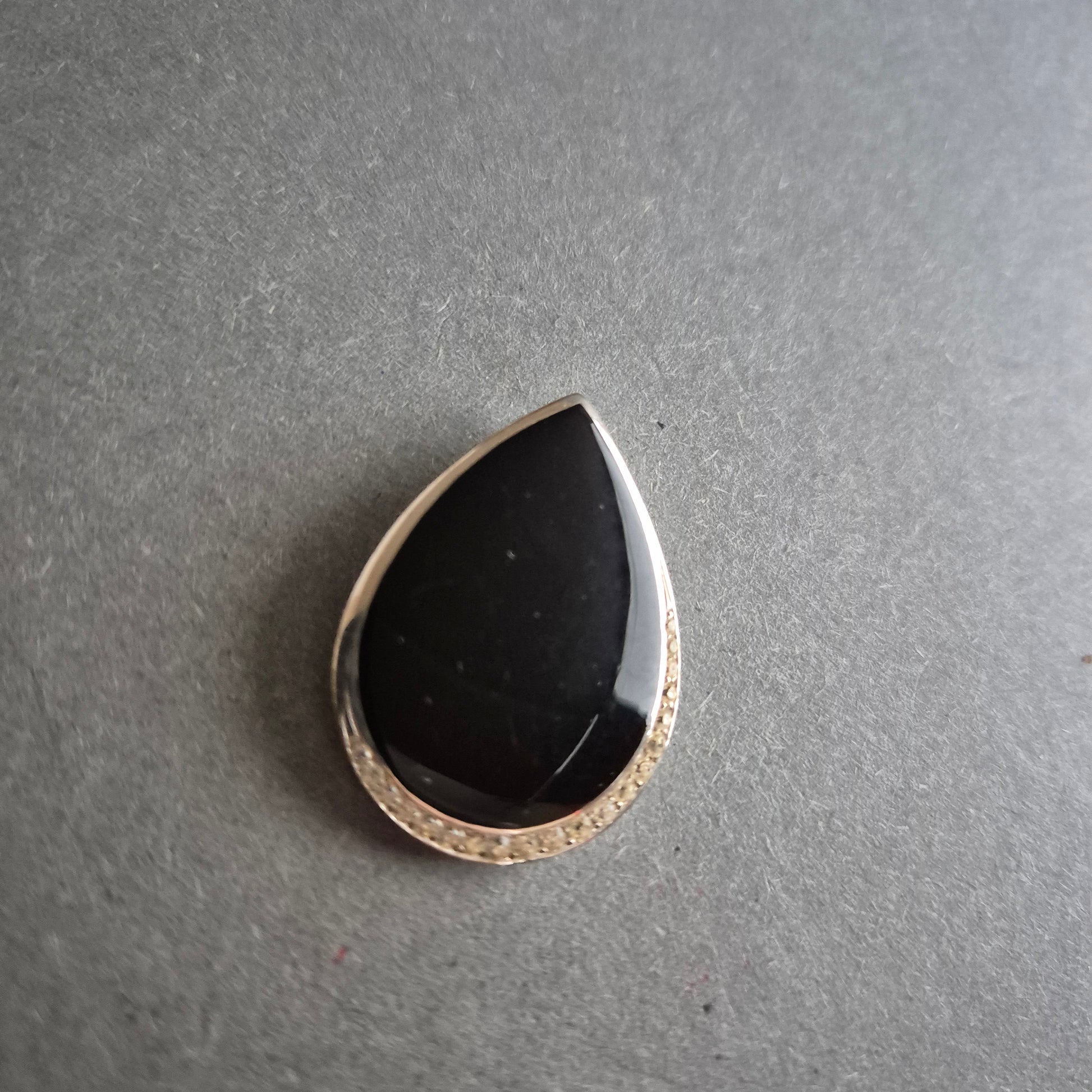 Dieser moderne Tropfenanhänger kombiniert minimalistisches Design mit edlem Glanz. Der tiefschwarze Stein ist glatt poliert und wird von einem silberfarbenen Rahmen eingefasst, der am unteren Rand mit funkelnden Zirkonia-Steinen verziert ist. Die Rückseite ist strukturiert und mit einer Öse zur Befestigung an einer Kette versehen. Ideal für stilvolle Auftritte mit einem Hauch Glamour.