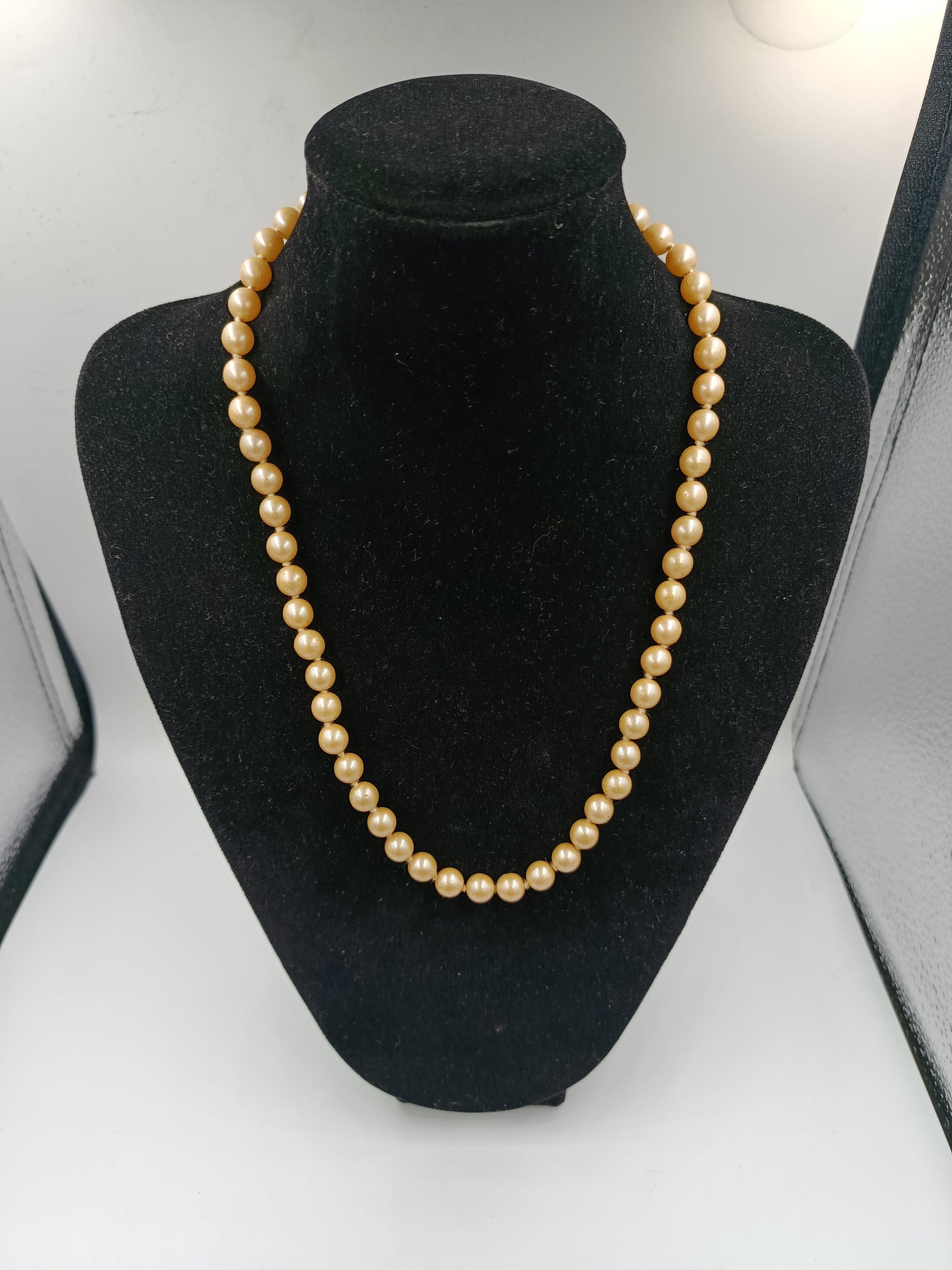 Dieses stilvolle Collier überzeugt durch seine warme Ausstrahlung und den edlen Glanz goldschimmernder Perlen. Gleichmäßig angeordnet und harmonisch aufgezogen, strahlen die Perlen eine klassische Eleganz aus, die sowohl im Alltag als auch zu festlichen Anlässen perfekt zur Geltung kommt.